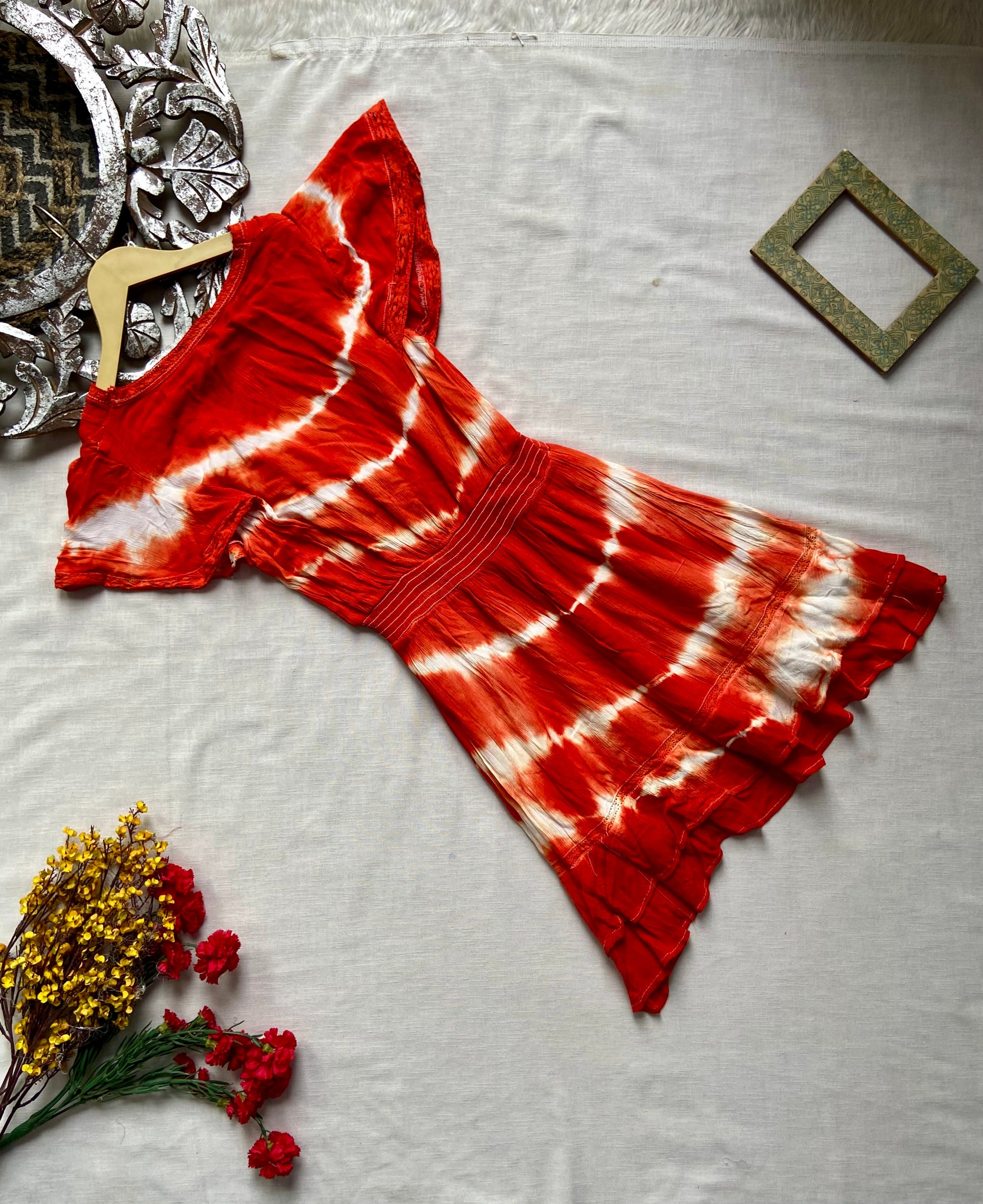 The Sunburst Tie-Dye Flare Dress is a burst of summer energy captured in fabric. Hand-dyed in rich crimson tones with soft white streaks, this breezy silhouette features flutter sleeves, a cinched waist, and an asymmetrical hemline that moves effortlessly with you. Whether you're heading to a beachside brunch or simply chasing sunsets, this piece is your go-to for vibrant, effortless style.