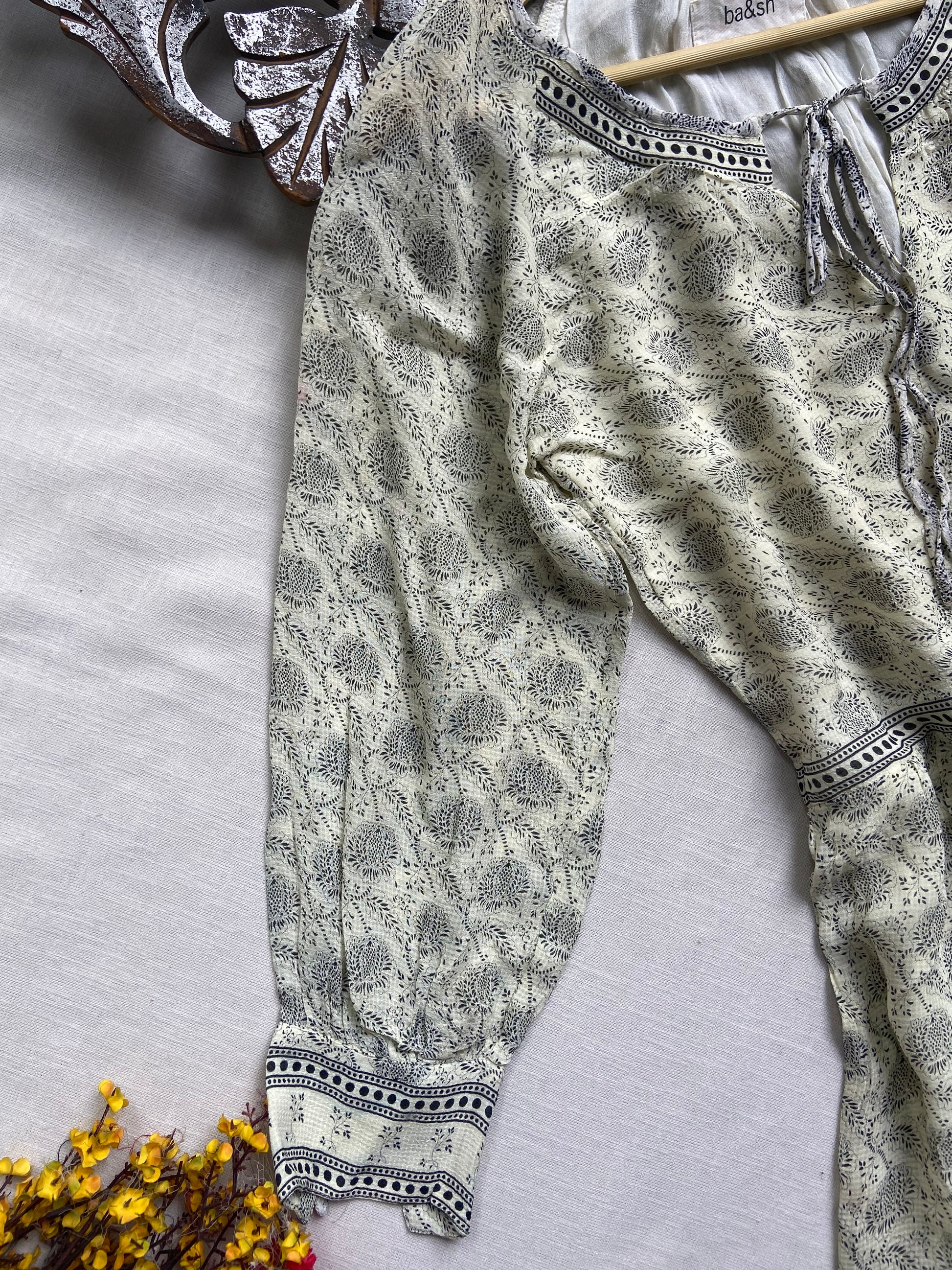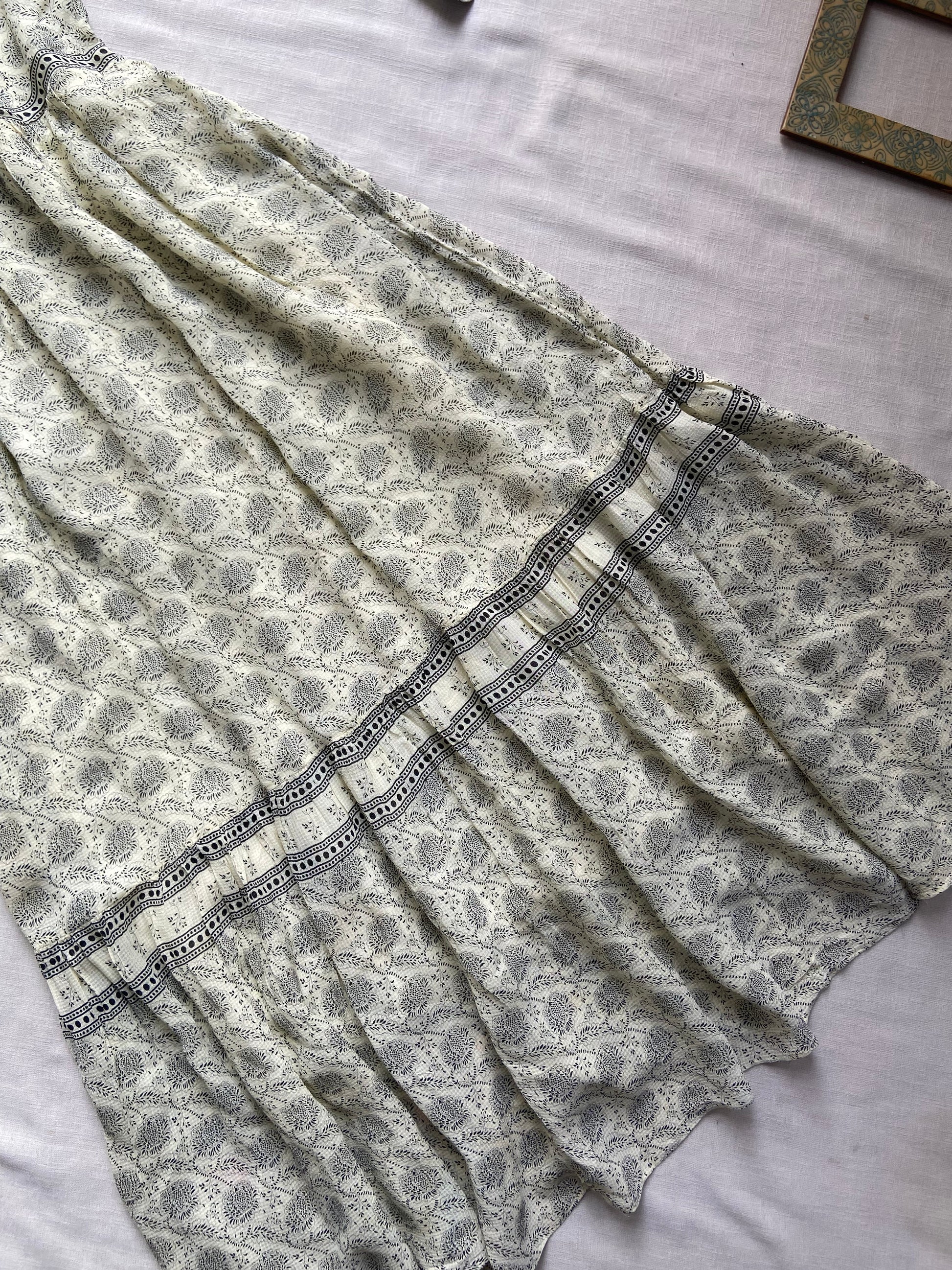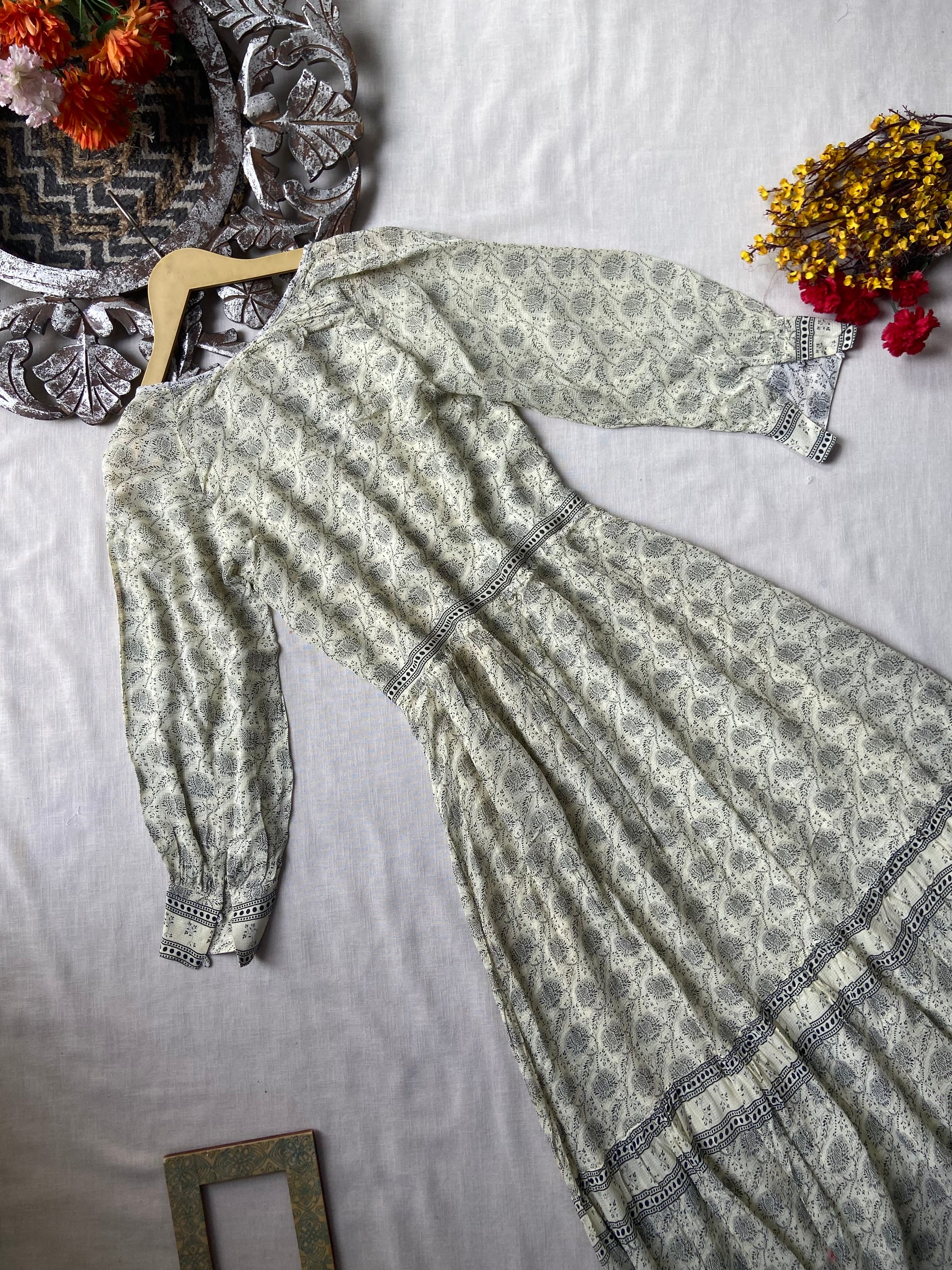 Enhance your boho chic style with our white printed full sleeve a line maxi dress. Made with comfortable materials, this dress is perfect for any occasion. The full sleeves provide coverage while the a line design creates a flattering silhouette. Stay on trend and stylish with this must-have dress.