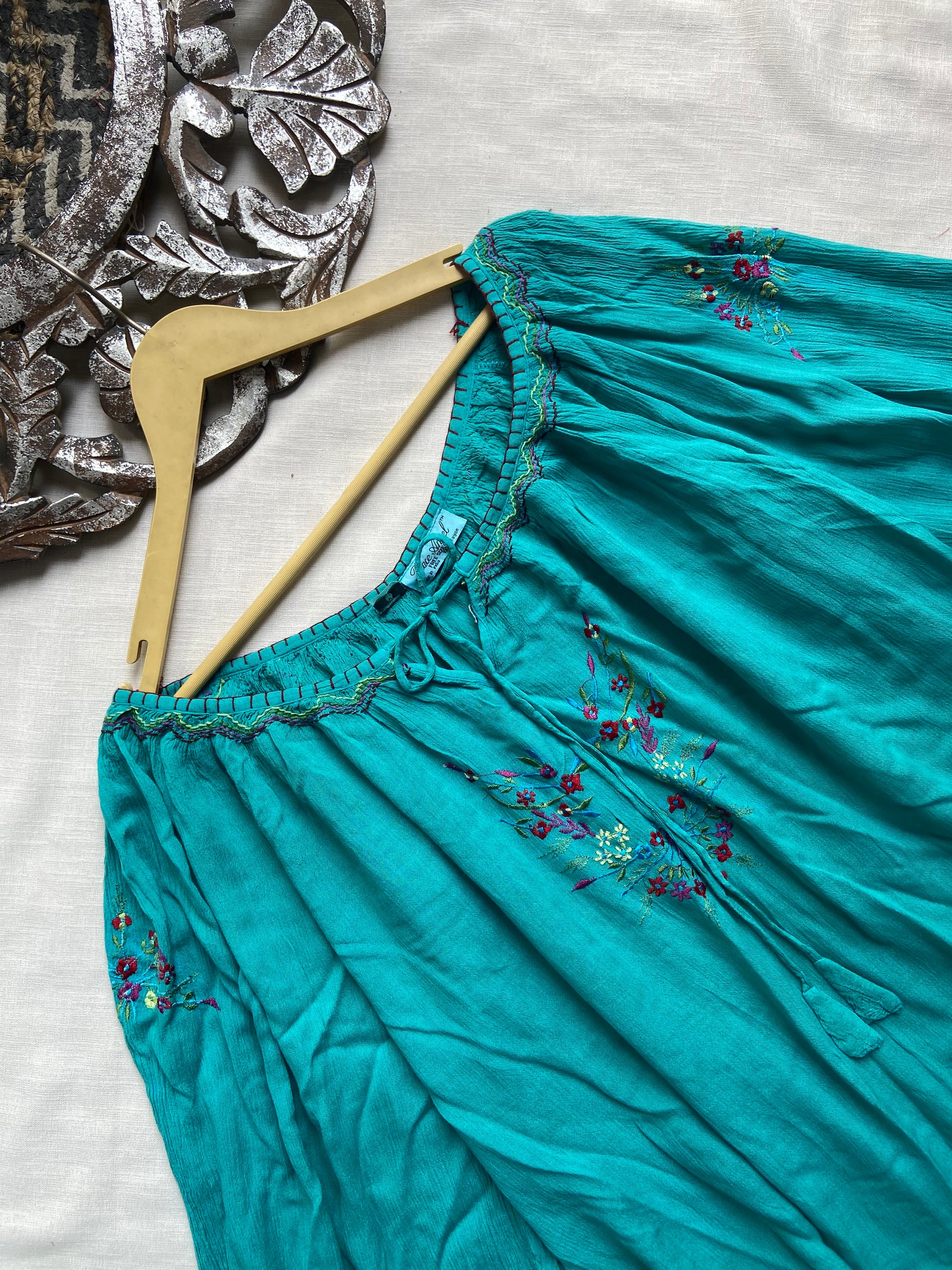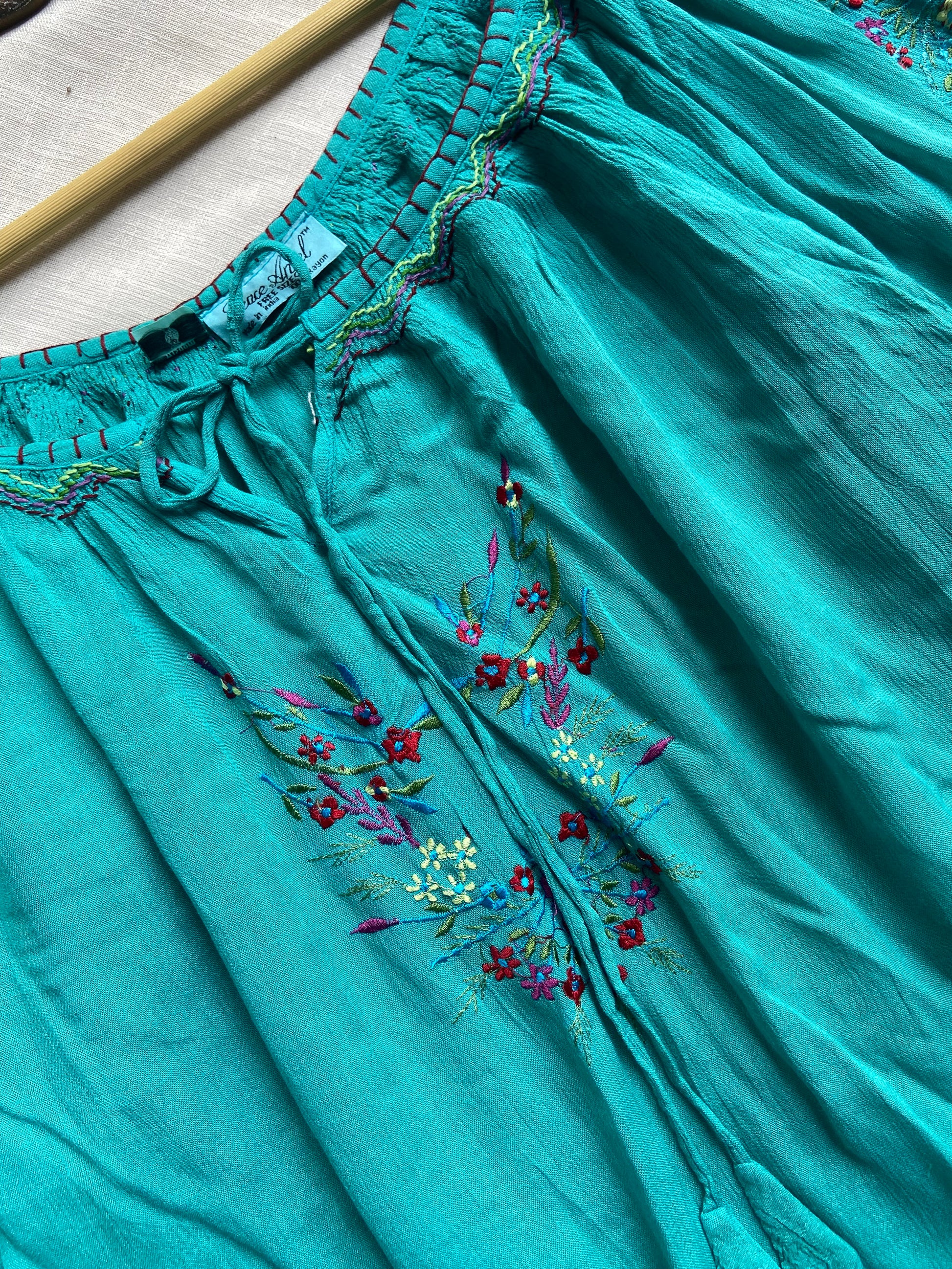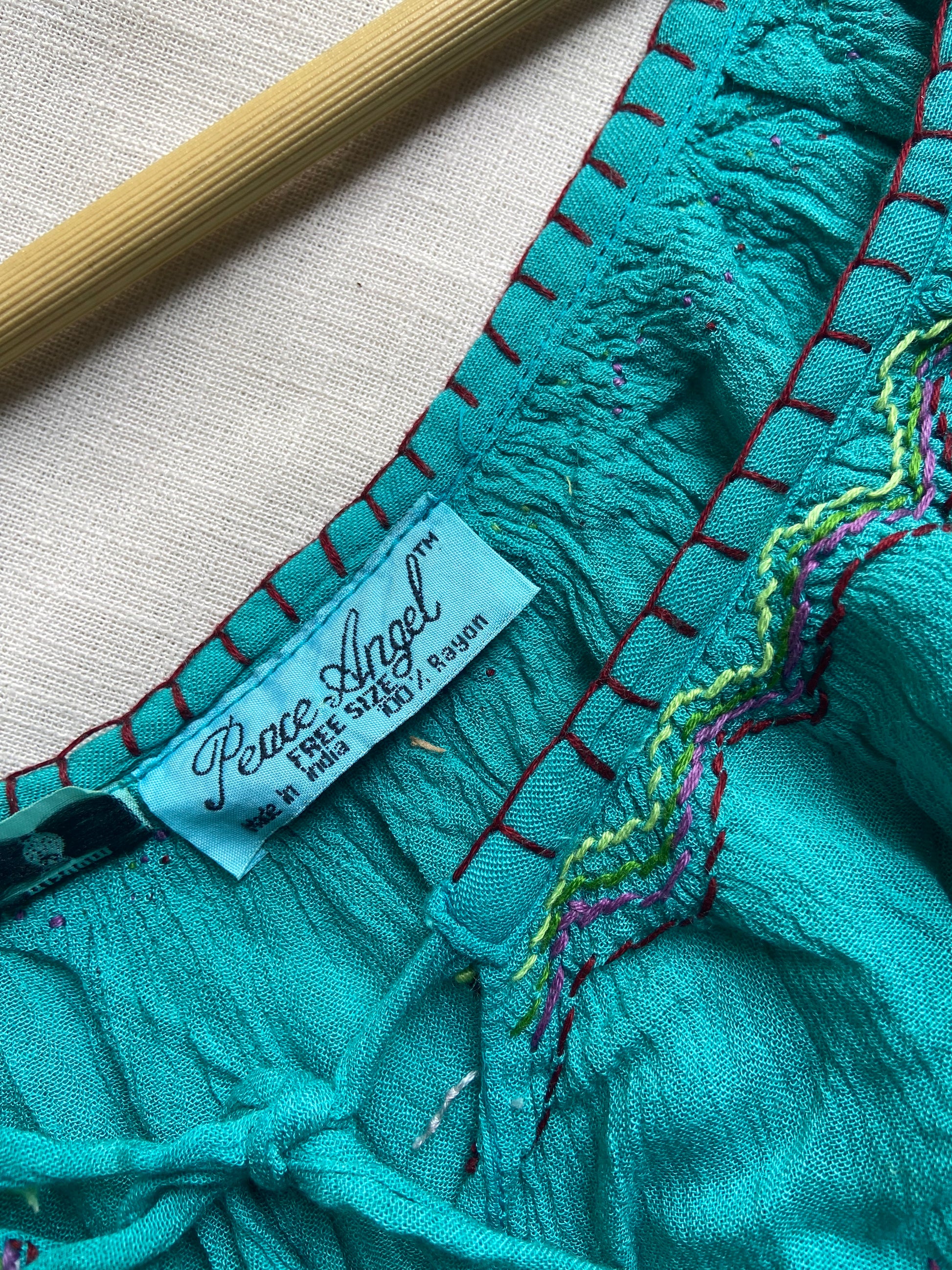 Expertly crafted from soft, lightweight fabric, this sea green boho top features relaxed shoulders for a comfortable and breezy fit. Its elegant and flowy design is perfect for any casual or dressy occasion. Add this versatile piece to your wardrobe for effortless style and comfort.