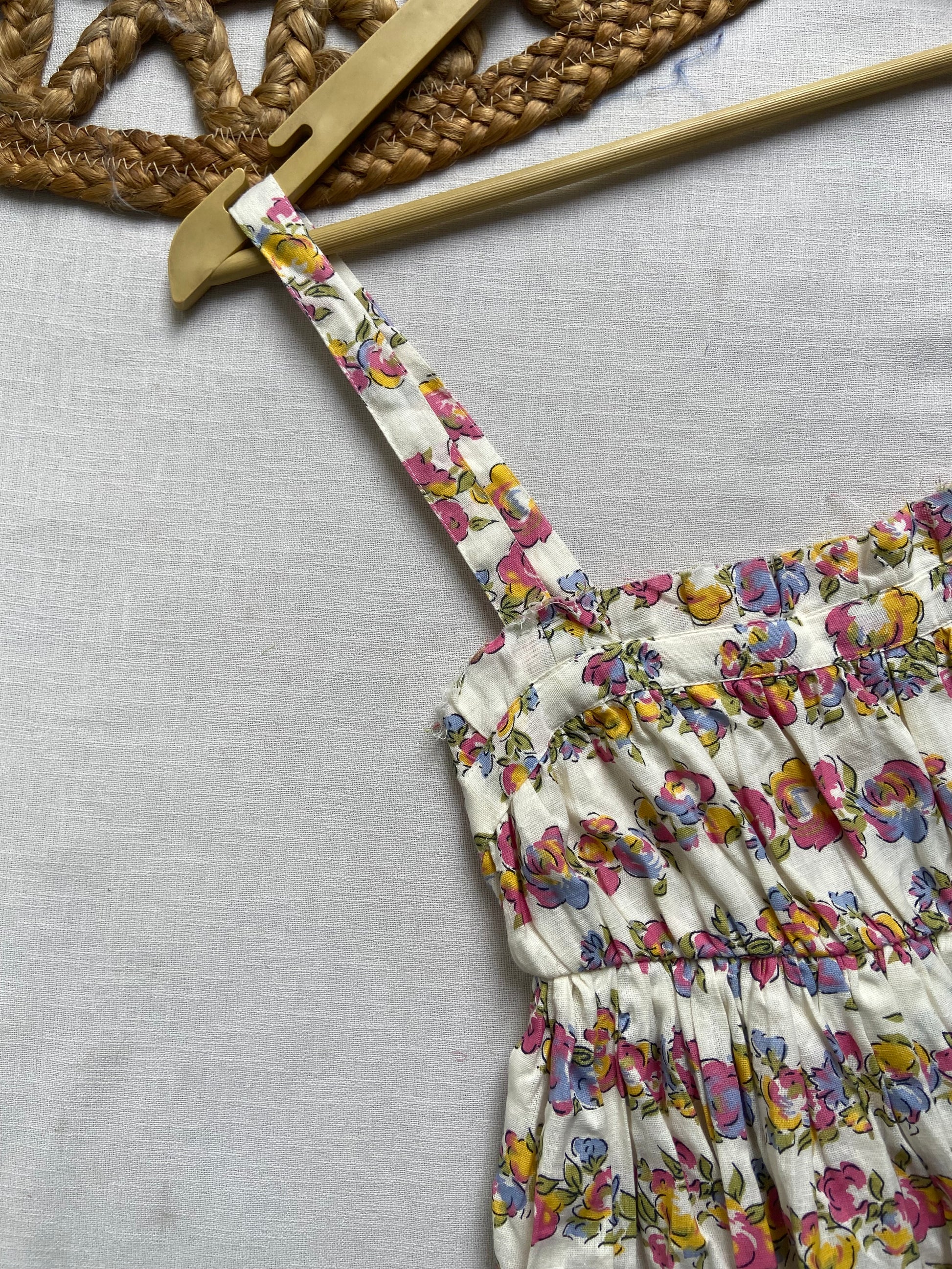 This ASOS A-line flared midi beach dress in white features a delicate floral print and a stylish strap pattern, crafted from breathable cotton fabric for all-day comfort. Its tiered design enhances movement and adds a feminine silhouette, making it ideal for warm-weather outings. Best styled with sandals and a wide-brim hat, this size small dress is perfect for beach days or casual summer gatherings.