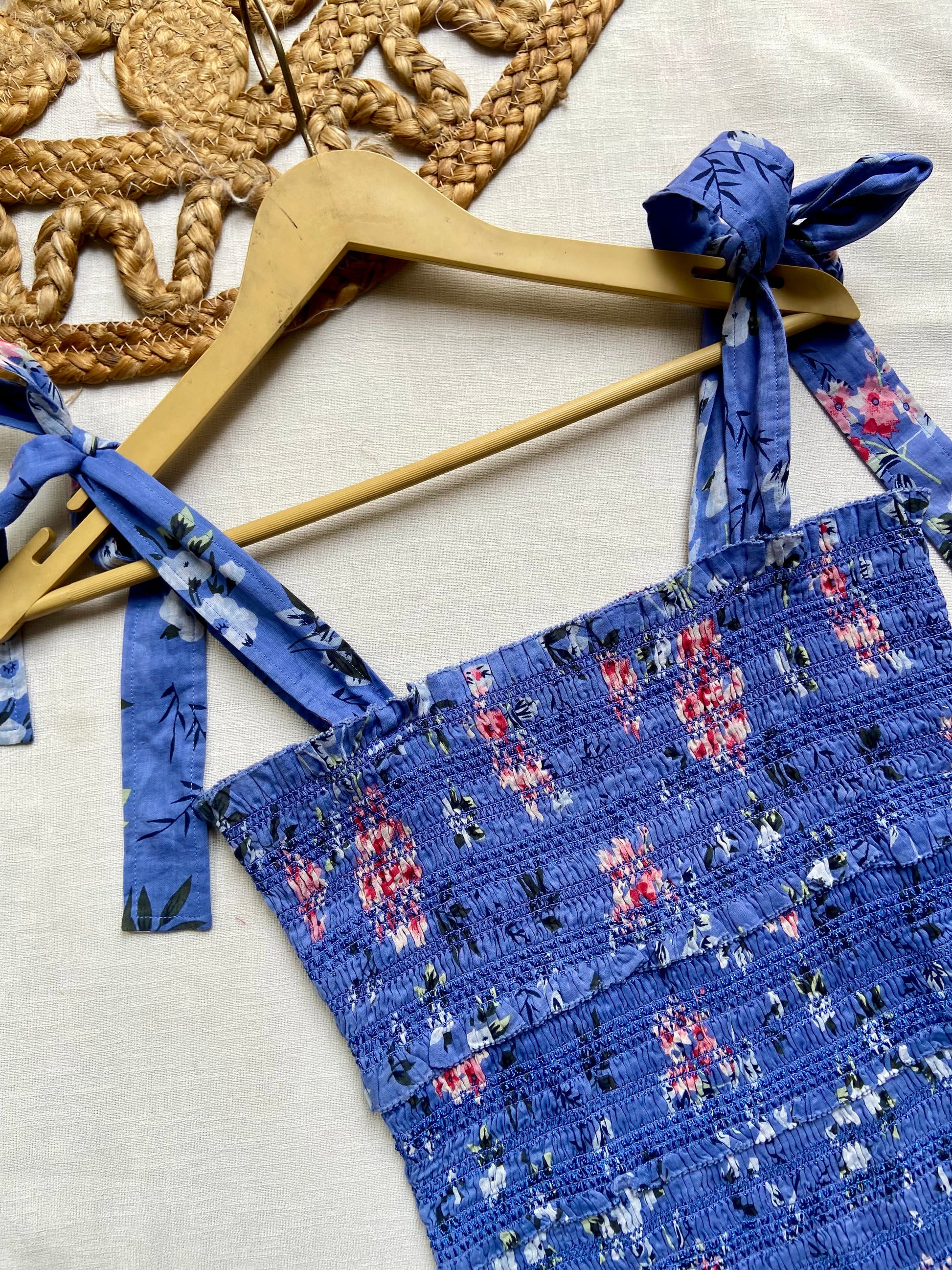 This size S Blue Floral Smocked Mini Dress features a strap pattern and a vibrant blue floral print on soft cotton viscose fabric. Fully smocked for a flattering bodycon fit, it highlights your silhouette while peplum detailing at the hem adds a stylish, feminine flair. Perfect for both casual and dressy occasions, this dress combines comfort with contemporary design.