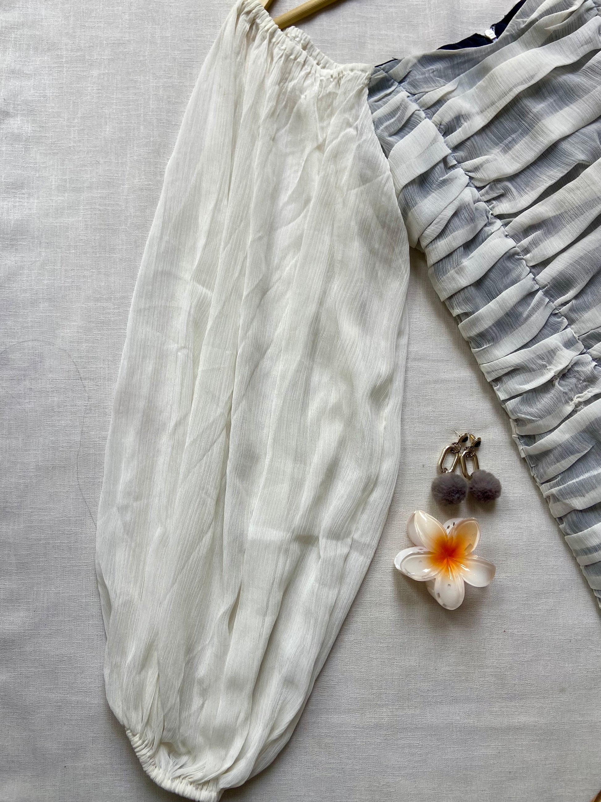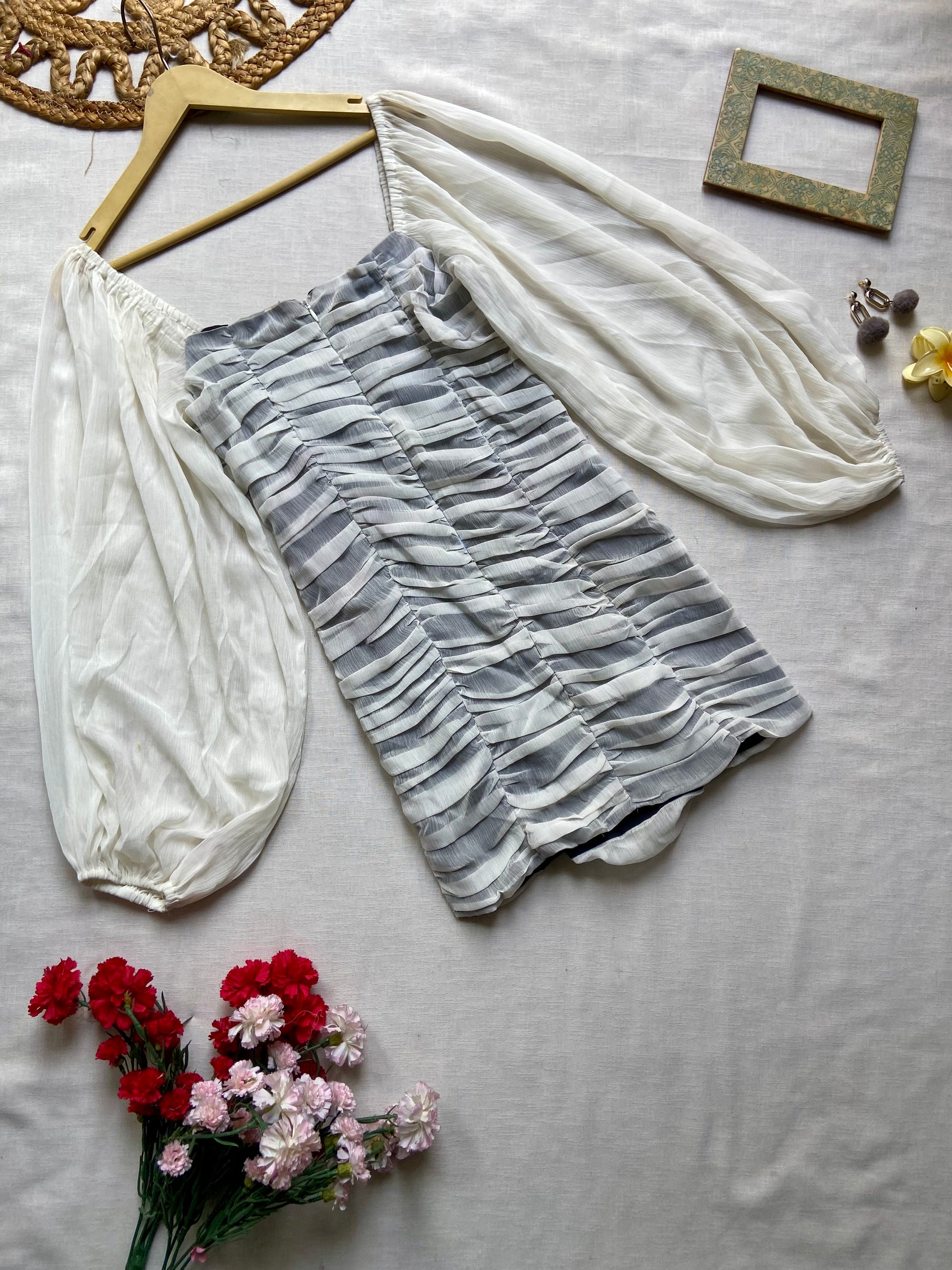 This grey bodycon mini dress is crafted from soft viscose fabric, featuring full puff sleeves and a ruched design that enhances the silhouette. The sweetheart neckline adds a touch of elegance, making it a sophisticated choice for evening events or stylish gatherings.