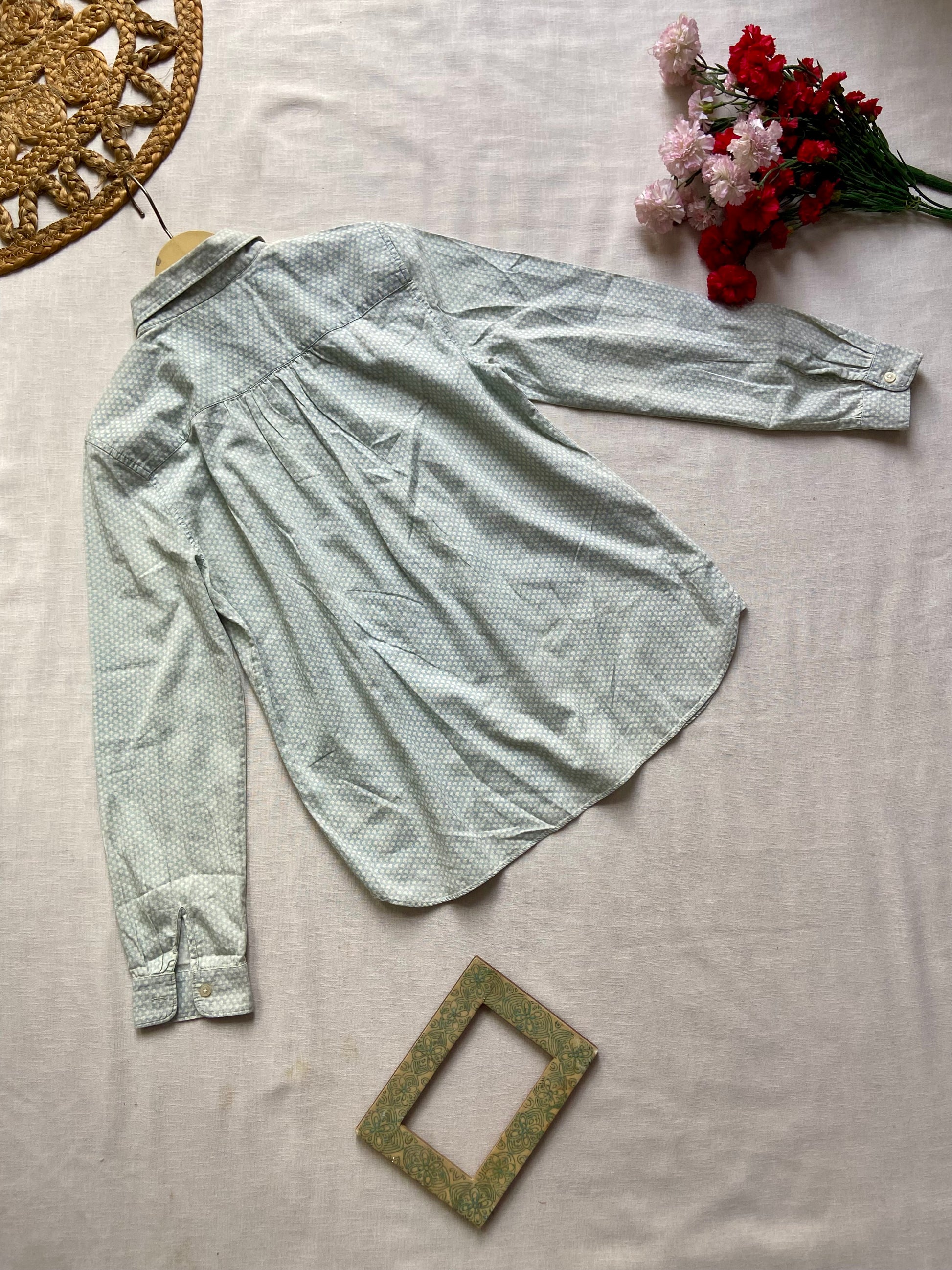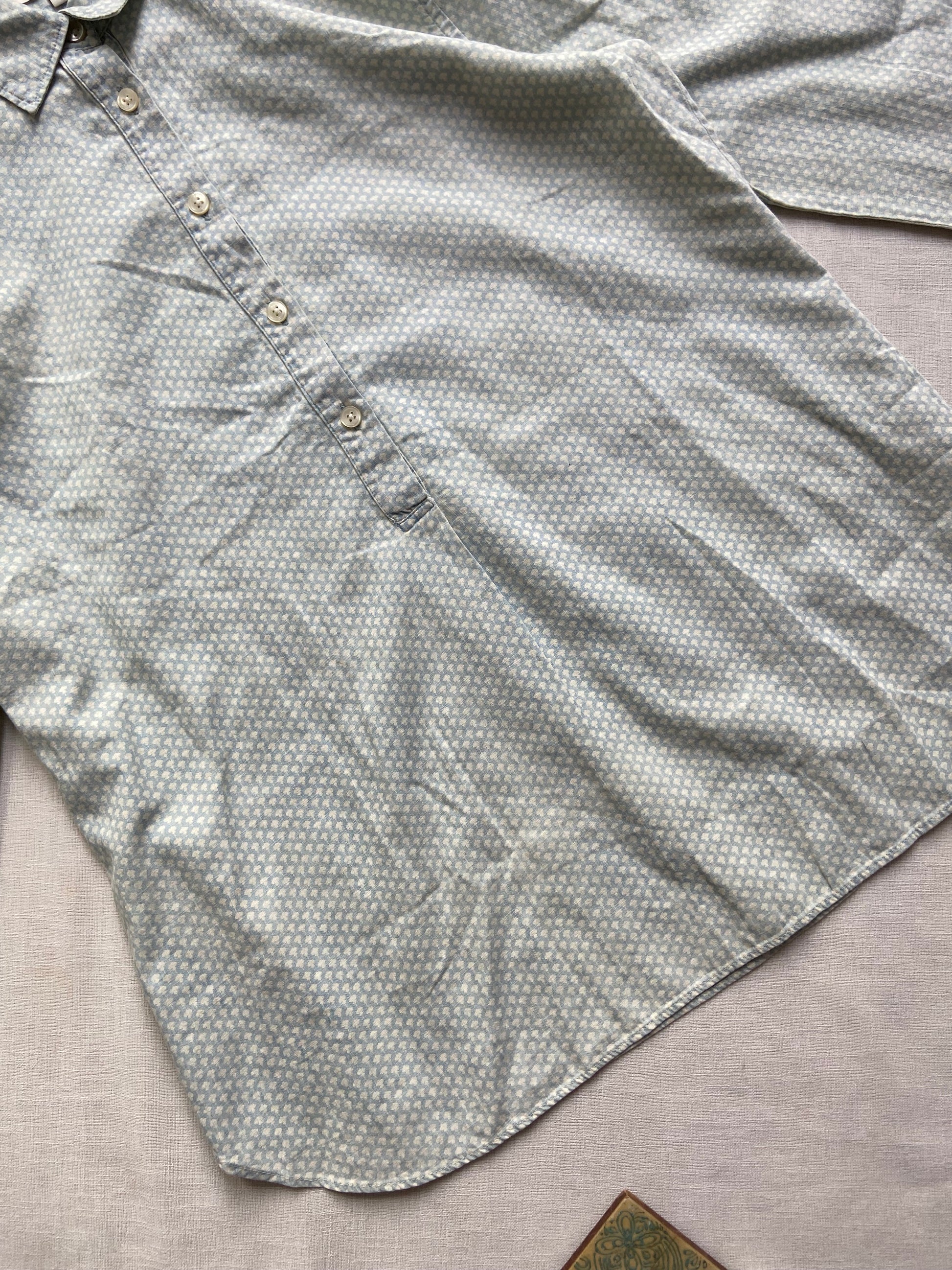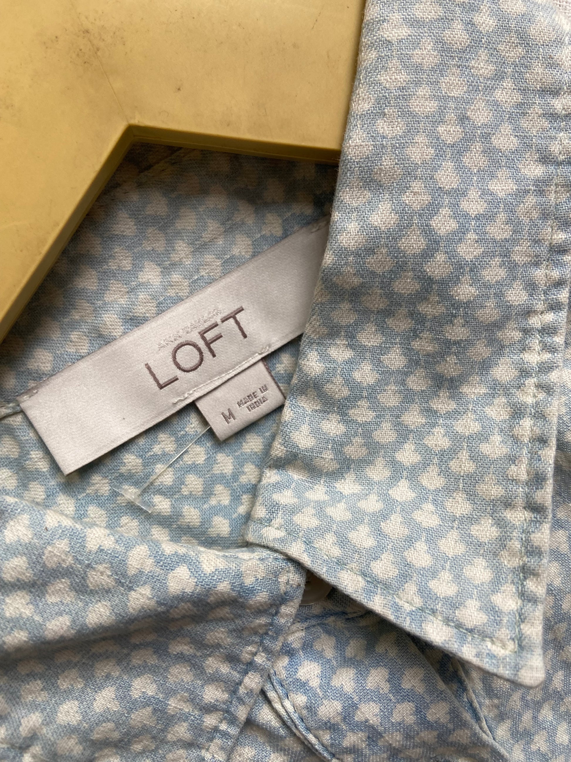 This LOFT ice blue and white printed shirt top in size M features a classic collar, full sleeves, and a regular fit with medium length, crafted from breathable cotton fabric. Best suited for office wear or smart-casual occasions, it pairs well with tailored trousers or jeans and minimalist accessories for a polished, versatile look.