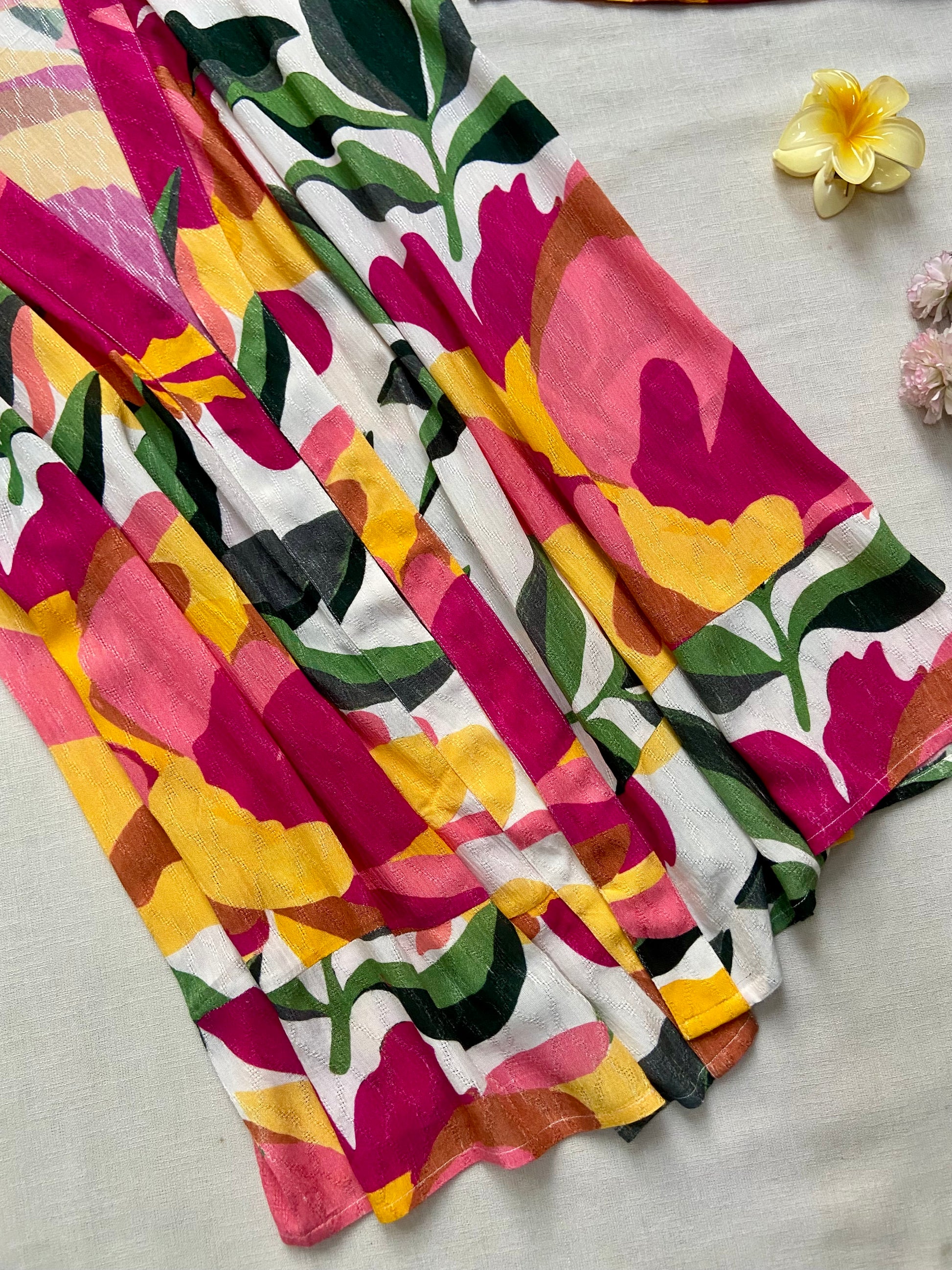 The Multicolor Floral Cover Up offers a vibrant and elegant way to enhance your outfit. Featuring a lively floral pattern, this cover-up adds a splash of color and sophistication to any look. Crafted with lightweight fabric, it provides comfortable coverage while maintaining breathability, making it ideal for layering over swimwear or casual attire. Its versatile design allows for effortless styling, perfect for both beach days and casual outings. This piece combines fashion and function, delivering a refined yet relaxed aesthetic.