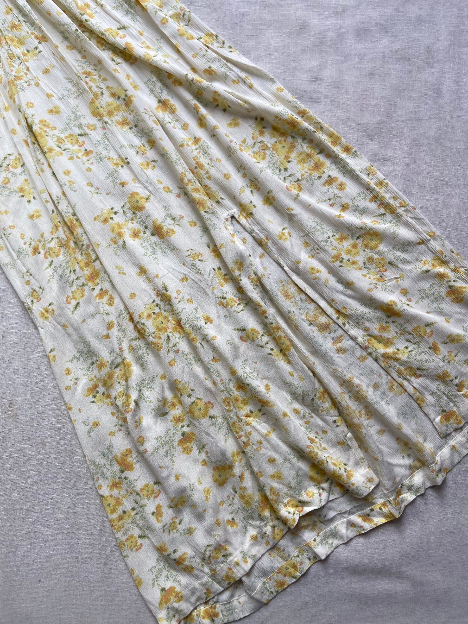 This Oneill off-white and yellow floral maxi dress in size small features a sweetheart neckline and short sleeves, crafted from a breathable cotton viscose blend. Its flowing silhouette offers comfort and elegance. Best suited for garden parties or summer events, it pairs beautifully with strappy sandals and subtle gold jewelry for a refined, seasonal look.