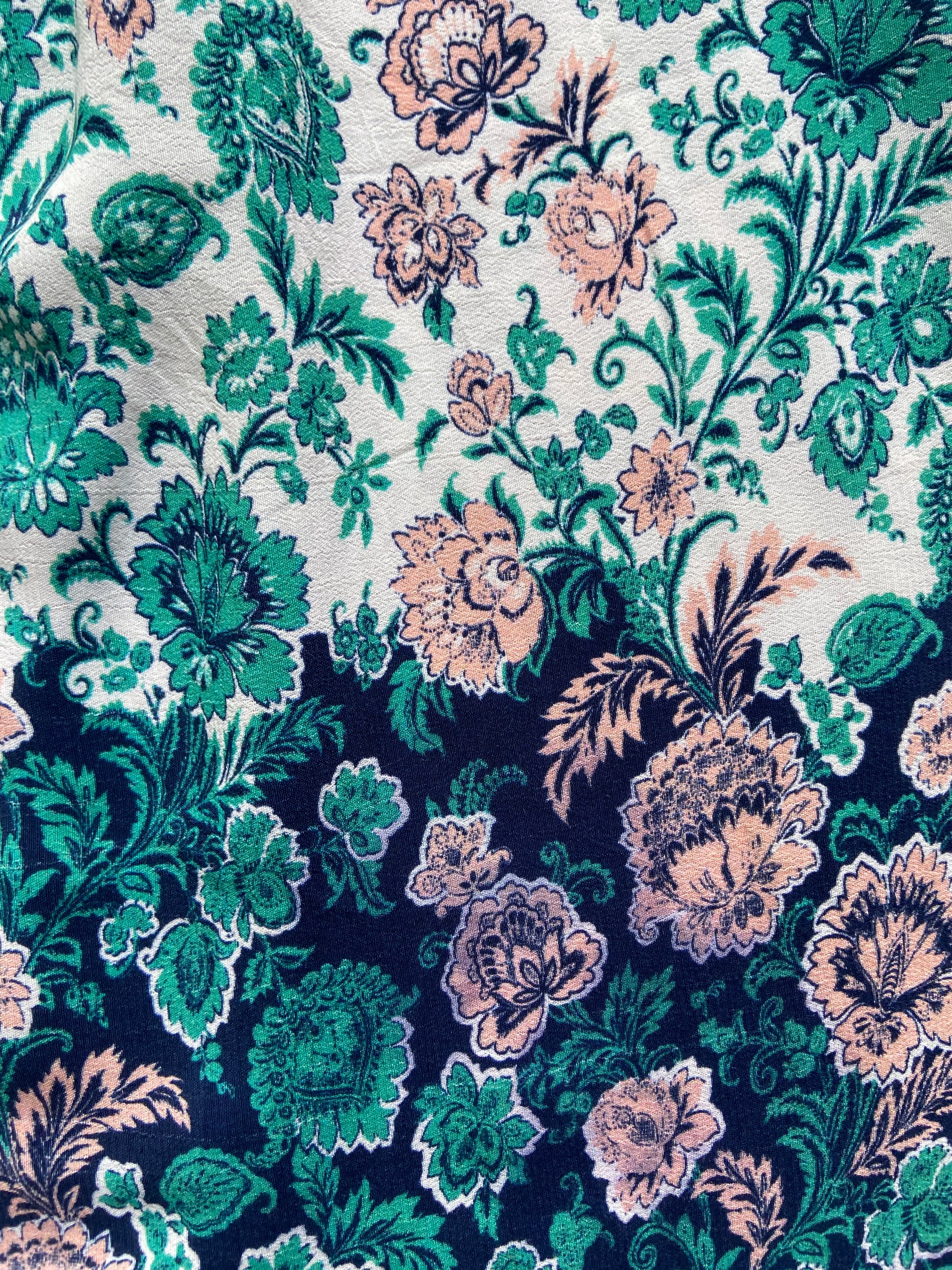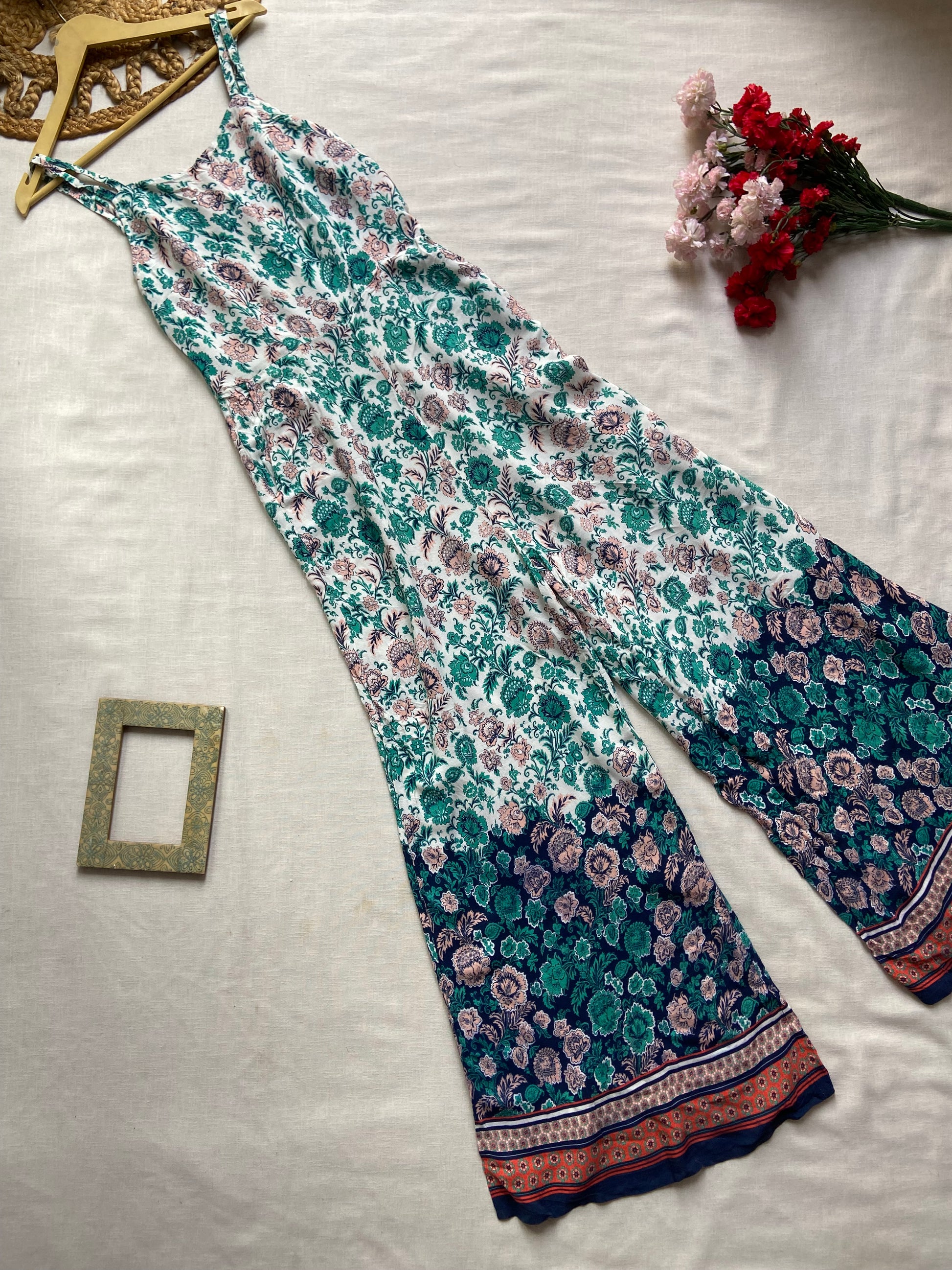 This boho floral jumpsuit in size S is crafted from a soft cotton viscose blend, offering both comfort and breathability. Its strap pattern and sleeveless design enhance ease of movement, while the back smocked detail ensures a flexible, flattering fit. Perfect for casual or festive occasions, this jumpsuit combines relaxed style with a touch of bohemian charm.