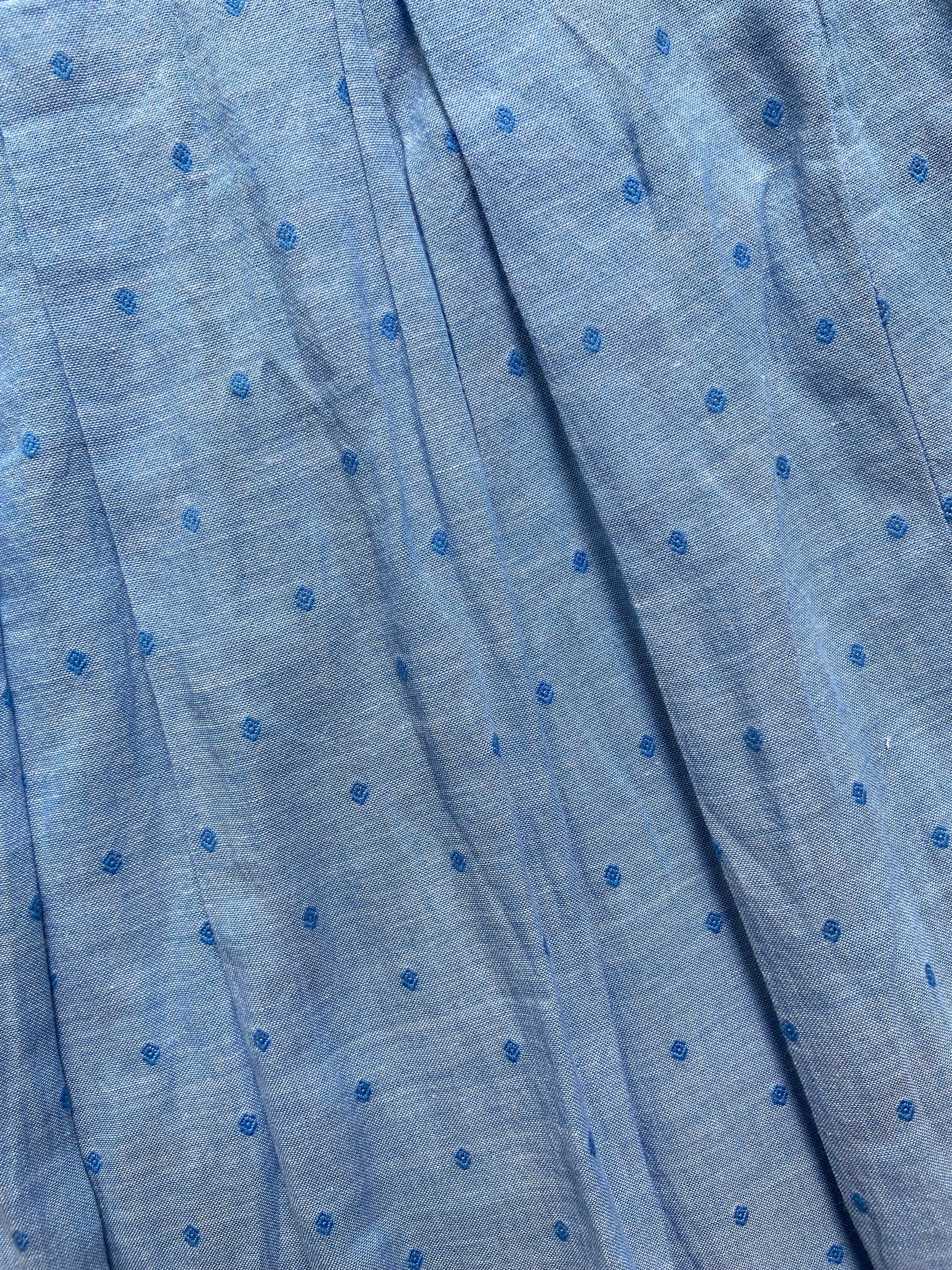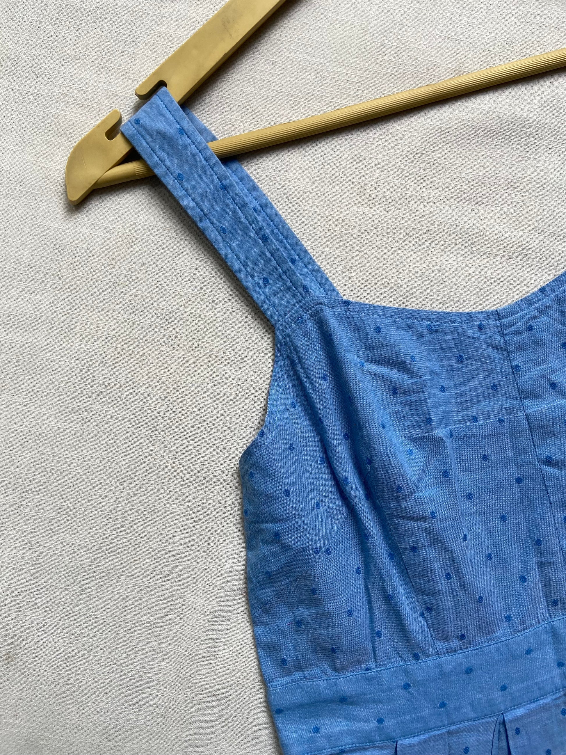 This blue strap mini dress, crafted from breathable cotton fabric, features an A-line flared silhouette with delicate pleating below the yoke for subtle texture and movement. Designed in size XS, it offers a flattering fit that enhances your natural shape. Ideal for warm weather, it pairs effortlessly with sandals or sneakers for a casual look, or dressed up with heels and a light jacket for evening occasions. Its versatile style makes it a smart addition to any wardrobe seeking comfort and understated elegance.