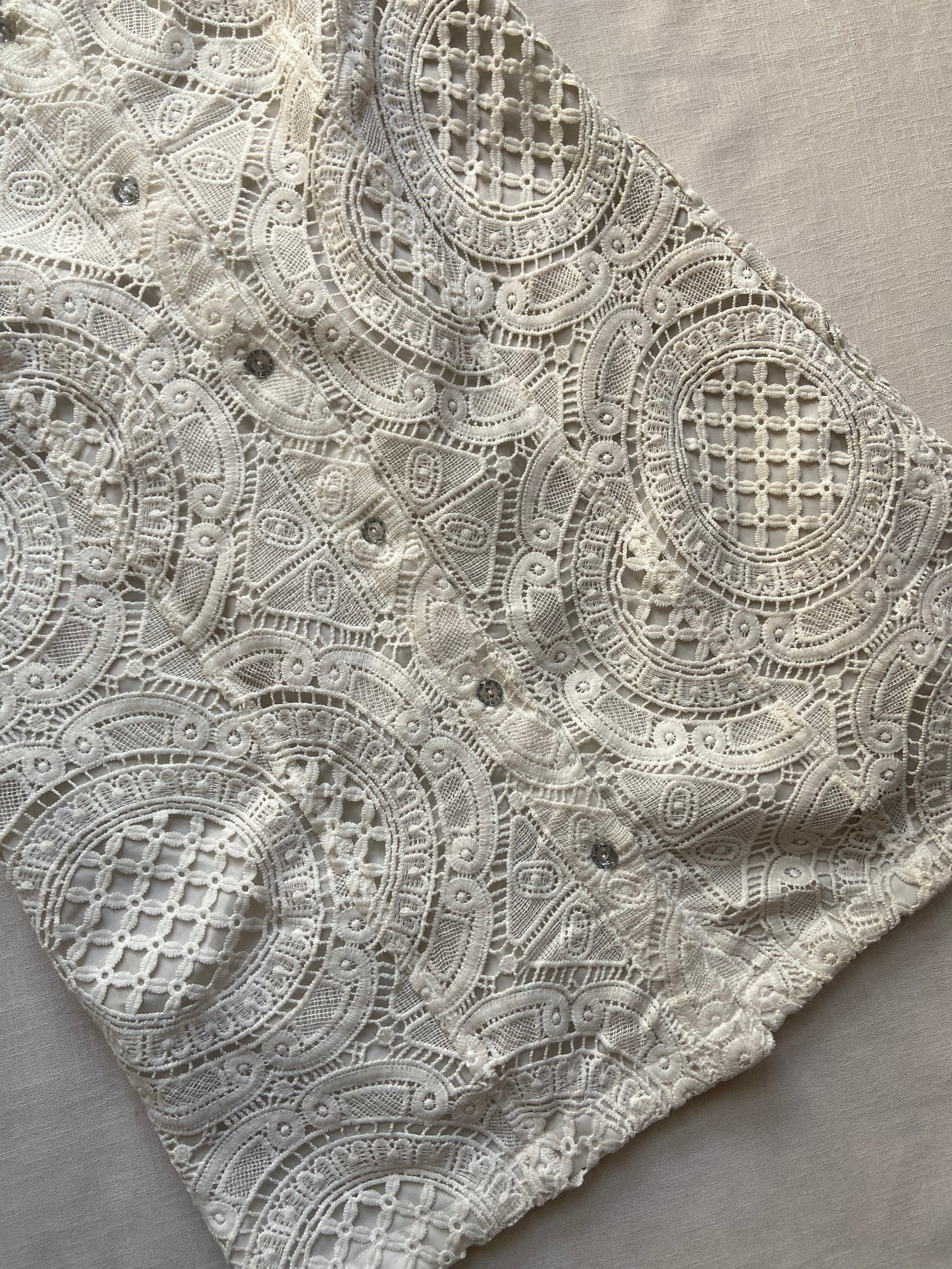 This White Hacoba Button Down Mini Dress features delicate chikan cut work on breathable hacoba fabric, crafted from a comfortable cotton blend. Designed with quarter sleeves and a flattering sweetheart neckline, it offers a refined yet effortless look. Ideal for casual outings or summer gatherings, this size M dress pairs beautifully with minimalist sandals or classic white sneakers for a chic, expert-styled ensemble.