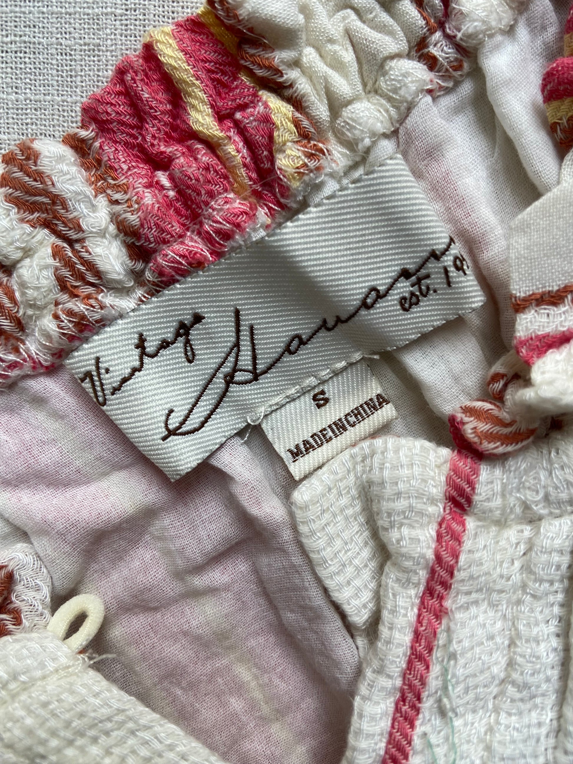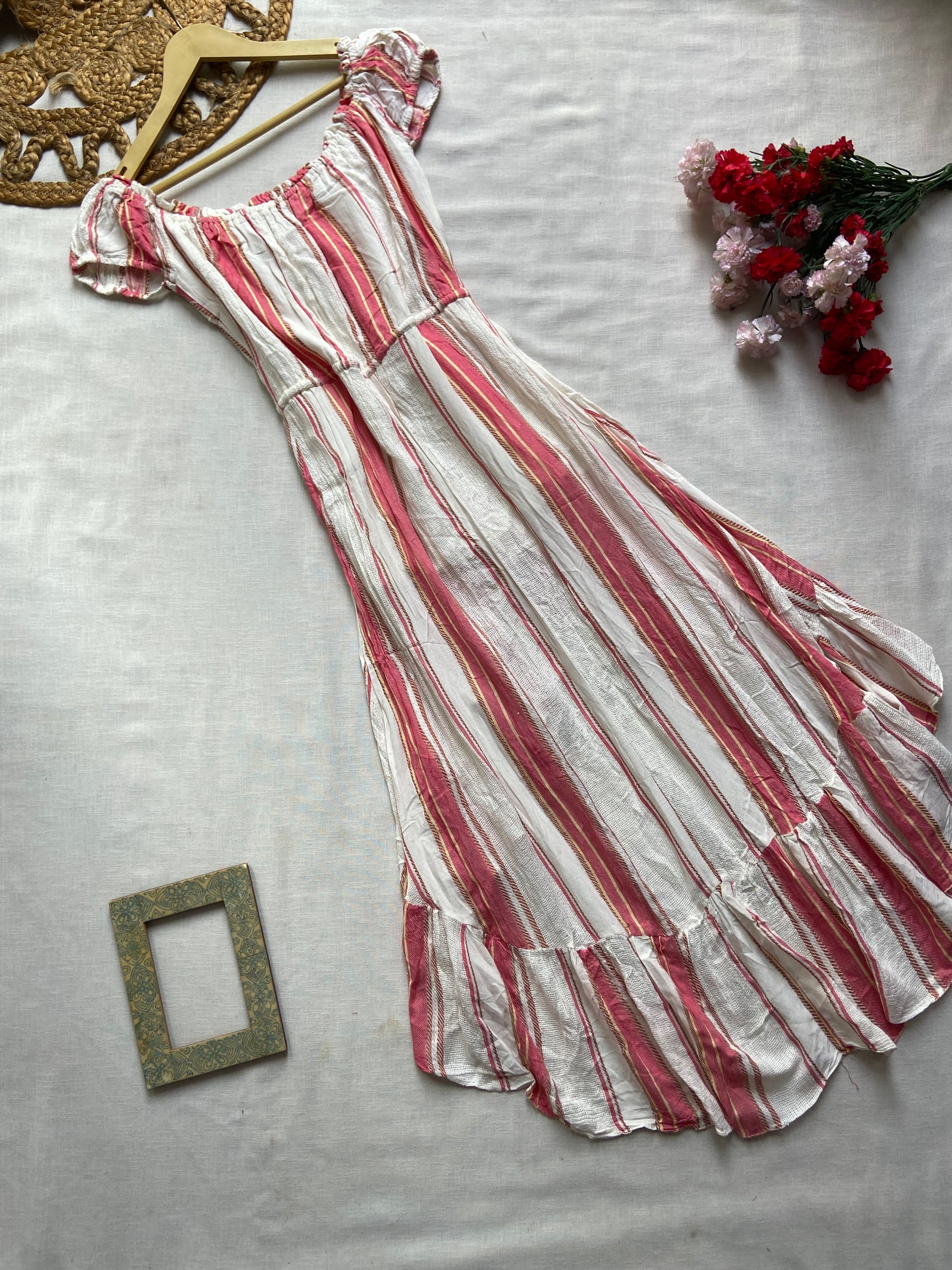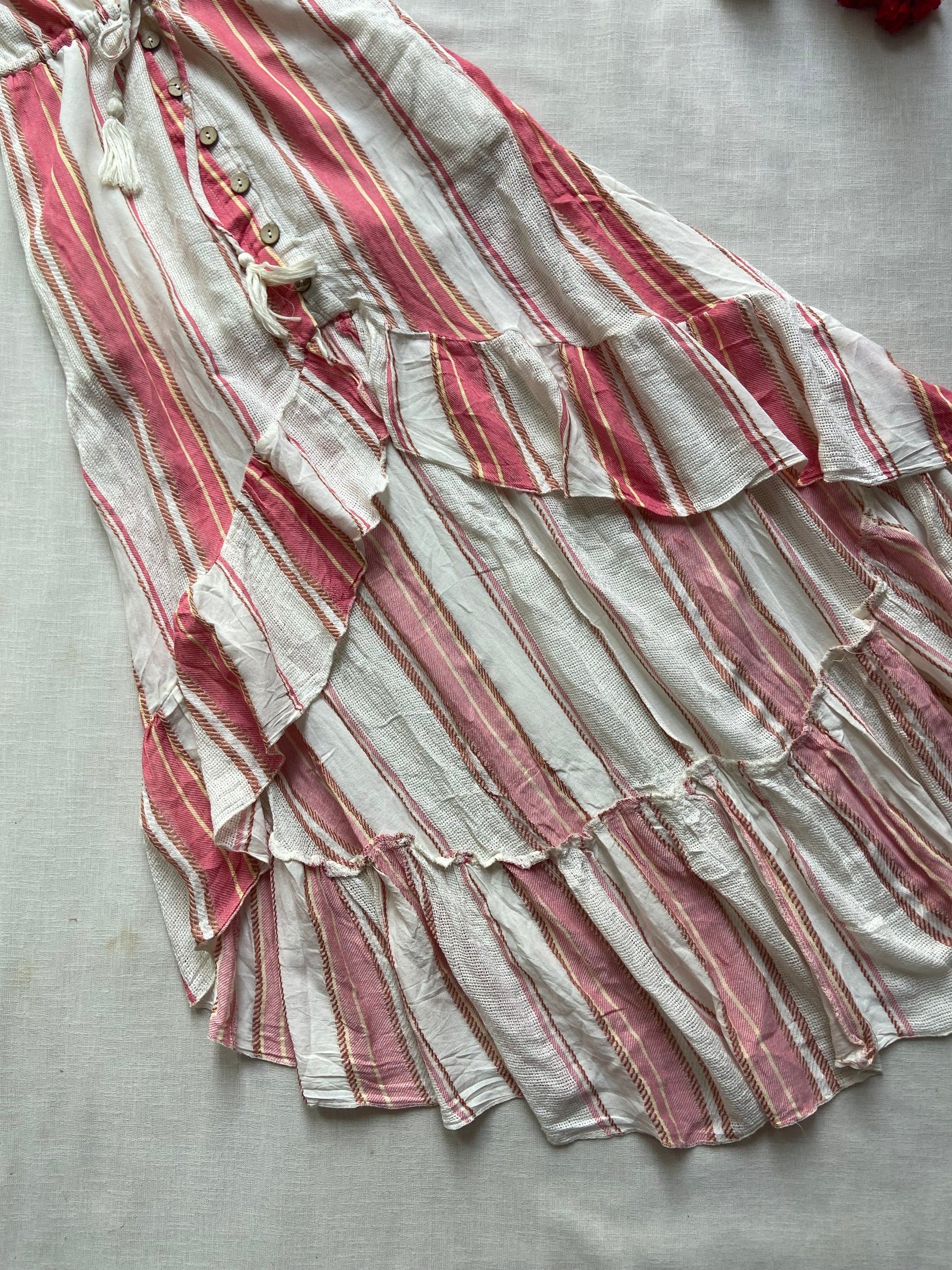 This red and white striped high-low midi dress features a button-down front and short quarter sleeves, crafted from a comfortable cotton viscose blend. Designed in a size small, its breathable fabric and flattering silhouette make it ideal for both casual and semi-formal occasions. Pair it with sleek sandals or ankle boots to complete a polished, stylish look.