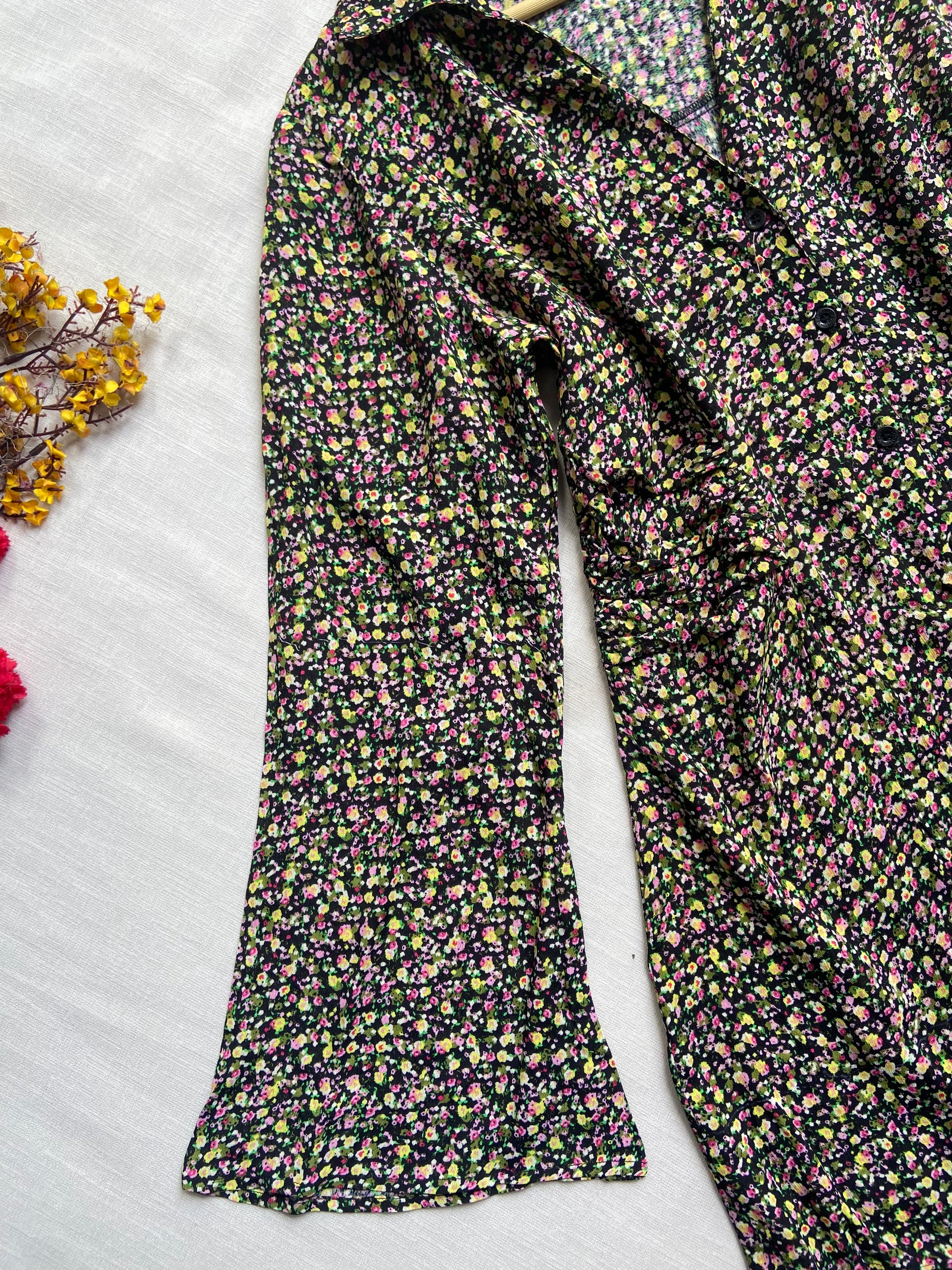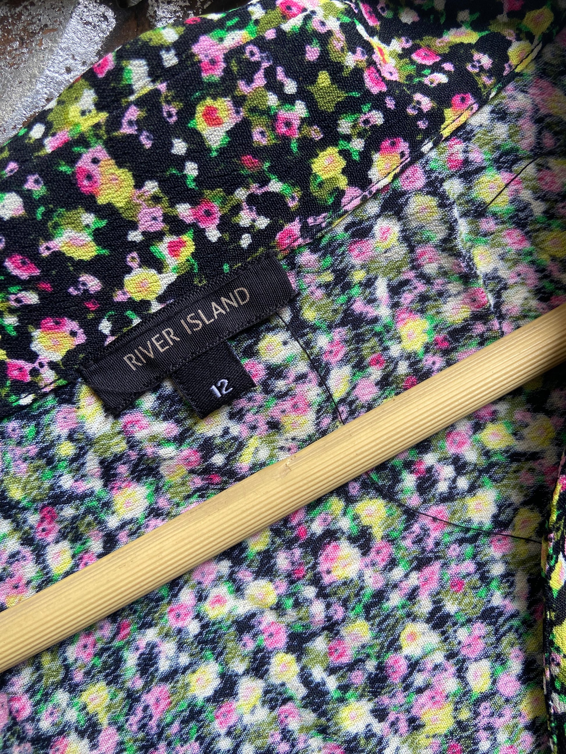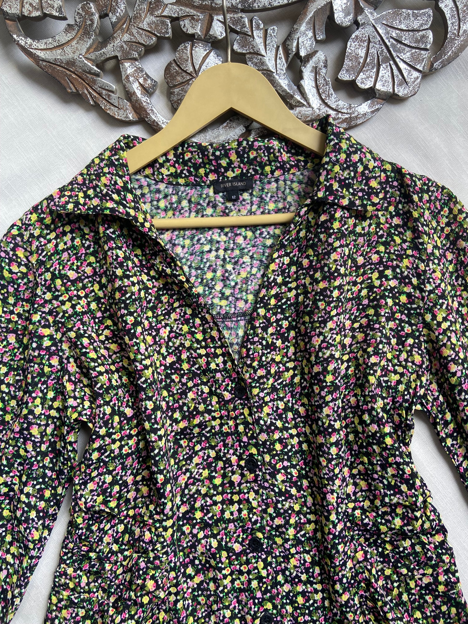 This black floral mini dress from River Island features a V-neck with a collared design and full sleeves, crafted from a comfortable viscose blend fabric. Its A-line flared silhouette in size L offers a flattering fit that moves gracefully. Perfect for both day and evening occasions, this dress pairs well with heels or ankle boots to create a polished, versatile look.