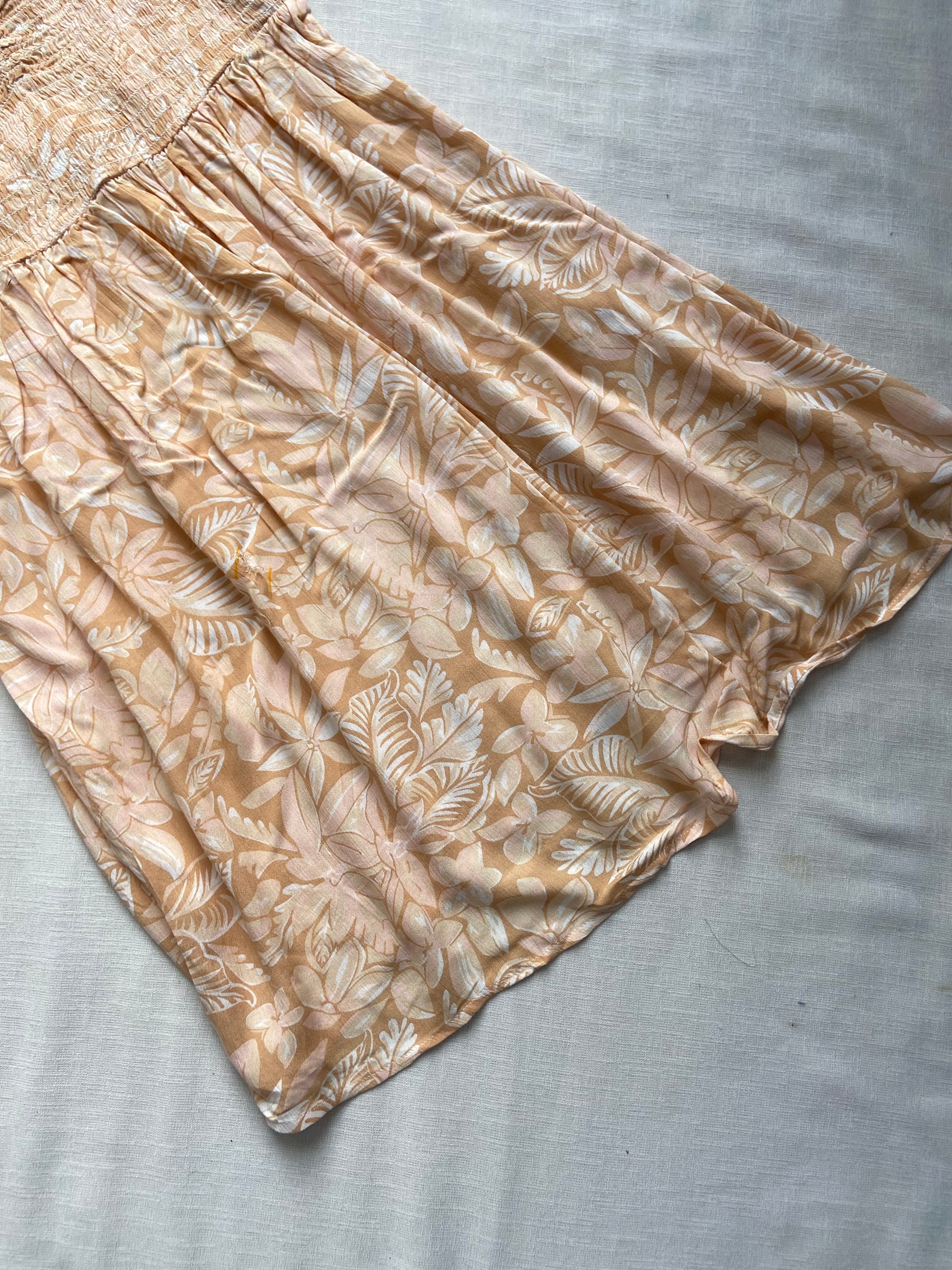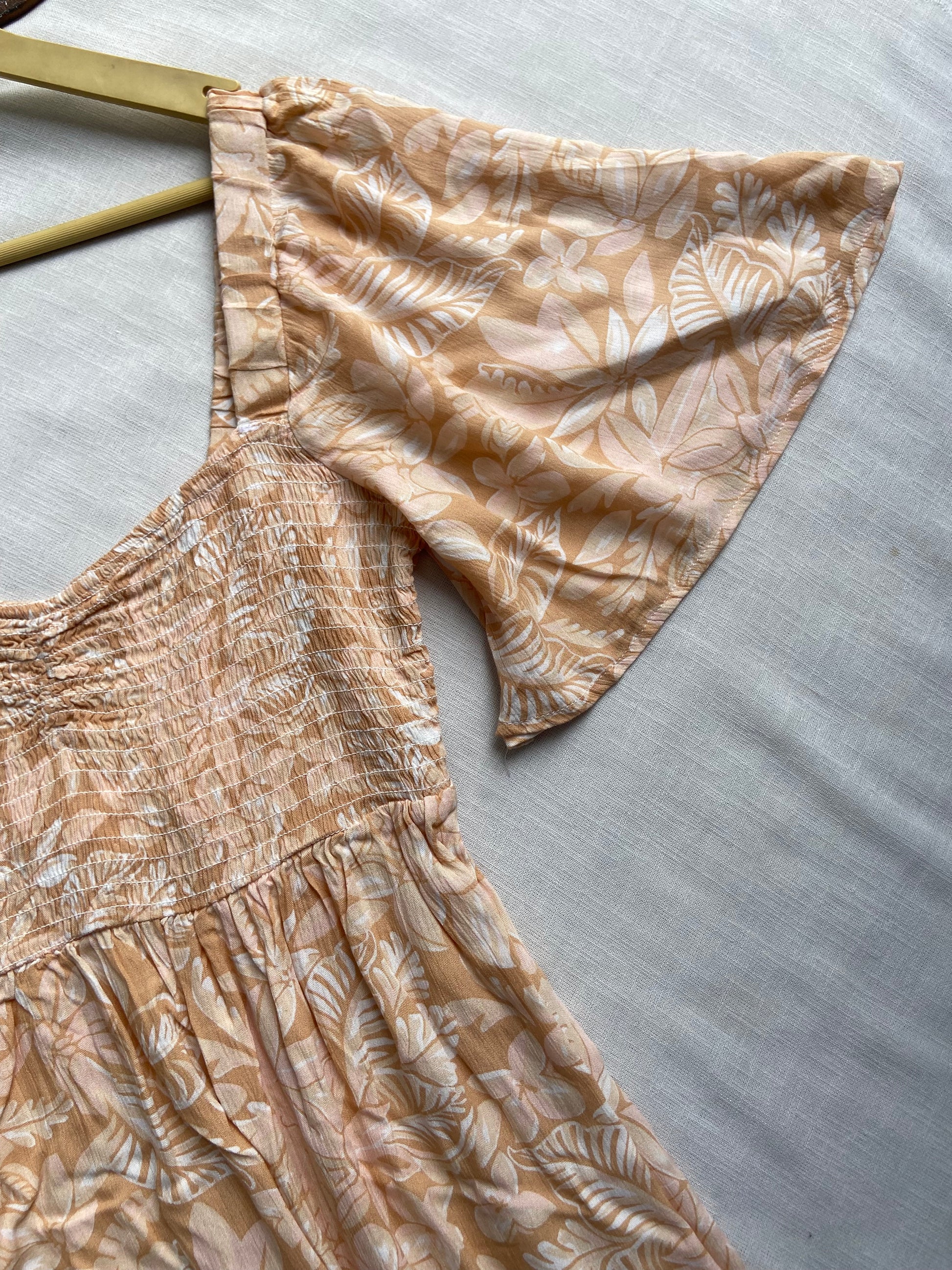This beige mini dress features a sweetheart neckline and a semi-backless design, crafted from soft cotton viscose fabric for breathable comfort. Its loose-fit quarter sleeves and delicate floral print enhance its relaxed yet elegant style. Designed in size M, this dress offers a flattering silhouette perfect for warm weather occasions.