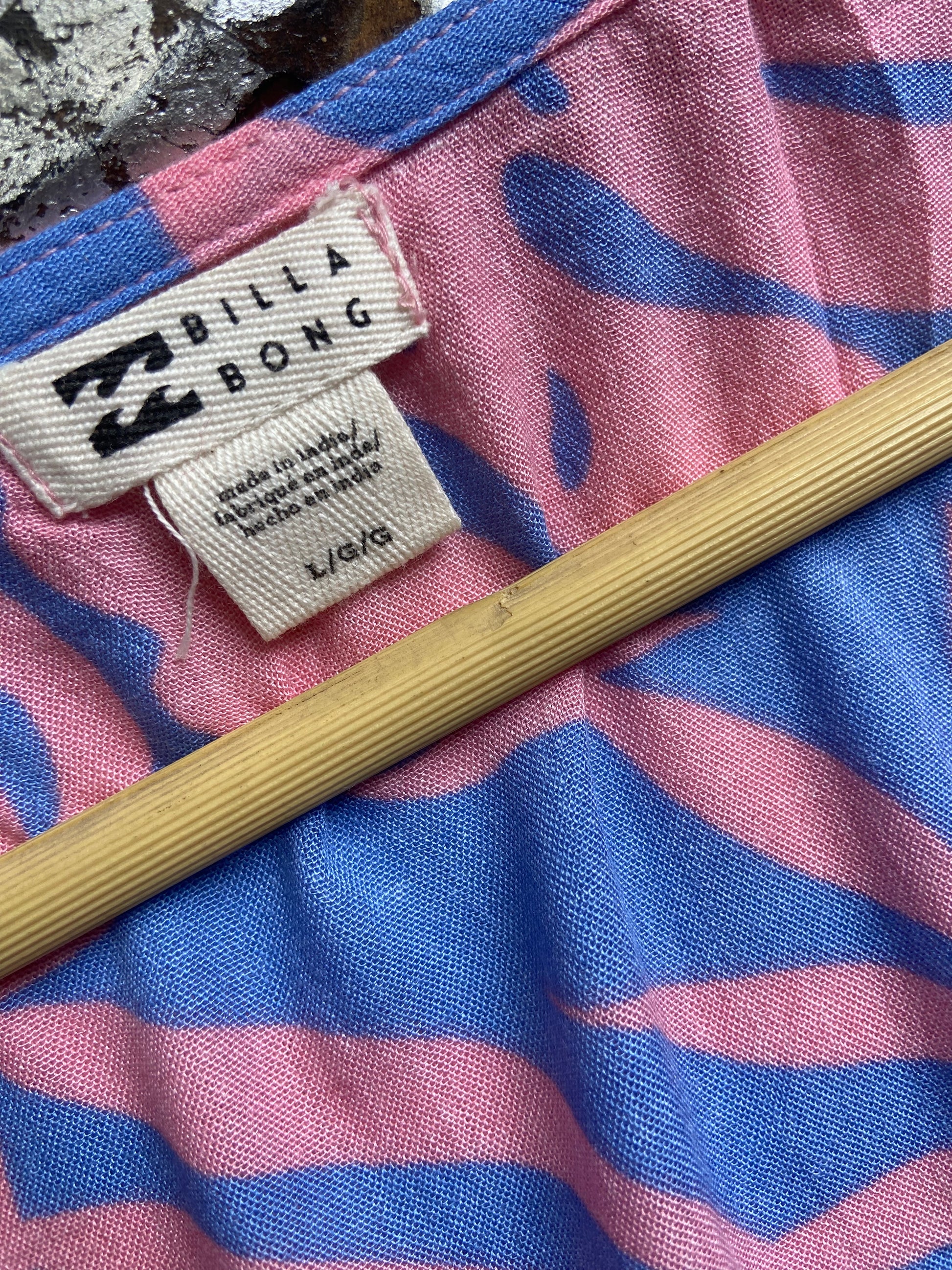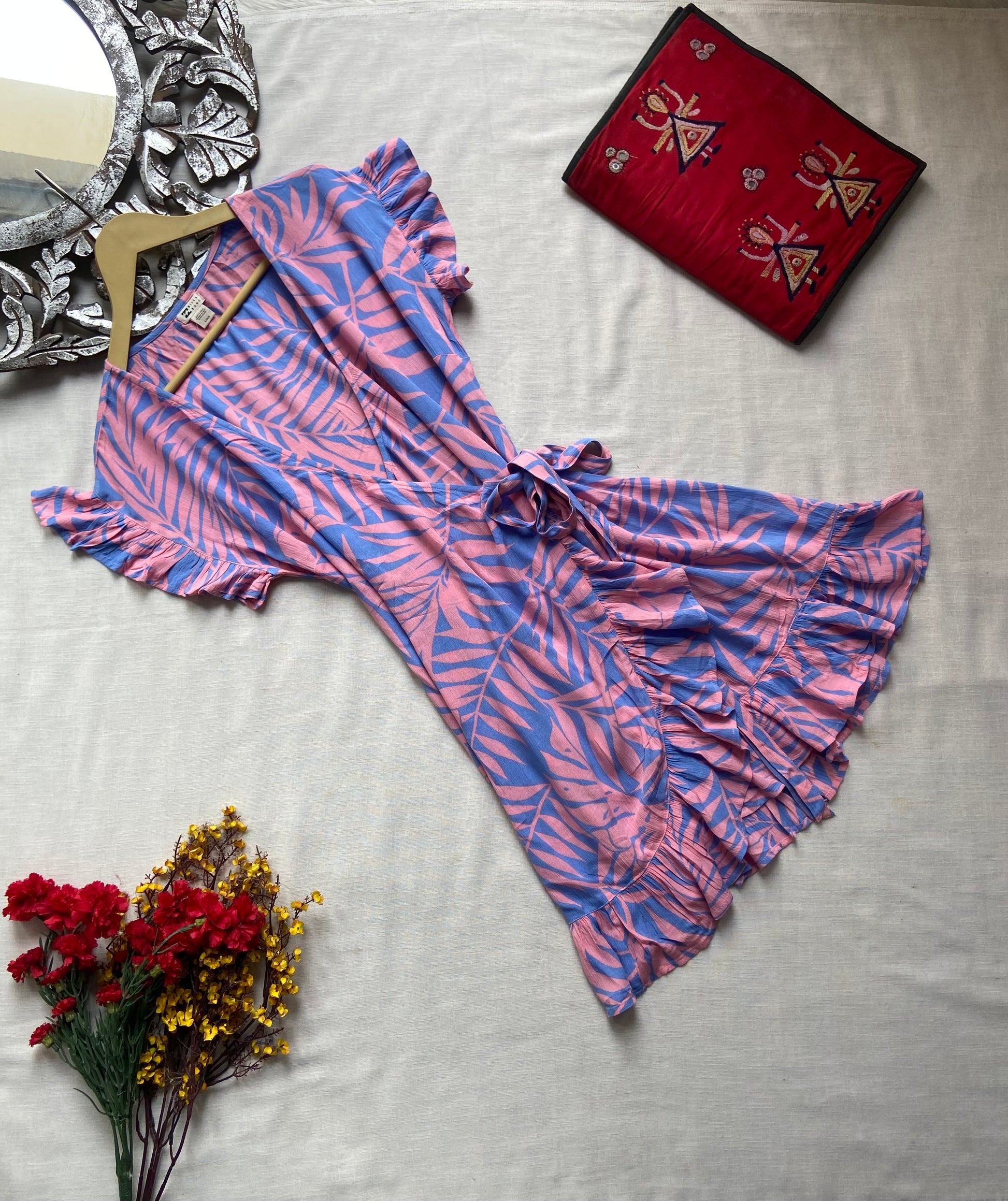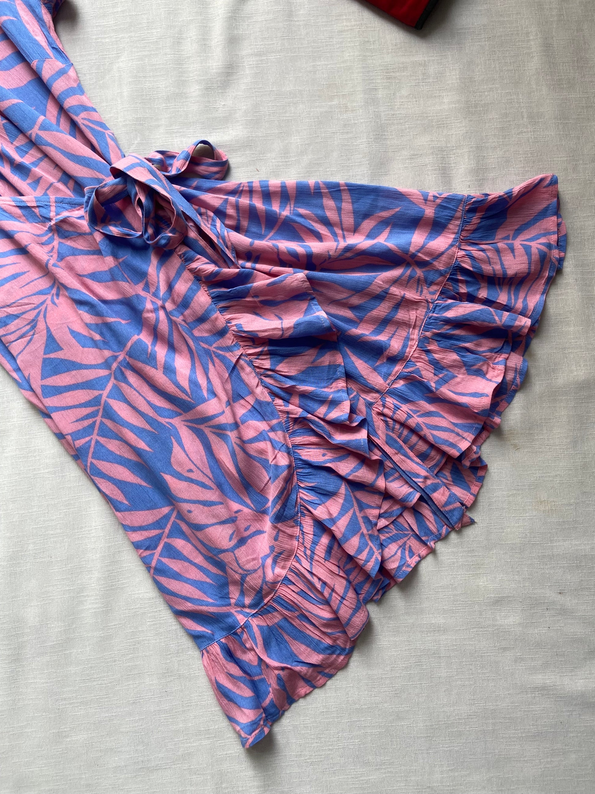 This pink and blue palm print wrap mini dress from Billabong is crafted from breathable cotton viscose fabric, offering comfort and style in size L. Featuring ruffle detailing on the sleeves and hem, its wrap design flatters the silhouette while adding a feminine touch. Best suited for summer outings or casual gatherings, it pairs beautifully with wedge sandals and delicate jewelry for an effortlessly chic look.
