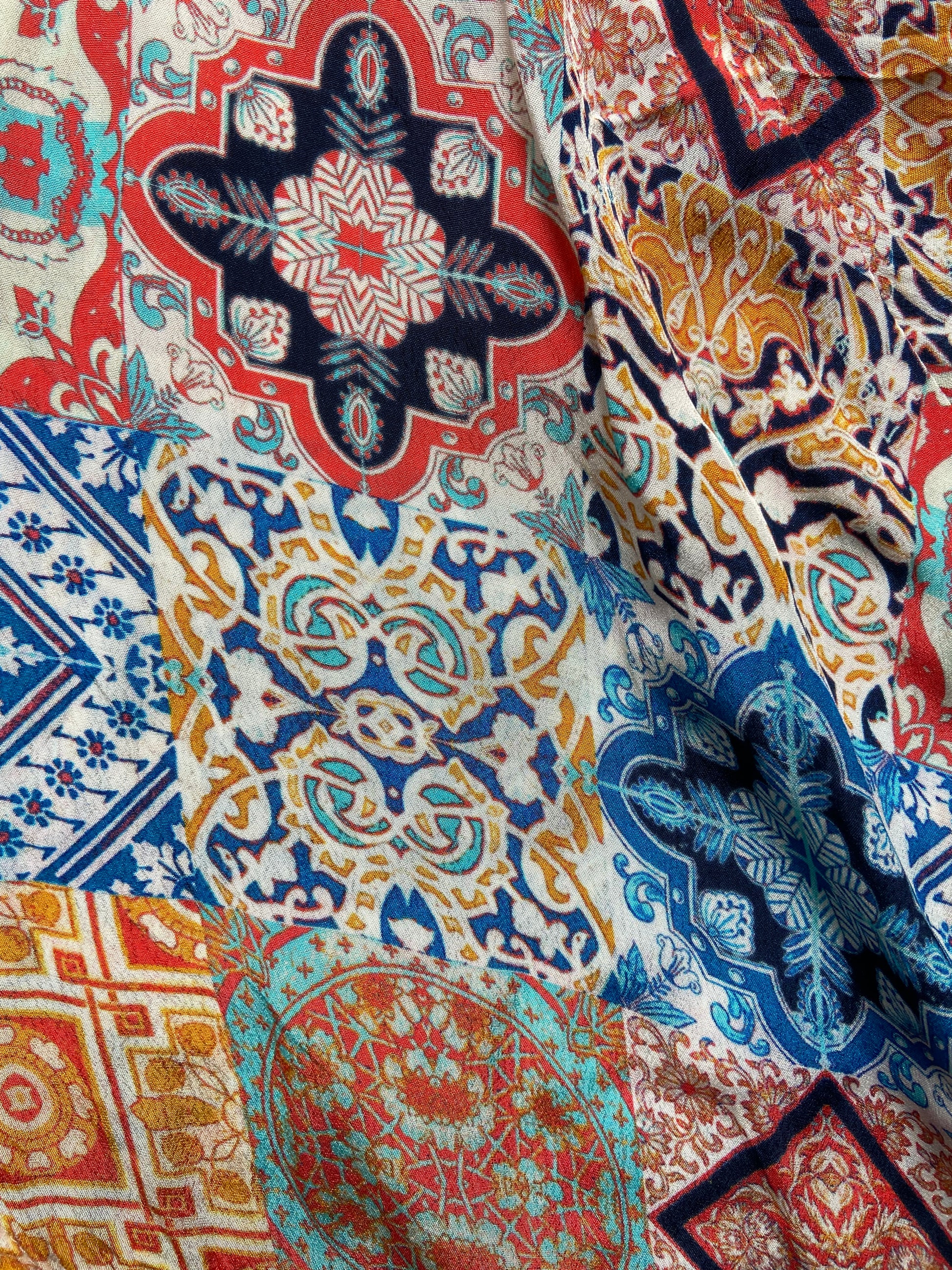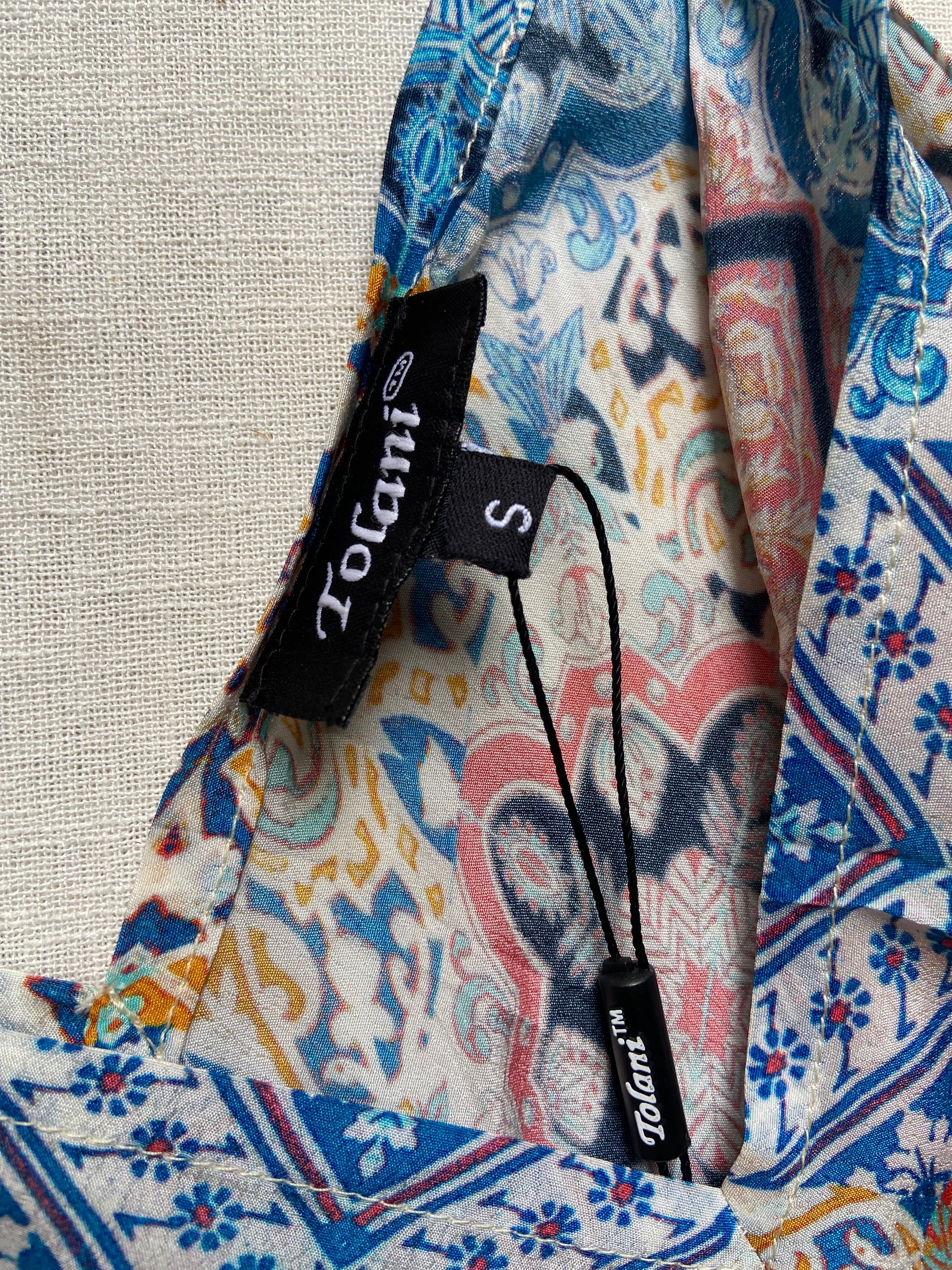This small-sized boho midi dress from Tolani features a vibrant multicolour print on breathable cotton viscose fabric, ideal for beach outings. Its strap pattern enhances comfort and style, making it perfect for warm, relaxed settings. Pair it with sandals and a wide-brimmed hat for an effortlessly chic beach look.