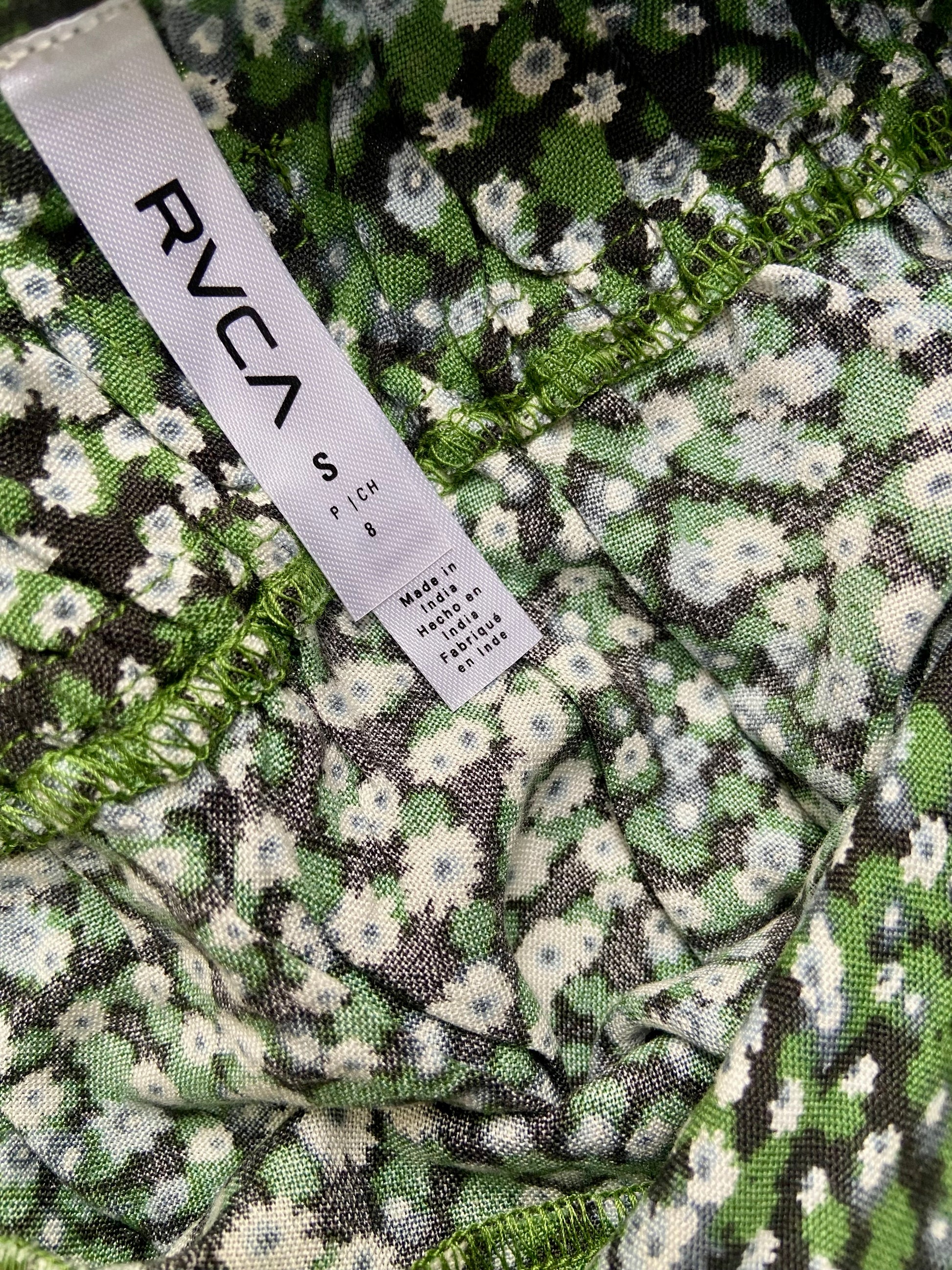 This green, black, and white floral print mini dress from RVCA features a strap pattern and an A-line cut crafted from soft cotton viscose fabric, offering both comfort and style in a size small. Best suited for casual outings and summer gatherings, it provides a flattering silhouette with breathable wear. Best styled with minimalist sandals and a lightweight cardigan for a chic, effortless look.
