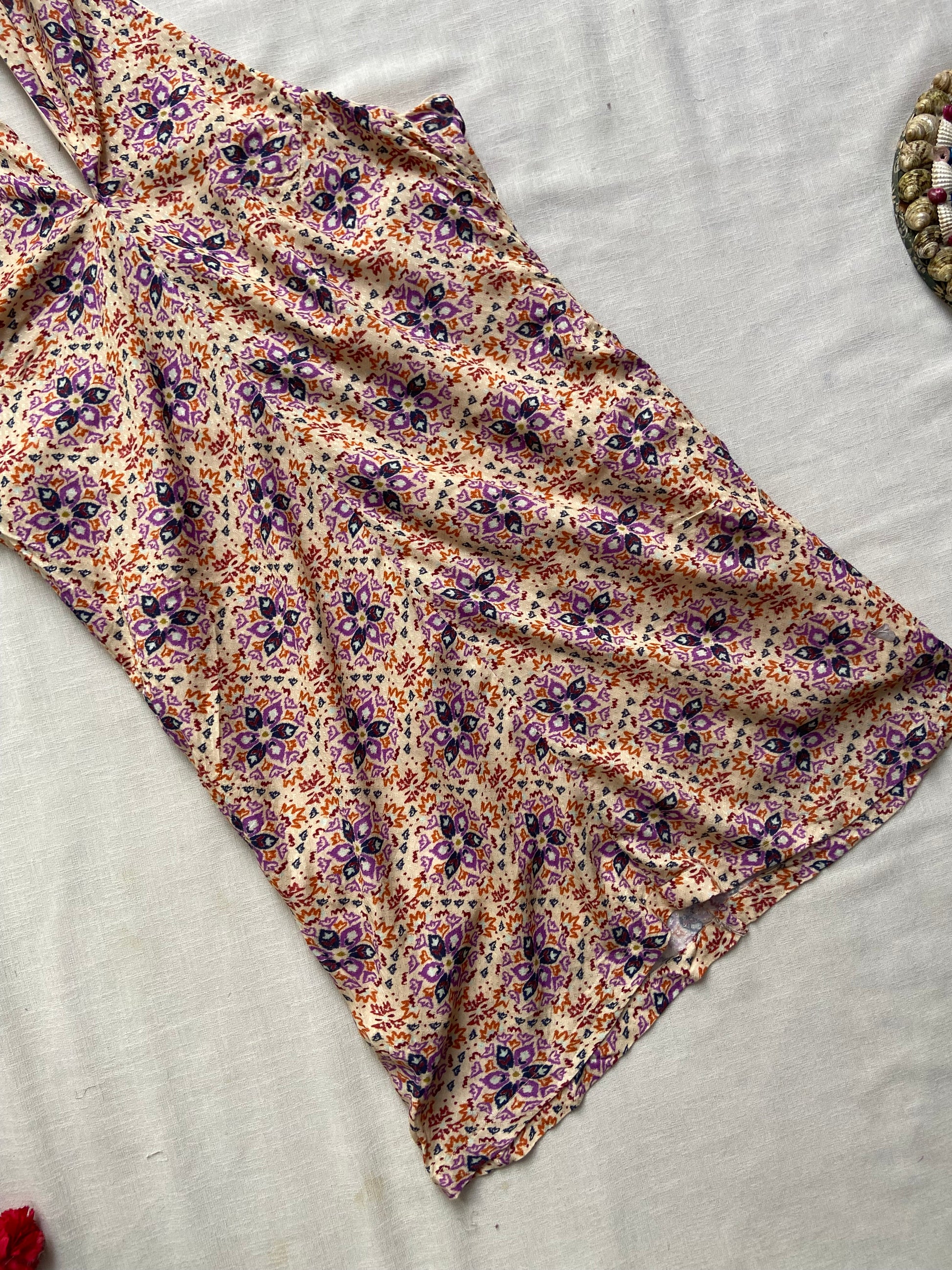 This beige floral mini dress features a halter neck and a backless design, crafted from a comfortable cotton viscose blend. Its lightweight fabric ensures breathability, making it ideal for warm weather. The XS size offers a flattering fit, perfect for casual outings or summer events. Pair it with sandals or heels to highlight its elegant yet playful style.