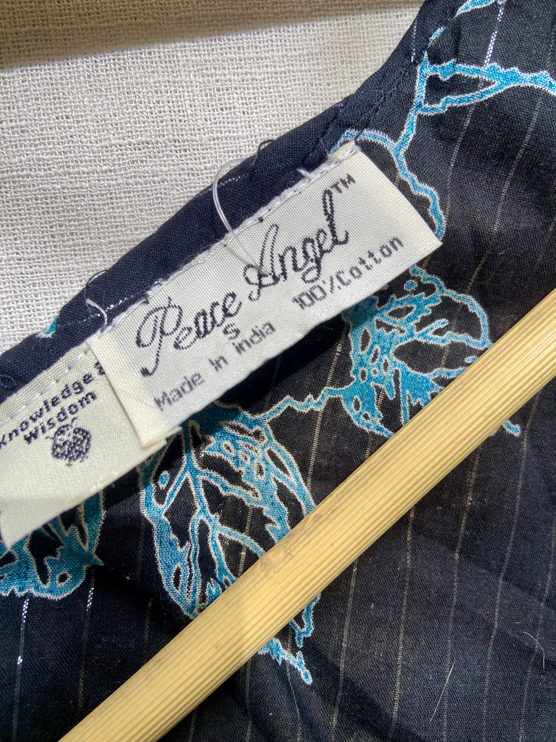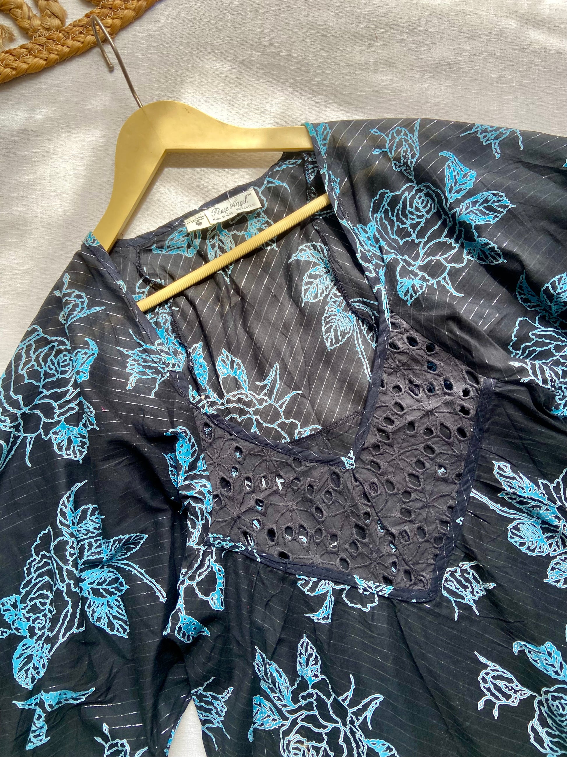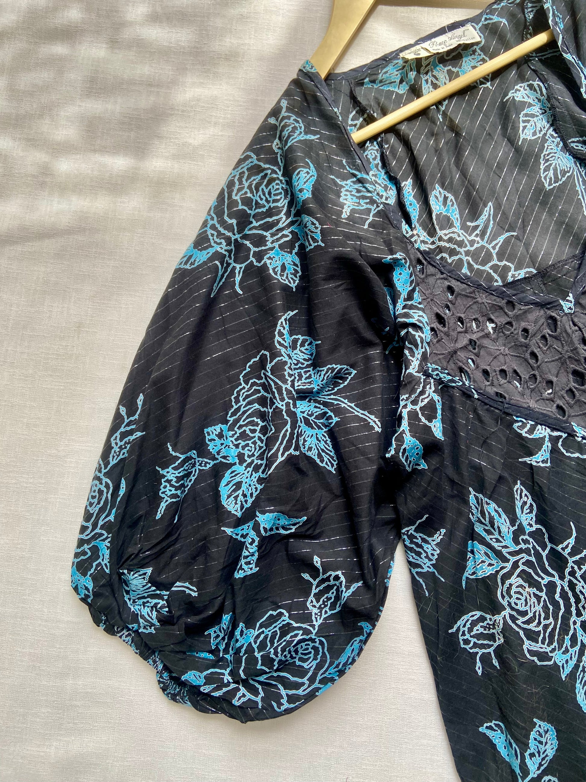 This Black Floral Lurex Beach Dress by Peace Angel features a deep V-neck and 3/4 puff sleeves, crafted from breathable cotton fabric for comfort. The blue floral print adds a vibrant contrast to the black base, while the A-line mini silhouette flatters your figure effortlessly. Ideal for summer outings, it pairs perfectly with sandals or wedges for a chic, relaxed look. Available in size S.