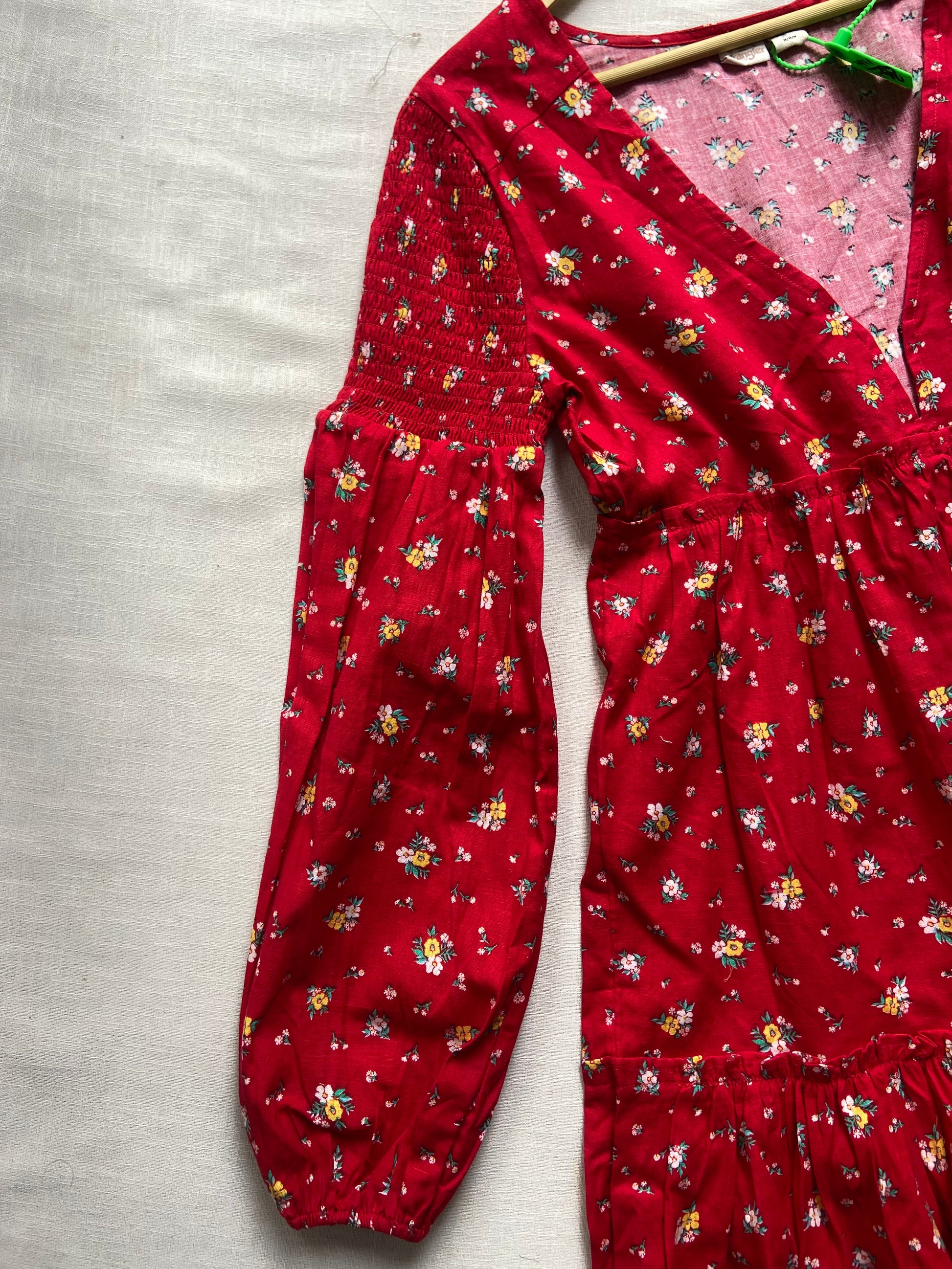 This red floral print tiered midi dress from Wrangler features a flattering V-neck and full puff sleeves, crafted from pure cotton for breathable comfort. Its tiered design adds movement and elegance, making it ideal for daytime events or casual outings. Best styled with neutral sandals and minimal accessories, this size M dress suits those seeking a blend of classic charm and modern style.