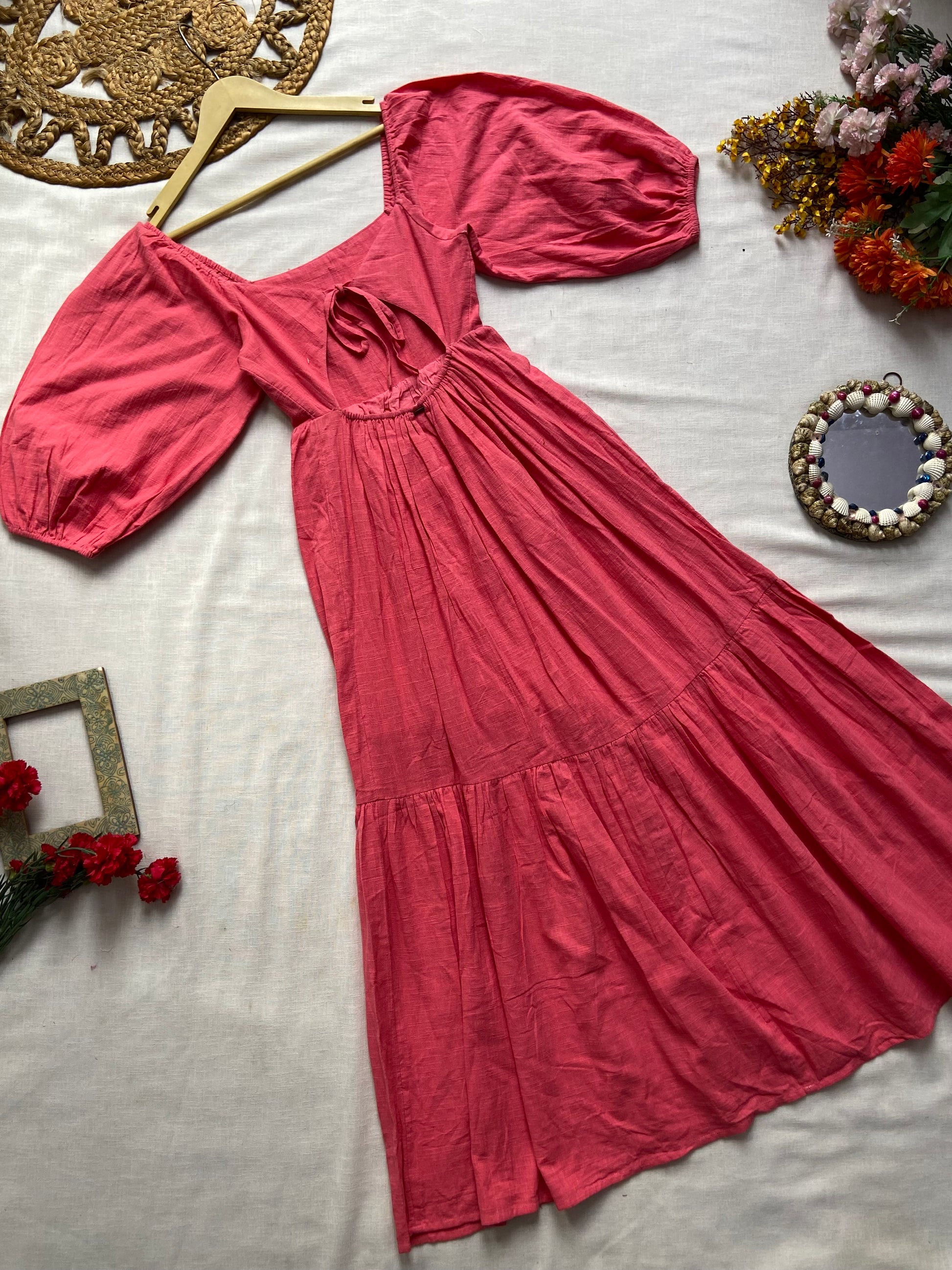 This dusty pink tiered maxi dress from Billabong features elegant puff half sleeves and is crafted from breathable cotton fabric, ensuring comfort and style. Its flowing silhouette flatters the figure while offering ease of movement. Ideal for warm weather, it pairs beautifully with strappy sandals or espadrilles for a chic, relaxed look. Perfect for casual outings or beachside events, this size XS dress combines timeless design with everyday wearability.
