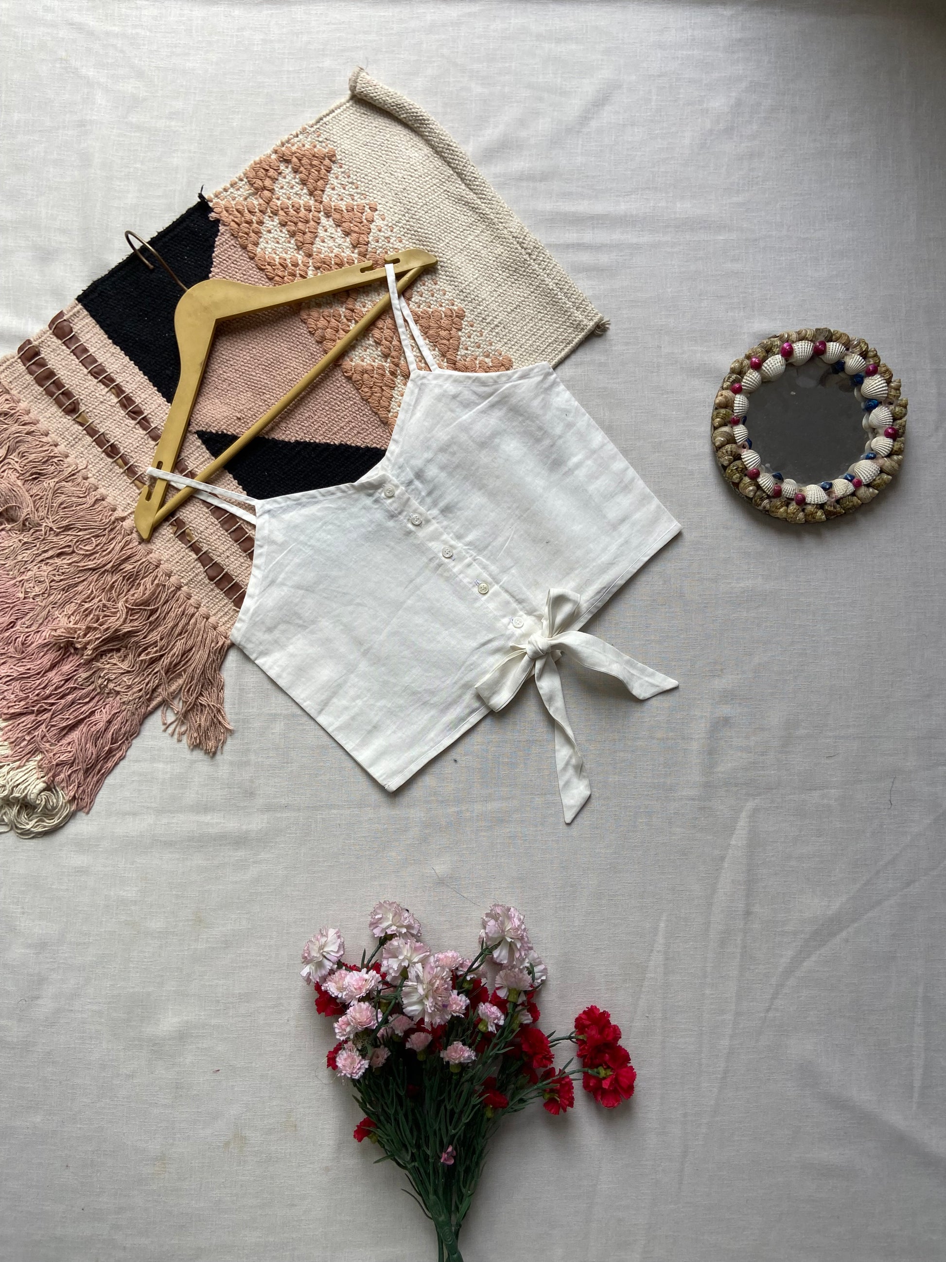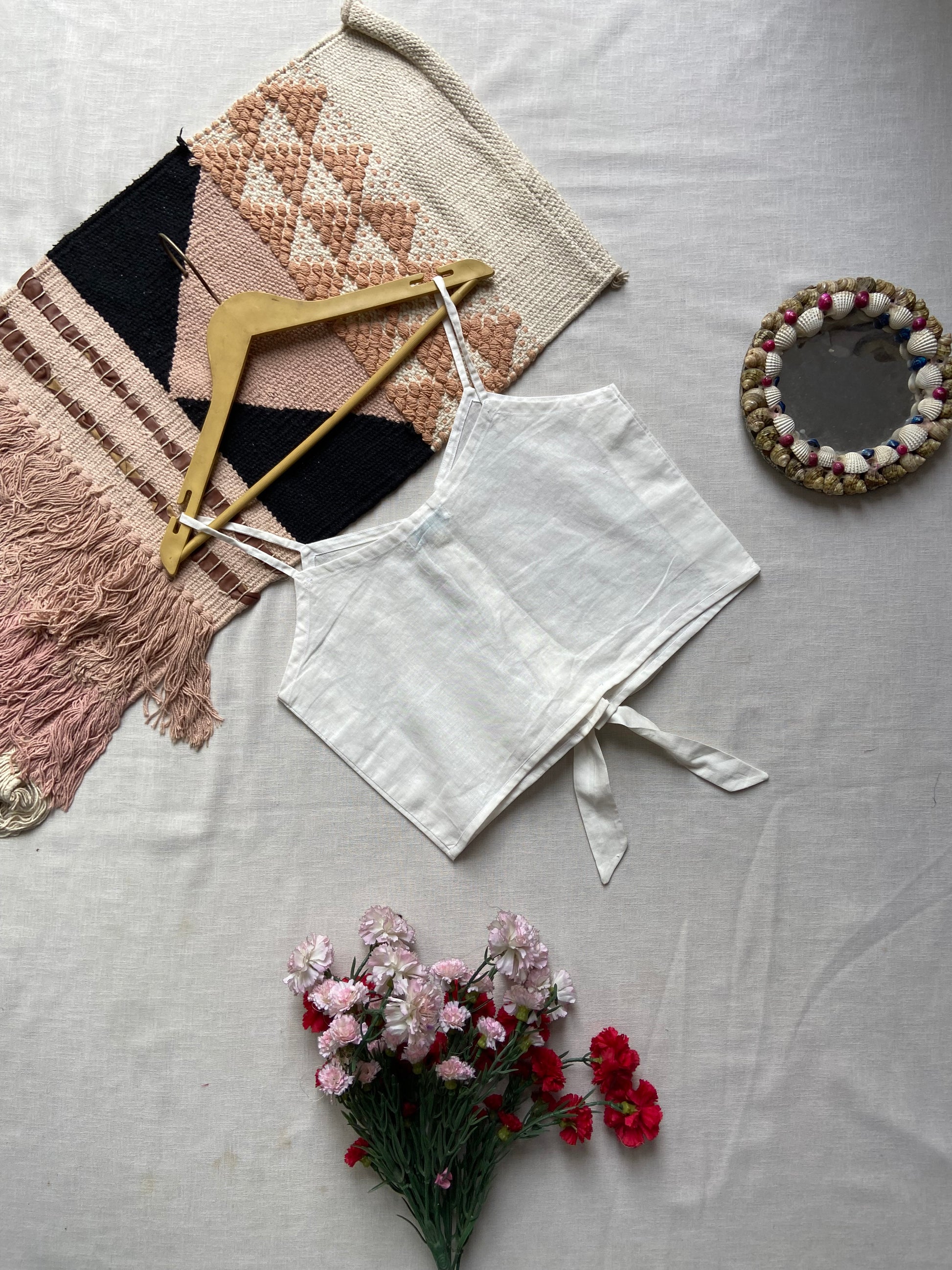 Keep it simple, fresh, and effortlessly chic with this white cotton crop top. Designed with delicate spaghetti straps, a button-down front, and a stylish tie-up detail at the hem, this top is a must-have for summer. Made from breathable, lightweight cotton, it offers comfort while giving you a clean, minimalist look. Perfect for pairing with high-waisted jeans, skirts, or shorts for a relaxed day out, beach vacation, or casual brunch.