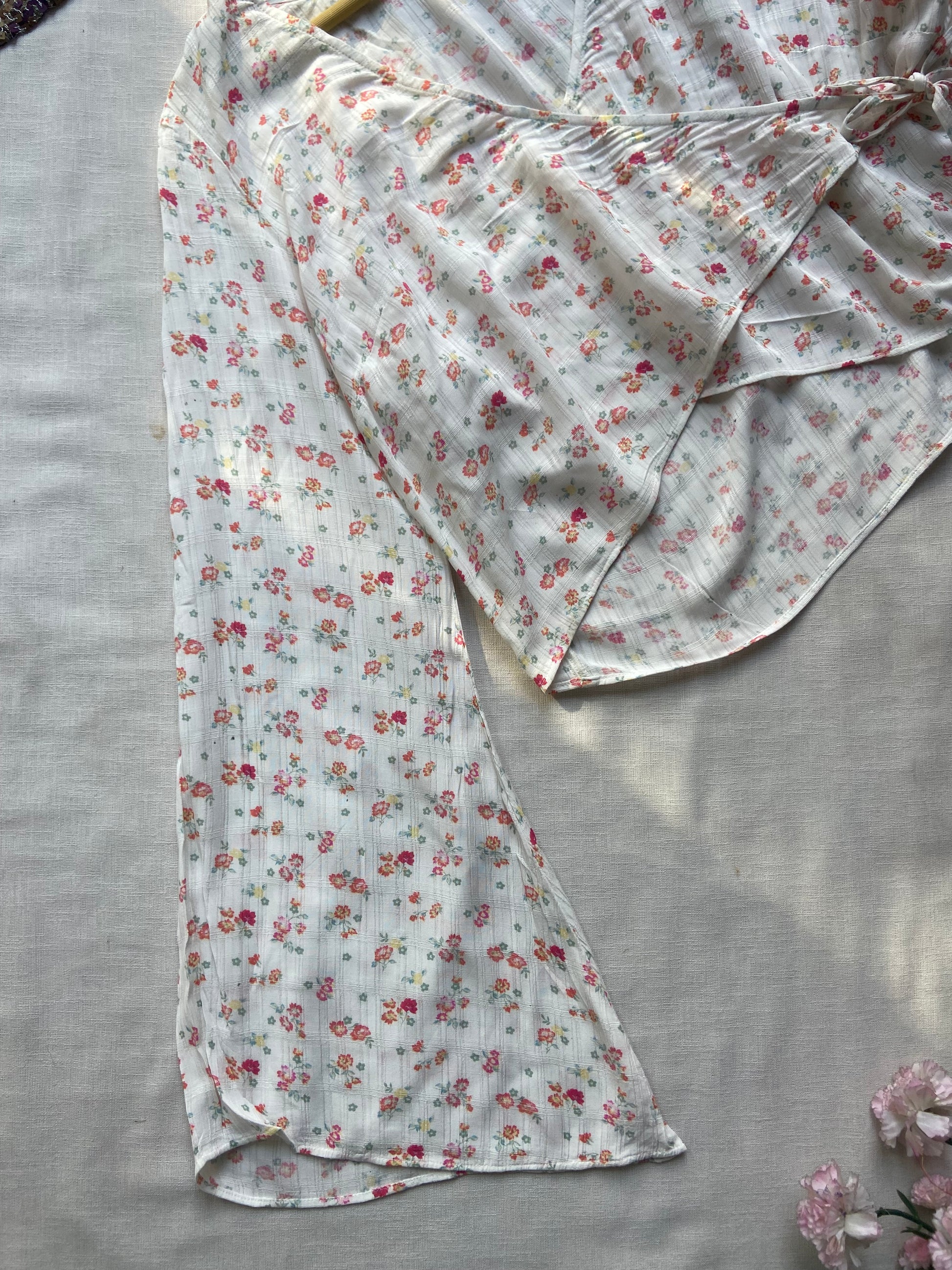 Floral Wrap Top with Flared Sleeves – White & Pink