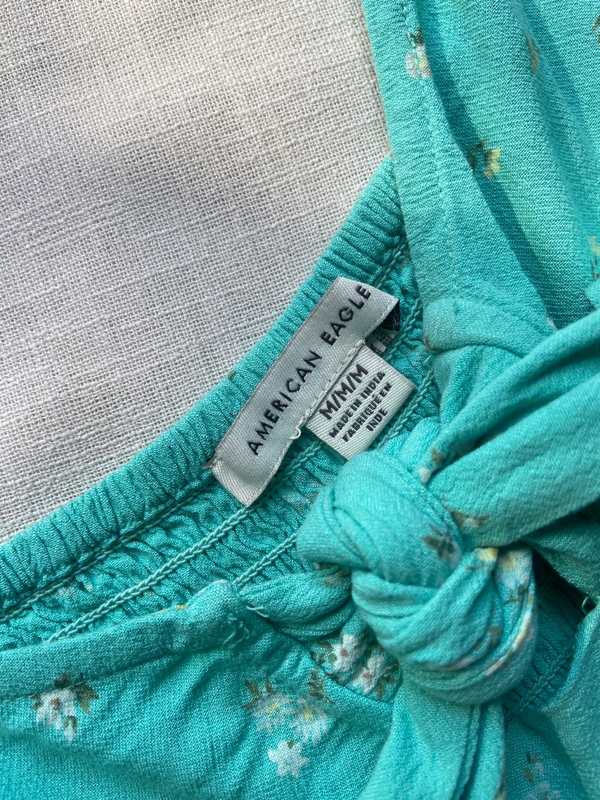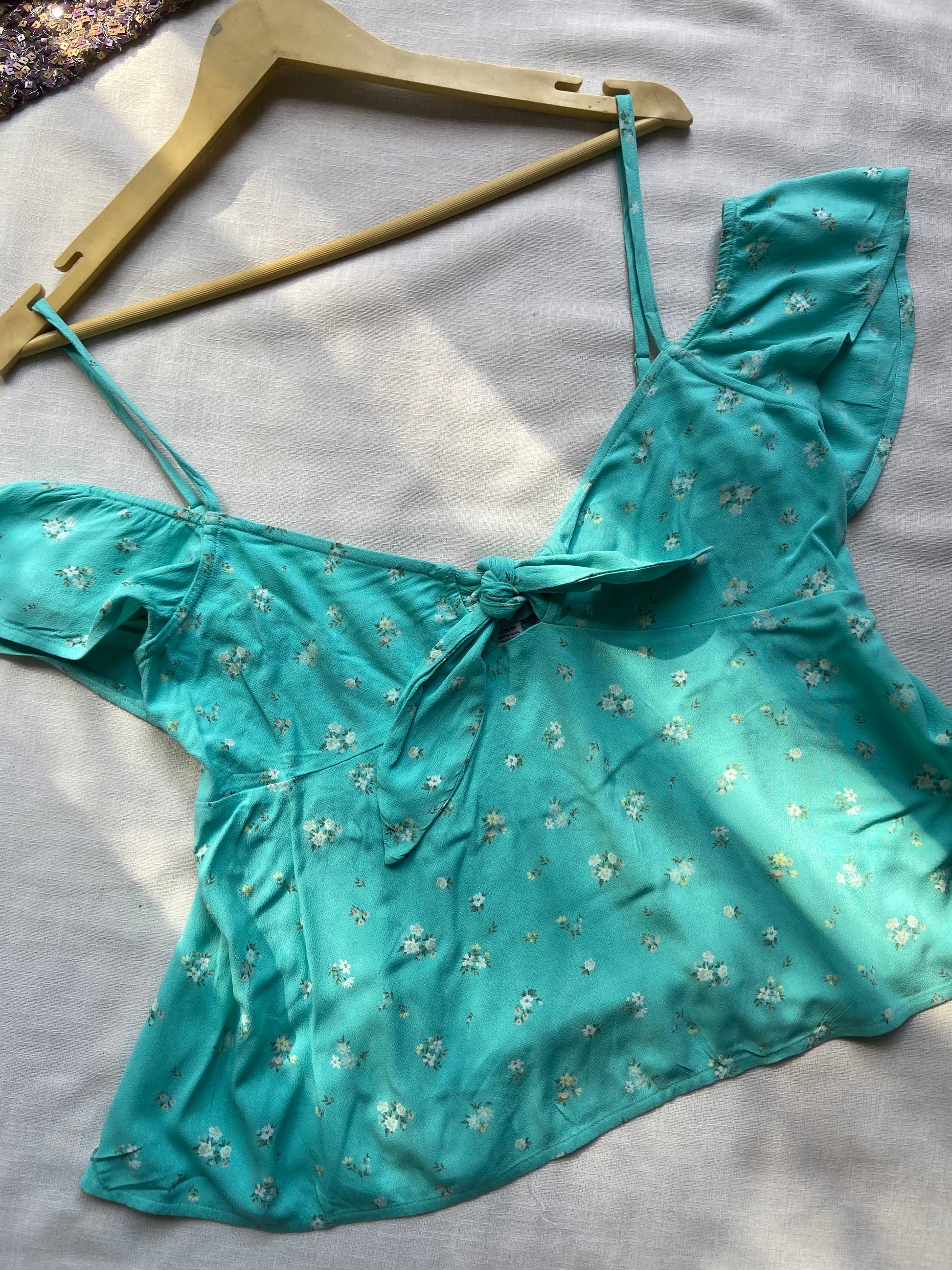 Add a touch of charm to your summer wardrobe with this aqua blue off-shoulder crop top. Featuring delicate white floral prints, flutter sleeves, and a front tie detail, this lightweight and breezy top is perfect for sunny days, beach outings, or casual hangouts. Pair it with high-waisted jeans, skirts, or shorts for an effortlessly chic look.