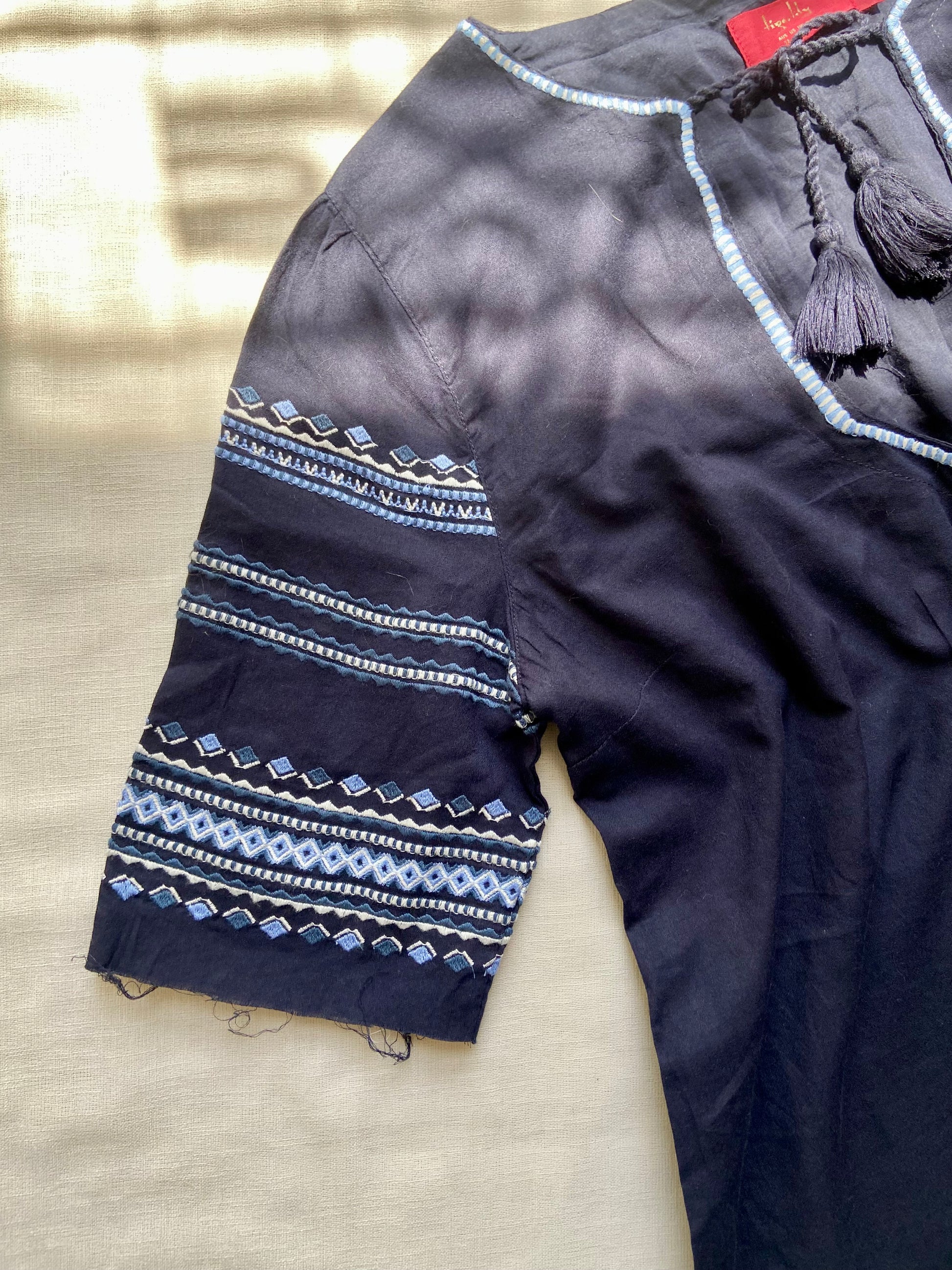 This navy blue tunic dress features intricate blue embroidery on the sleeves and hem, with a relaxed fit and soft fabric for all-day comfort. The V-neckline is accented with tassel ties for a boho-chic touch. Perfect for casual outings, beach days, or layering with leggings.