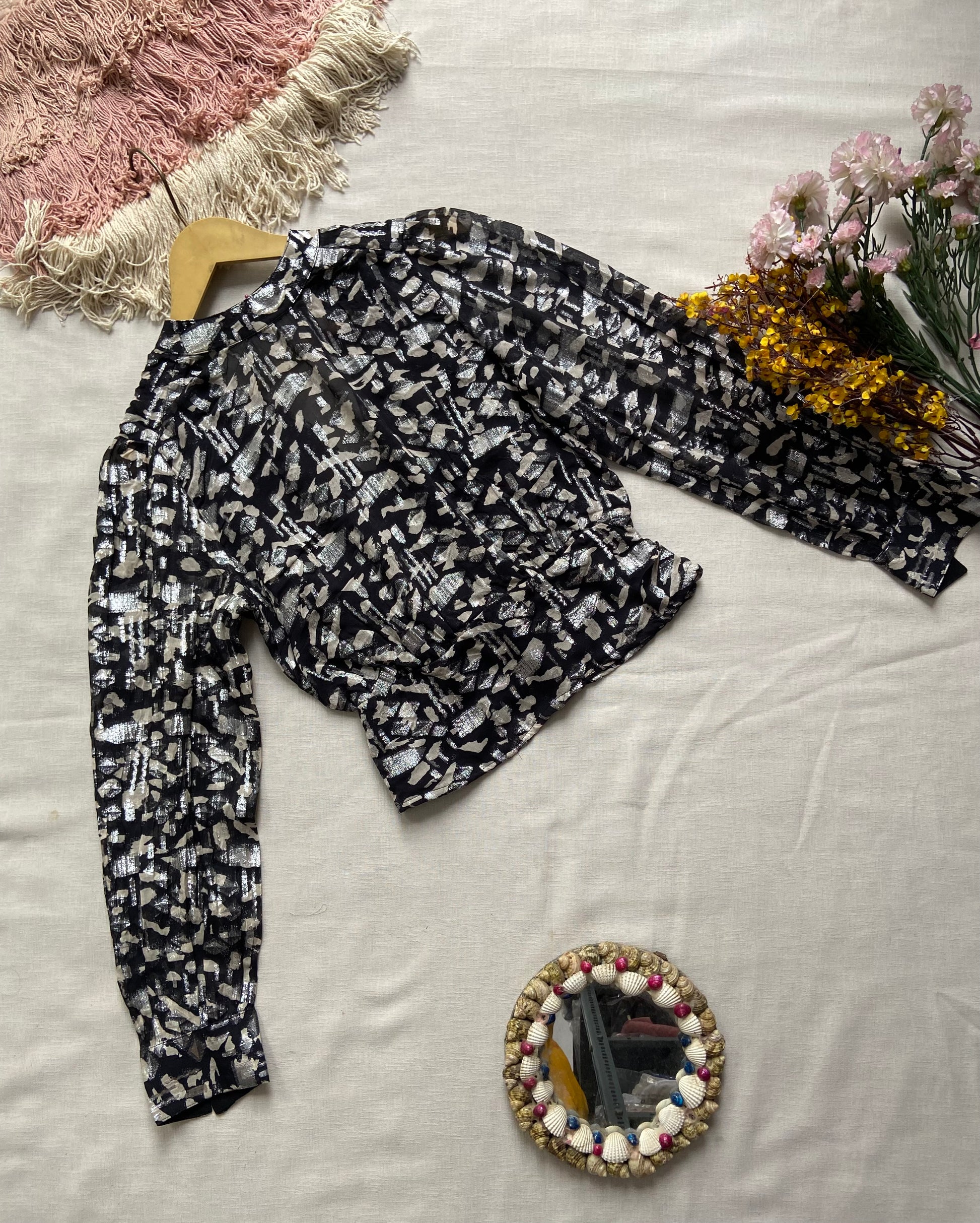 A stylish sheer blouse featuring a black base with shimmering silver abstract prints. Designed with long puff sleeves and a fitted waist, perfect for both casual and formal occasions.