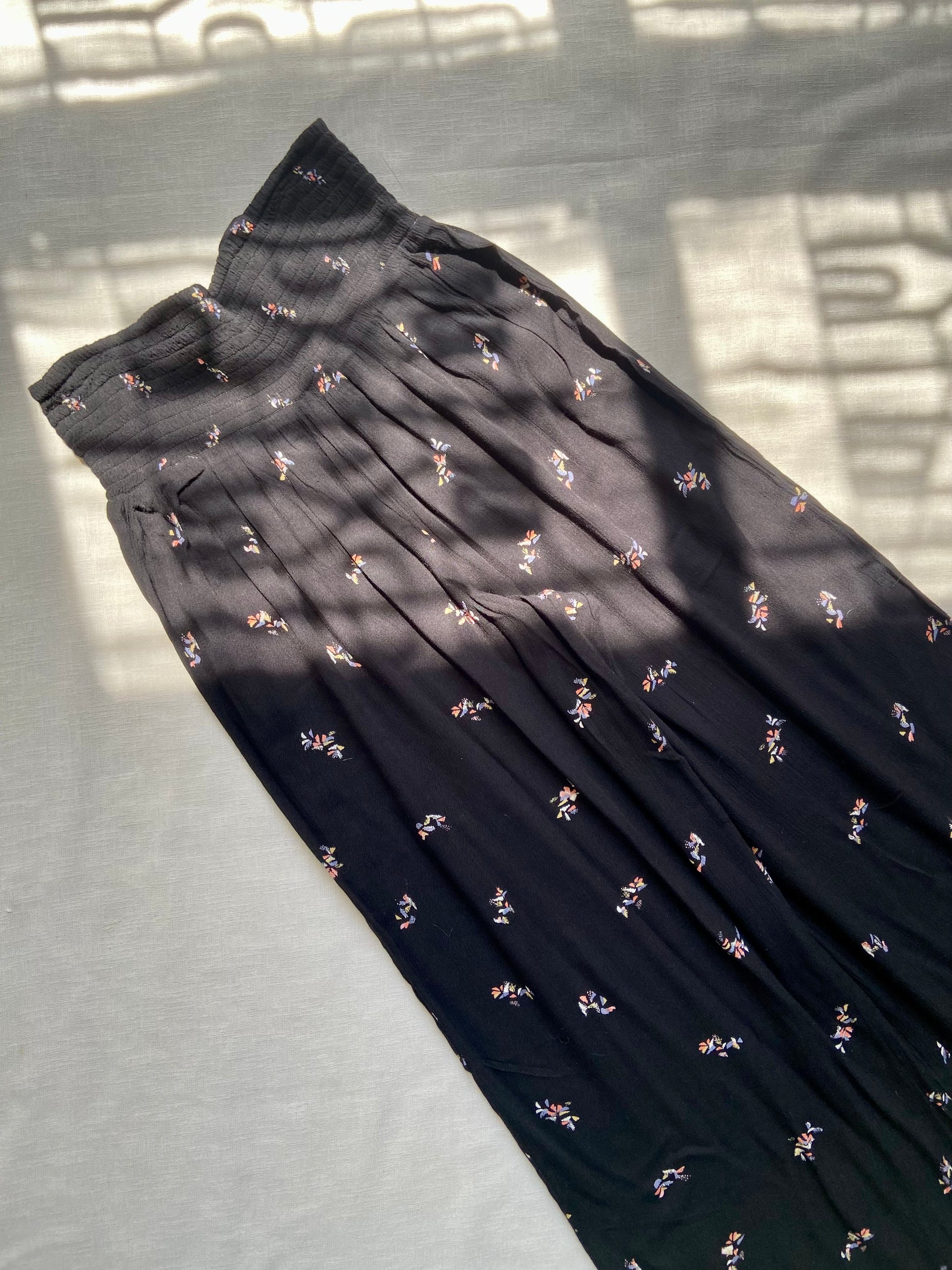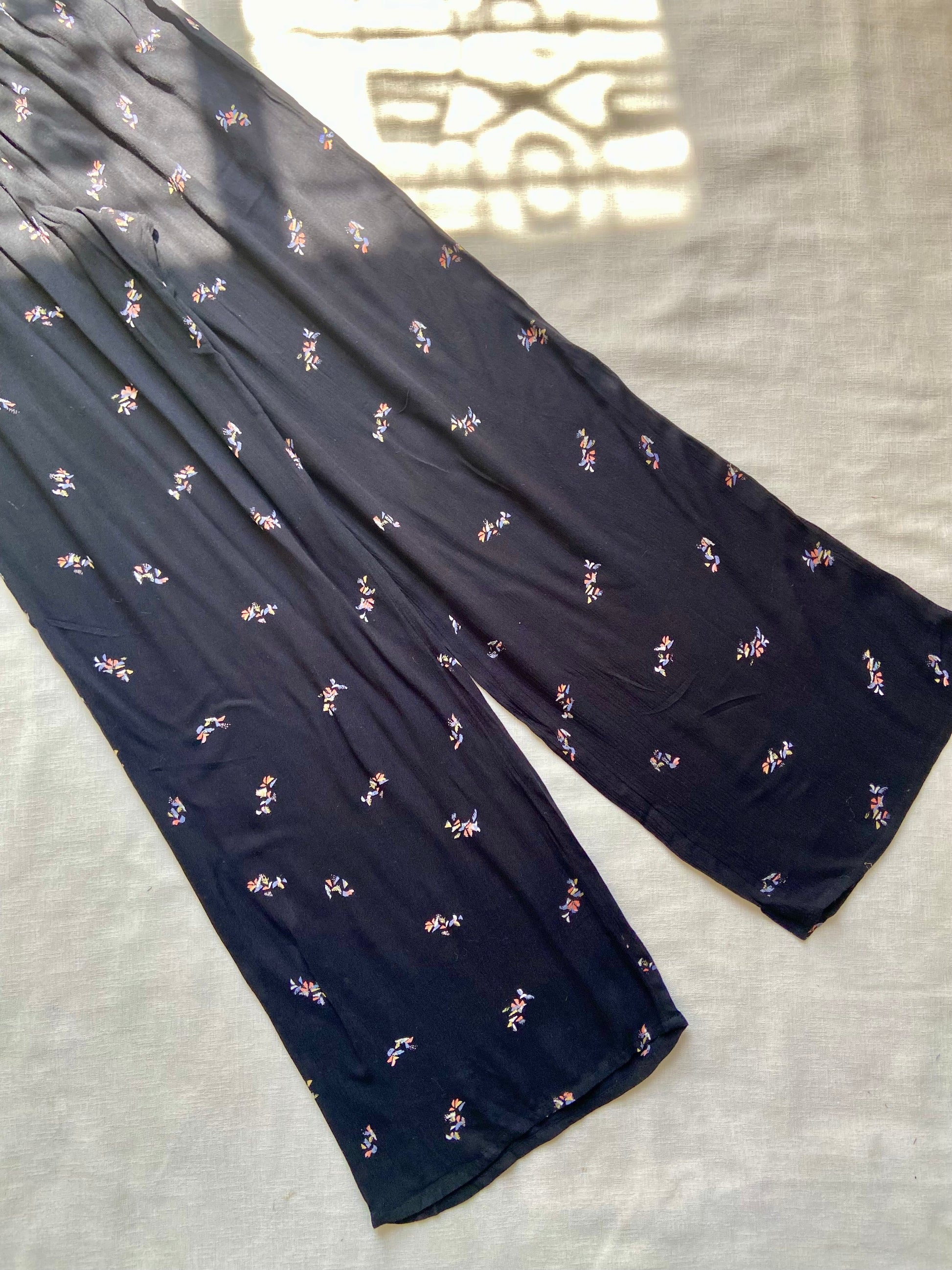 These elegant black palazzo pants feature a high-waisted smocked waistband and a flowy, wide-leg silhouette. Decorated with delicate all-over floral prints, they offer both comfort and style—perfect for casual days, lounging, or pairing with a chic top for an elevated look.