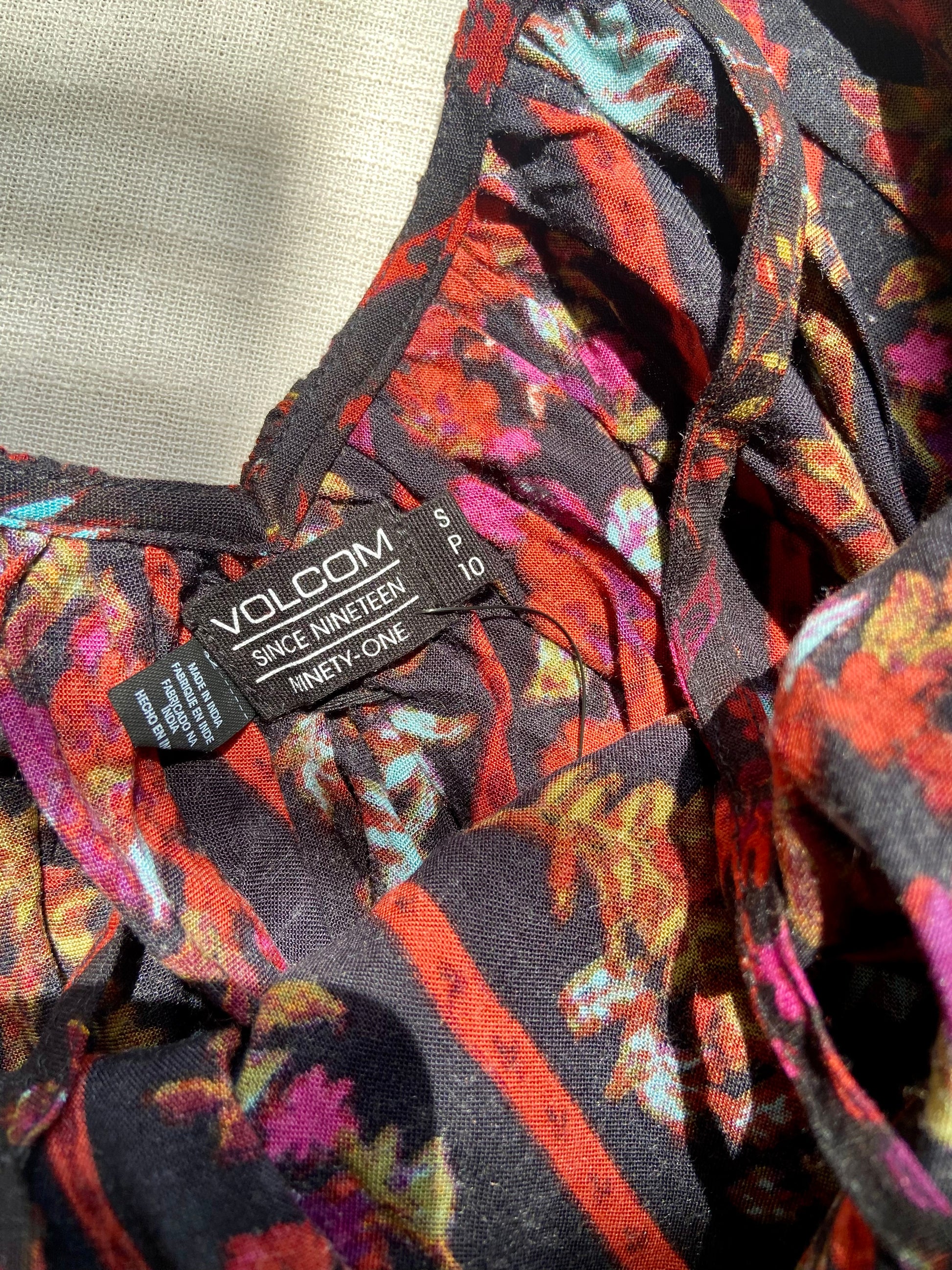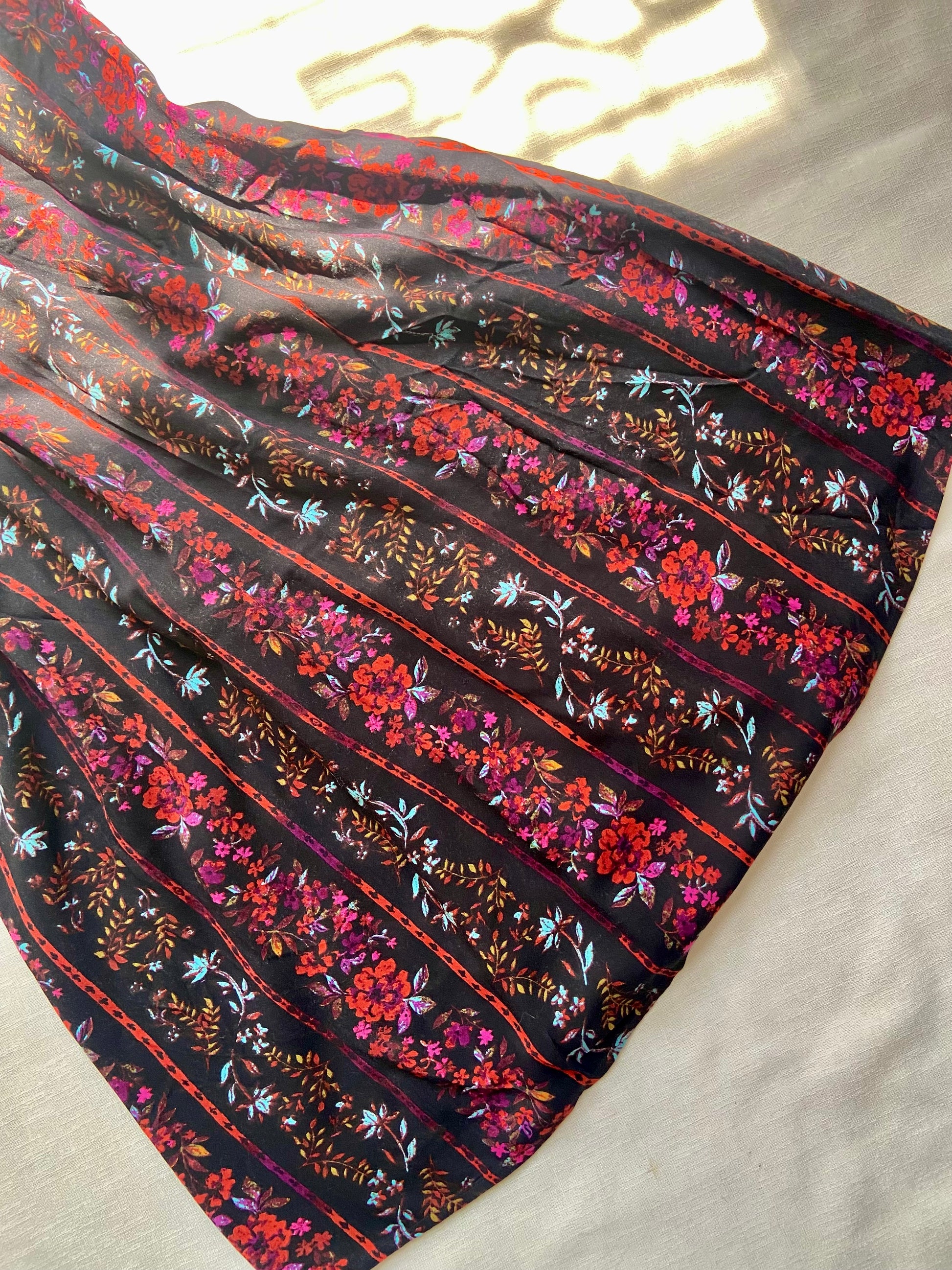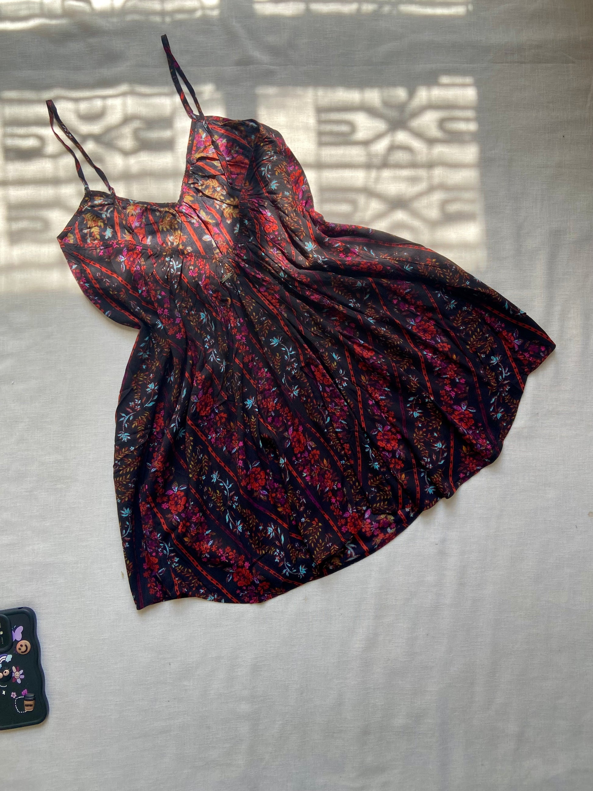 This lightweight mini dress features a beautiful combination of vertical floral stripes in rich hues of red, blue, and orange on a dark base. Designed with thin adjustable shoulder straps and a flowy silhouette, it's perfect for casual summer outings or layering under a jacket for a chic boho look. Comfortable, stylish, and easy to wear all day long.