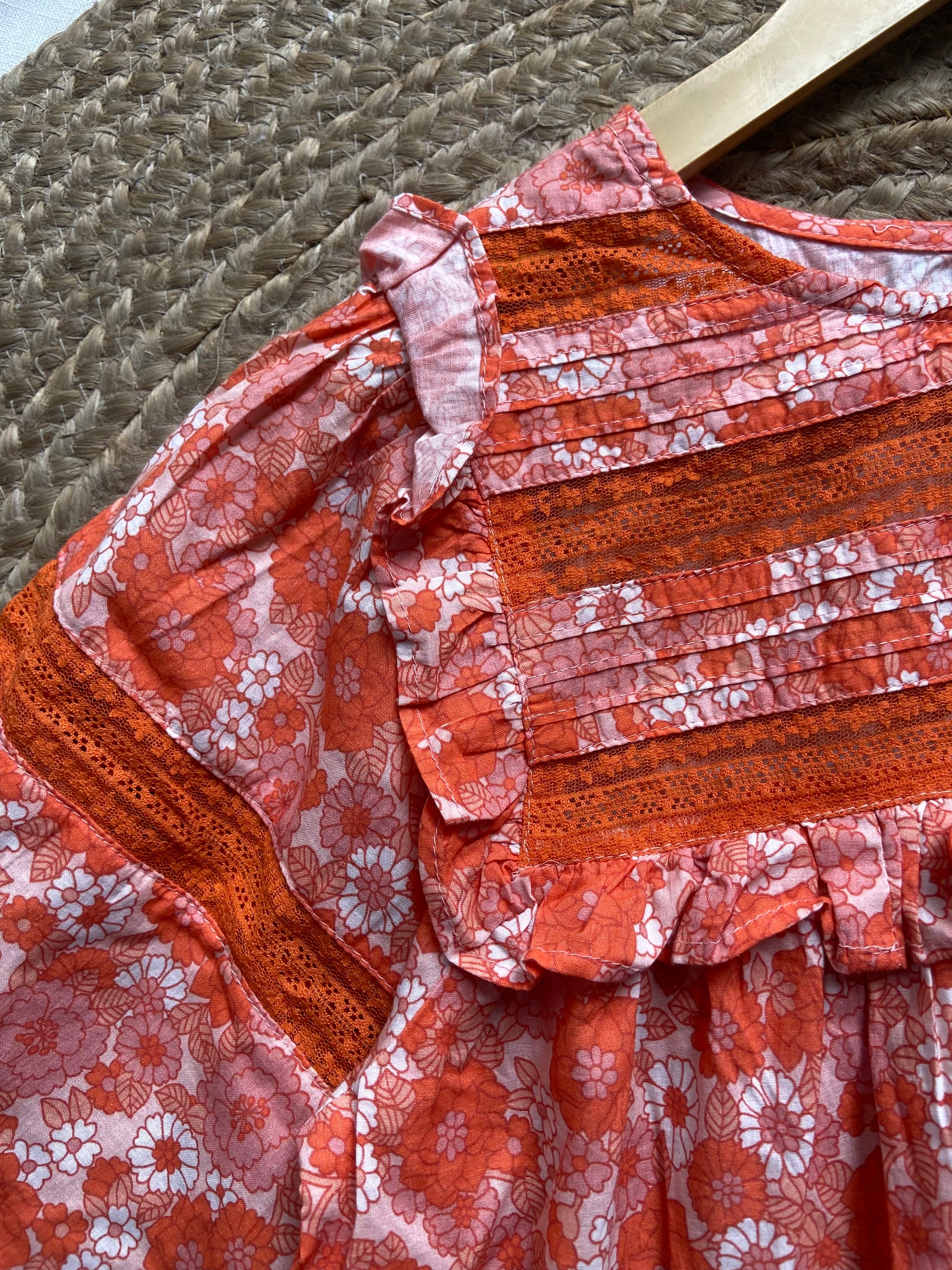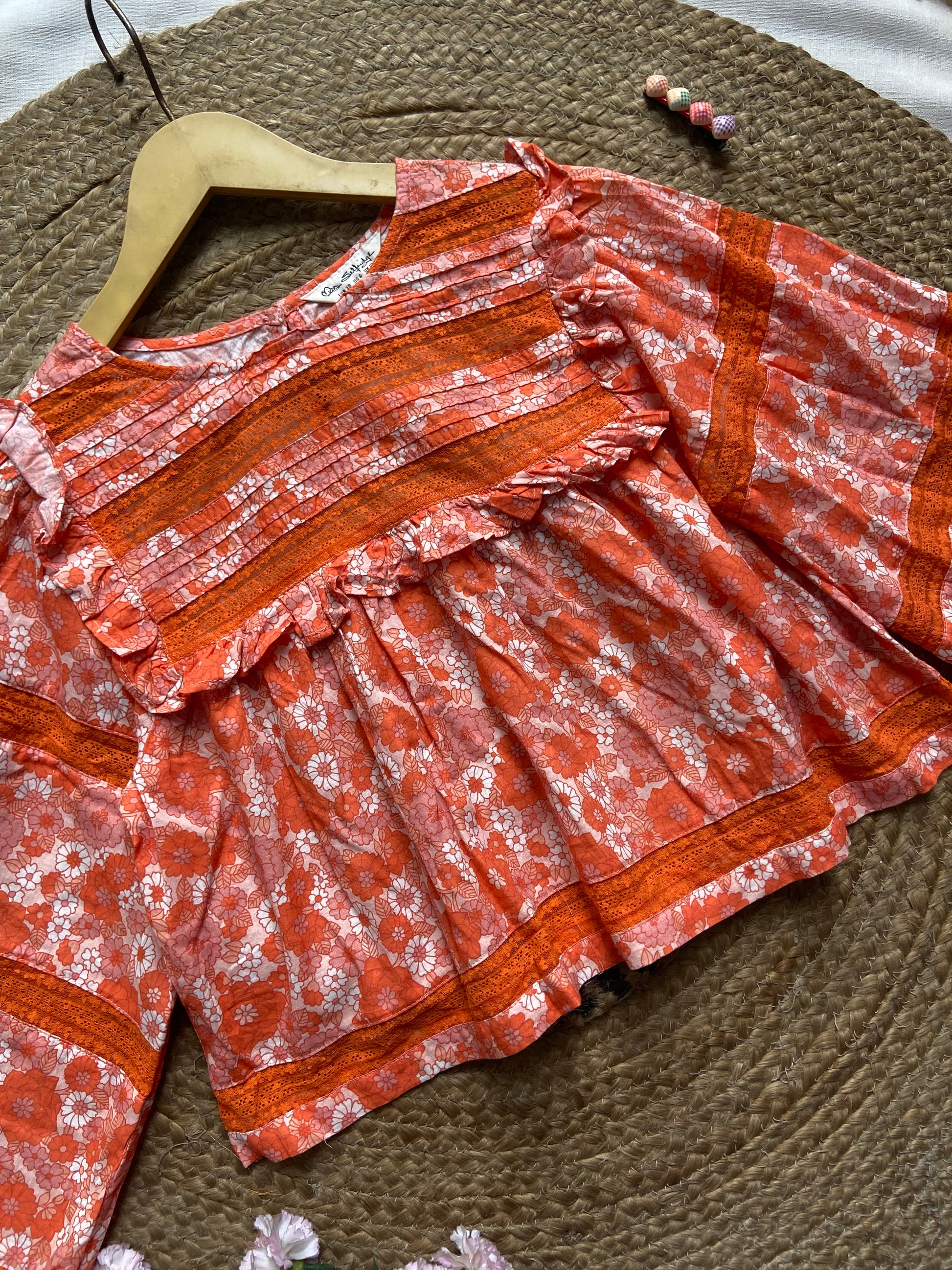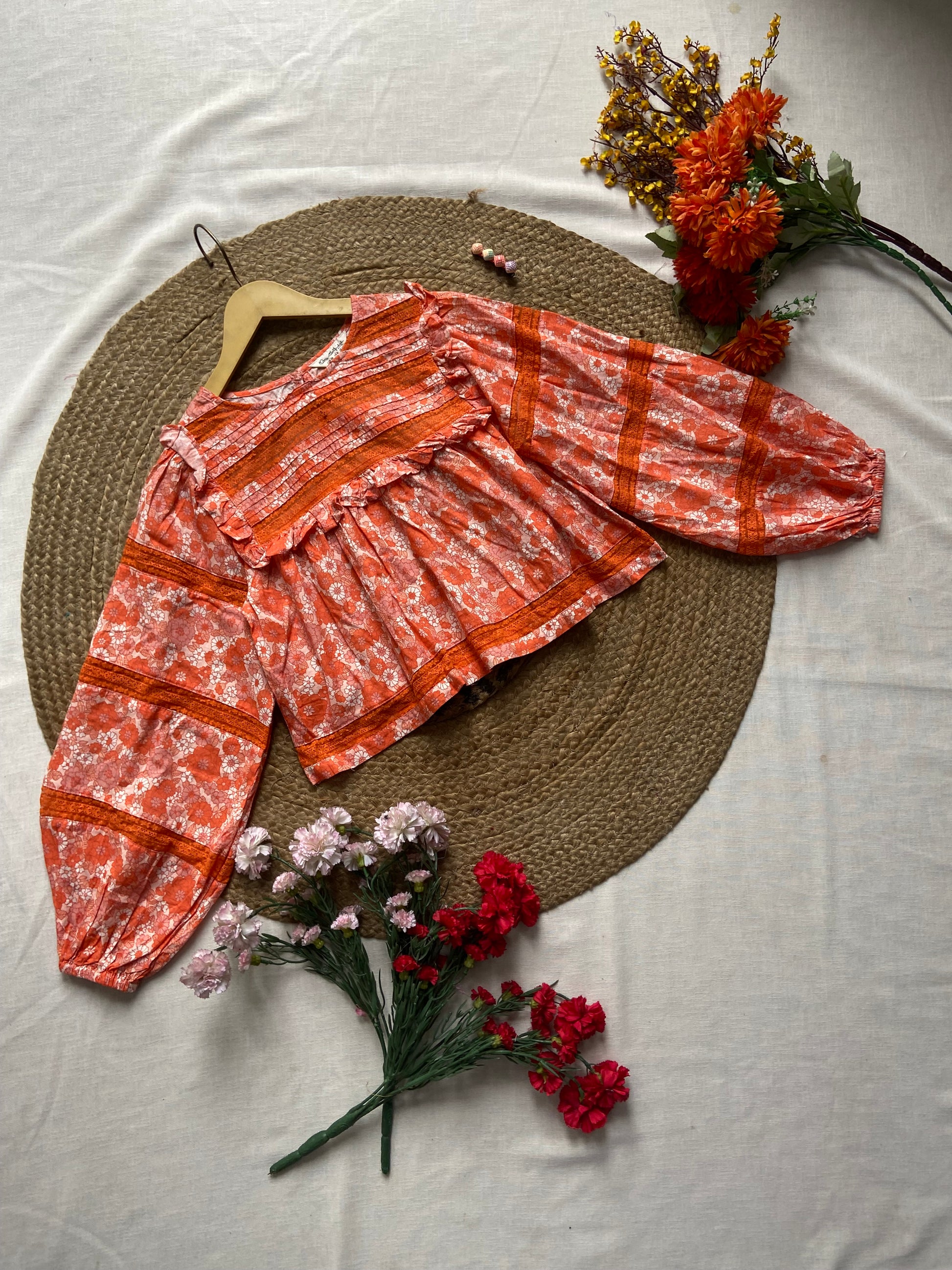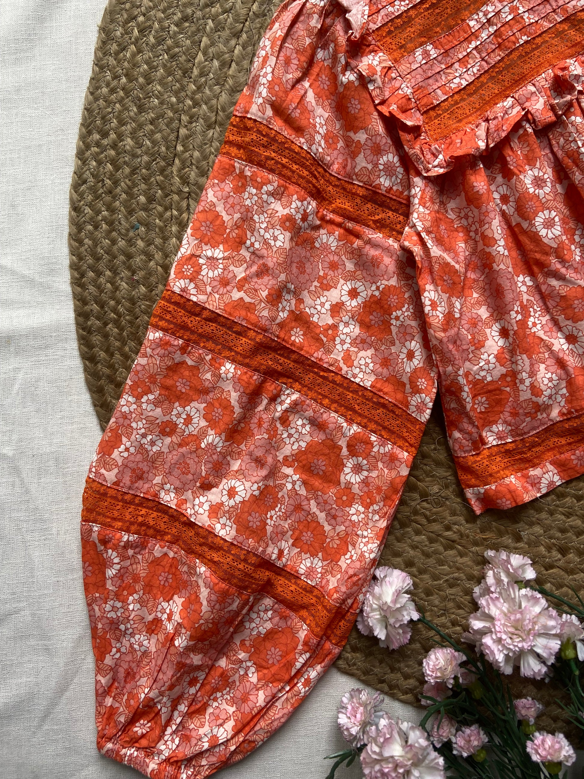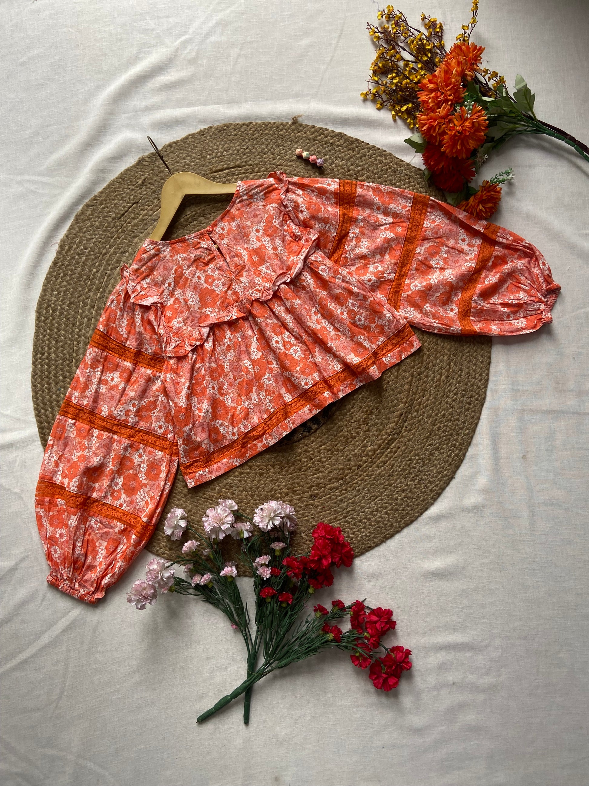 Bring a touch of bohemian charm to your wardrobe with this vibrant orange floral print top. Designed with long puff sleeves and delicate frill detailing on the front yoke, this top blends ethnic inspiration with modern comfort. The flowy fit ensures ease of movement while the intricate floral pattern adds a lively, feminine vibe. Perfect for casual outings, festive gatherings, or a relaxed day out, pair it with jeans, trousers, or ethnic bottoms for a stylish statement.