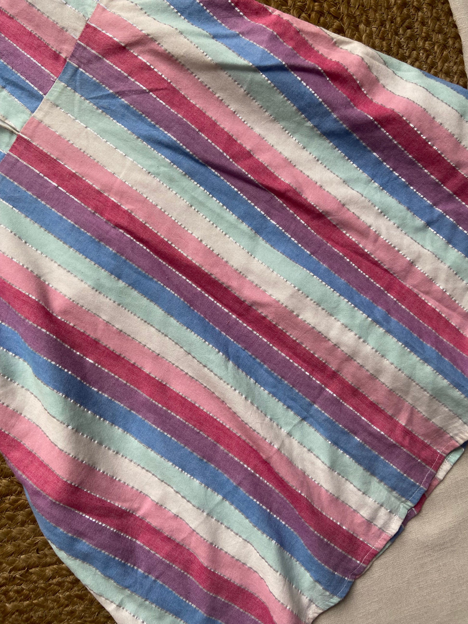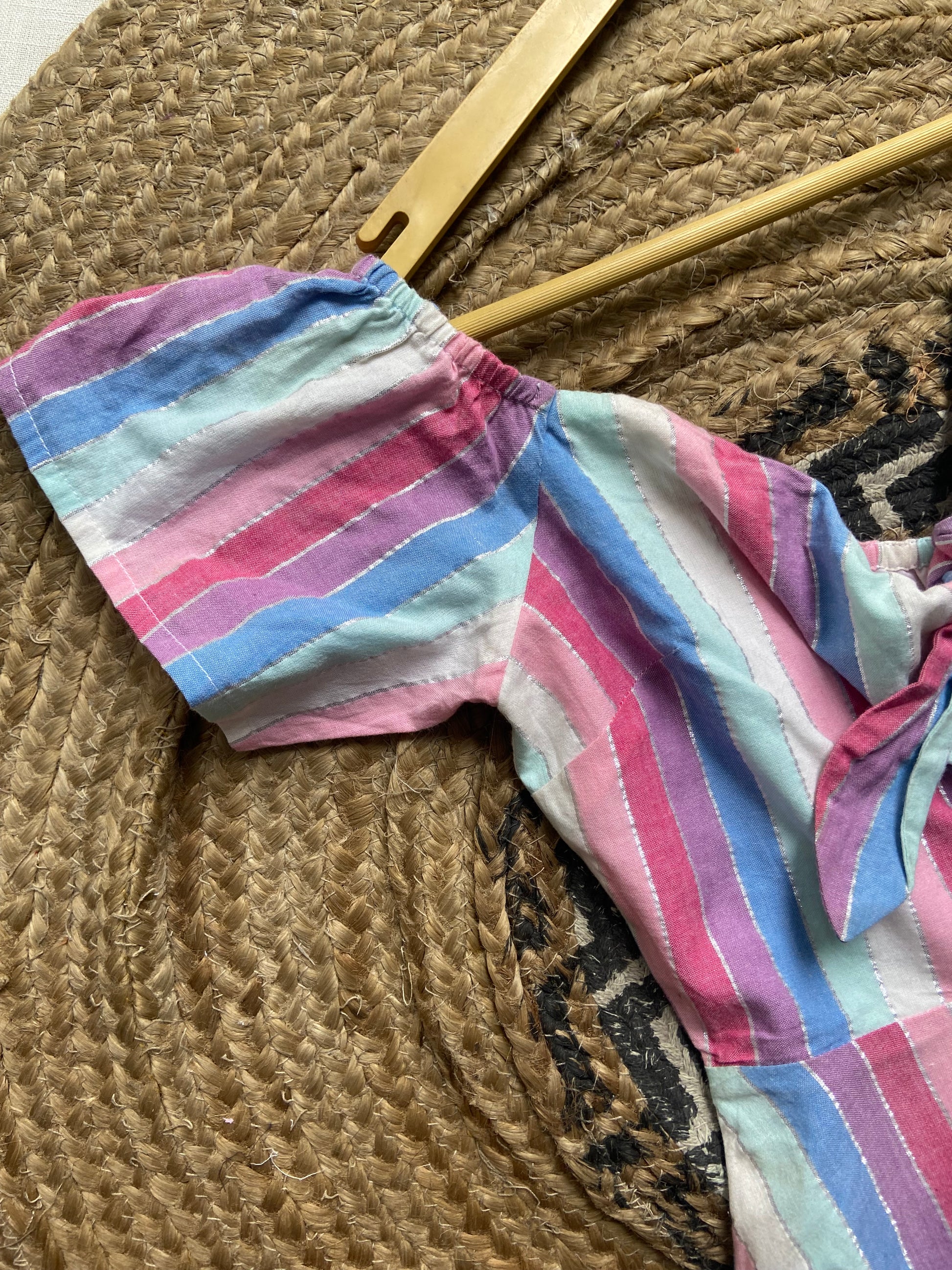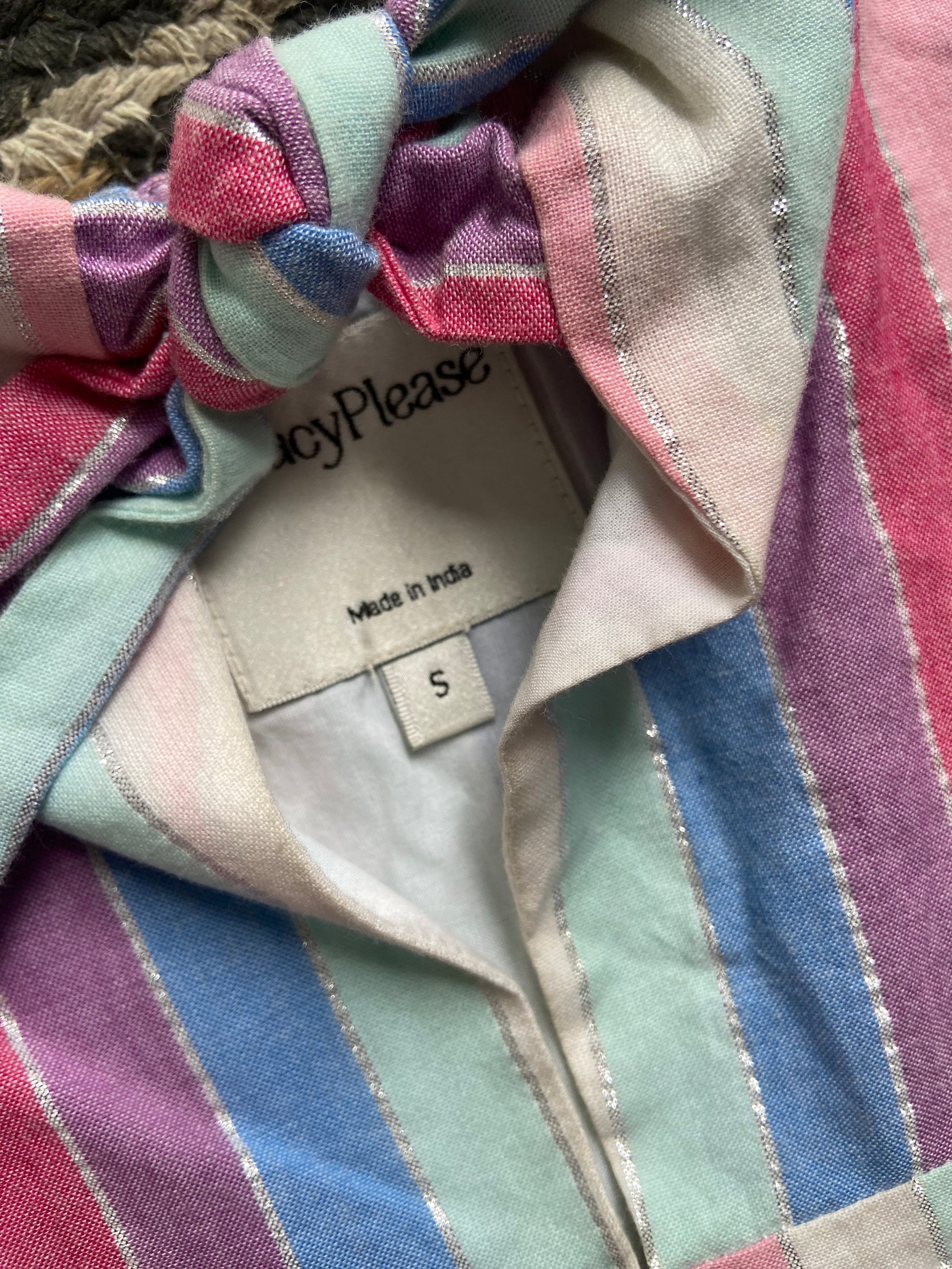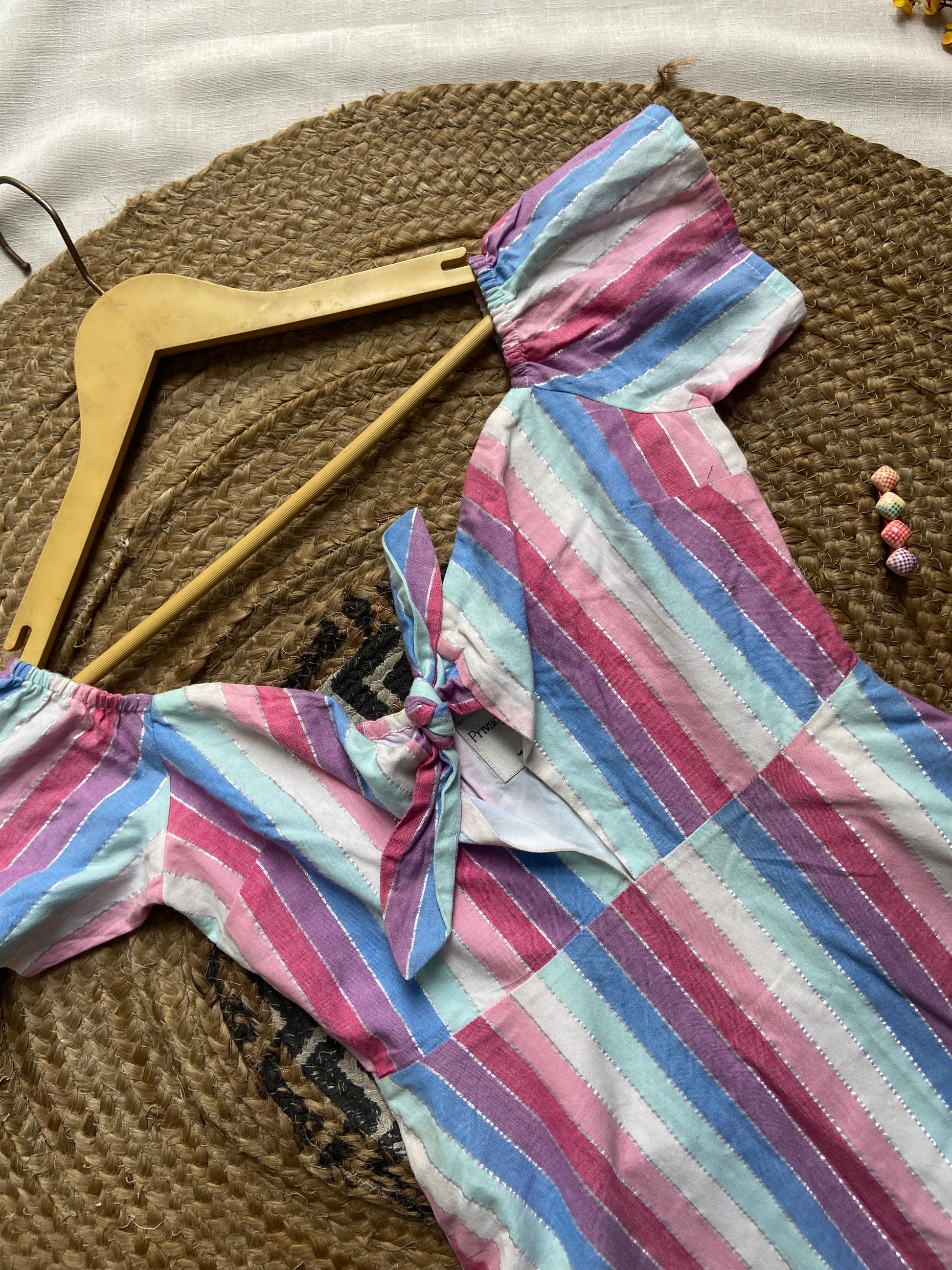 Step into summer with this charming mini dress featuring colorful vertical stripes in shades of pink, blue, purple, and white. Designed with cute puff sleeves and a flattering front tie at the bust, this dress combines playful vibes with feminine elegance. The soft, lightweight fabric keeps you cool and comfortable, making it perfect for sunny days, picnics, beach outings, or casual get-togethers. Style it with sandals or sneakers and some simple accessories for an effortlessly stylish look!