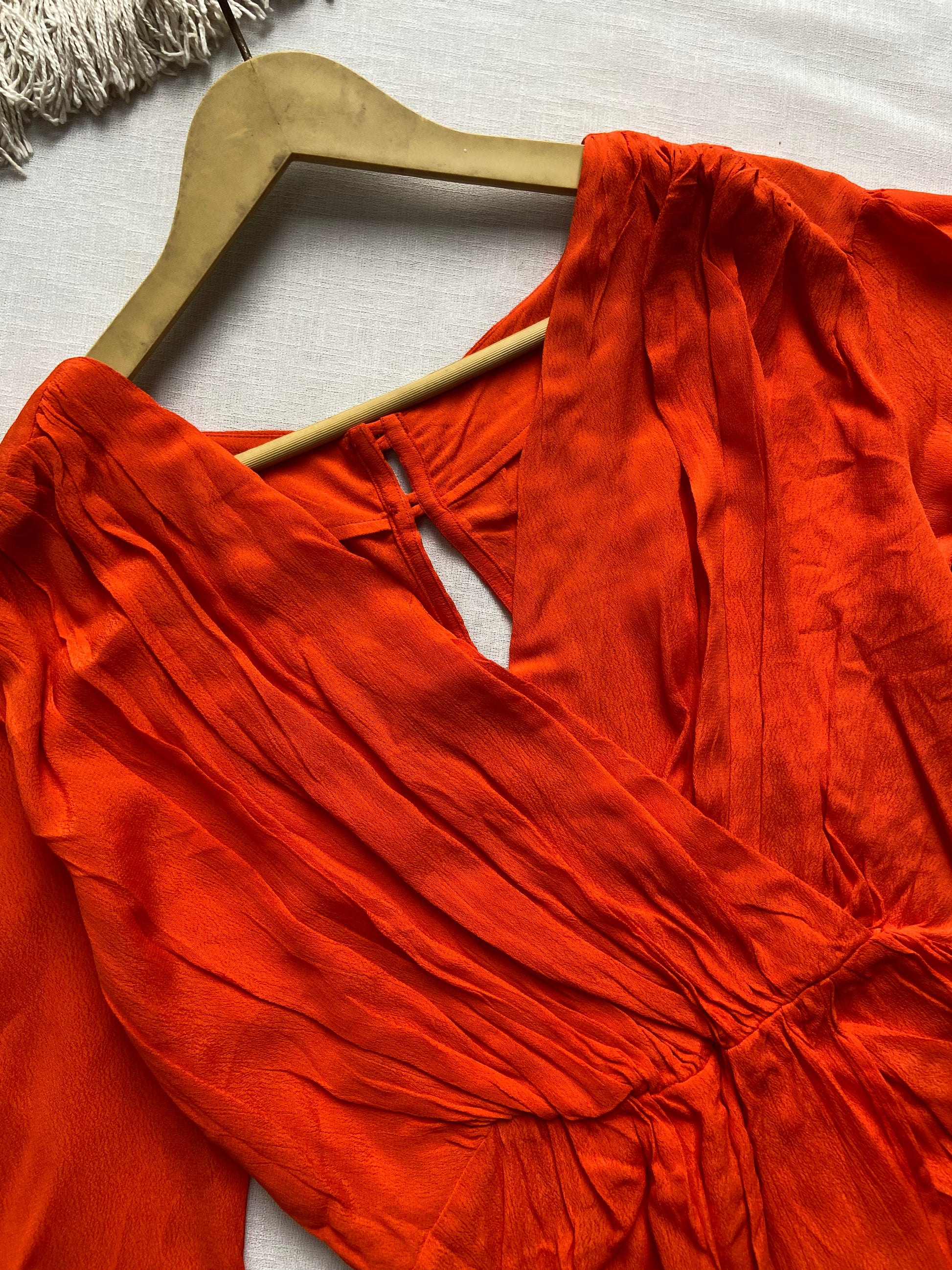 Bright Orange Draped Satin Blouse with Long Sleeves