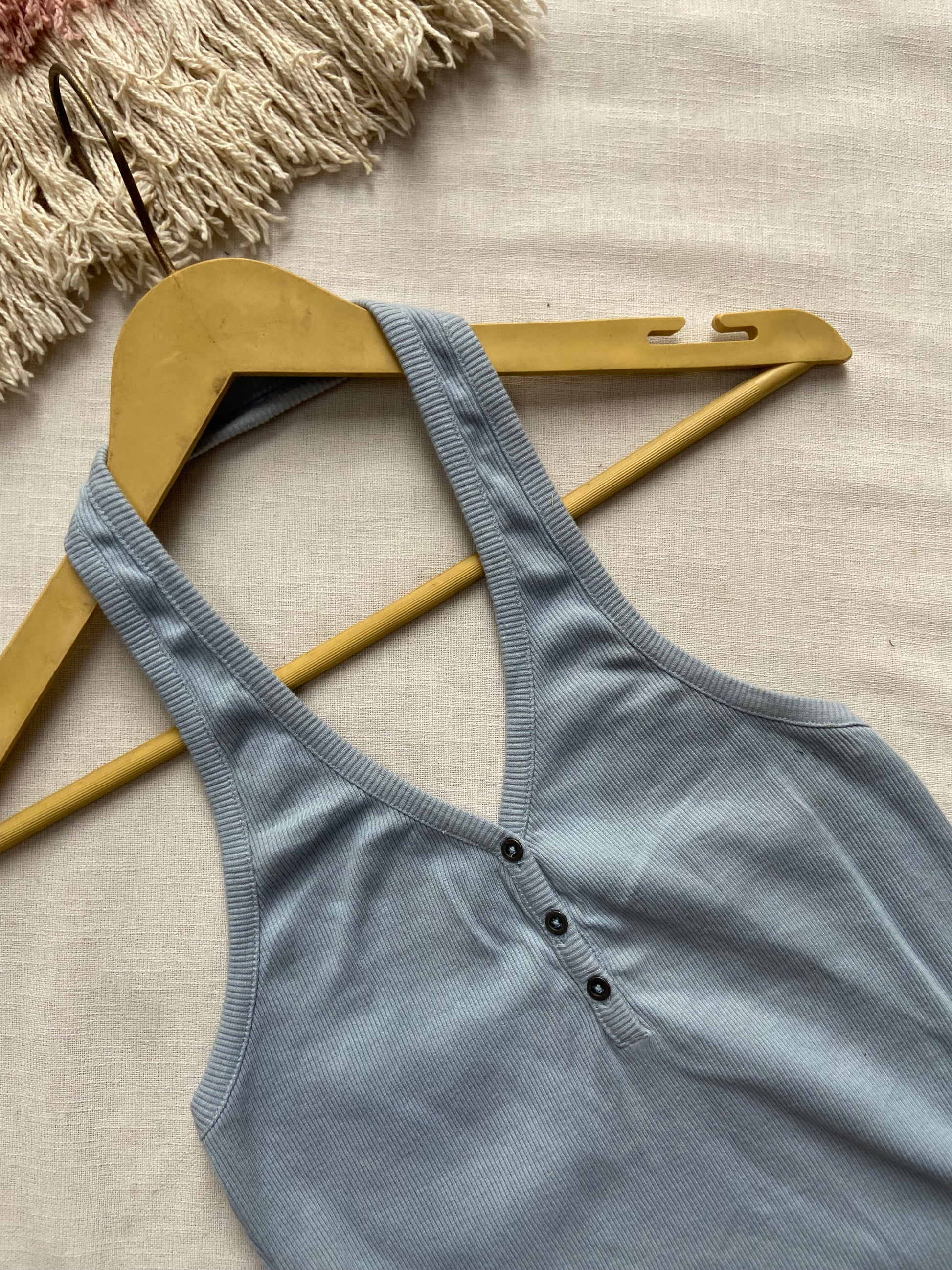 Stay cool and stylish with this sky blue halter neck crop top, crafted from soft ribbed fabric for a flattering fit. Featuring a button-front detail and a racerback design, this top is perfect for summer days, casual outings, or layering under jackets. Pair it with denim shorts or high-waisted jeans for a chic, laid-back look.