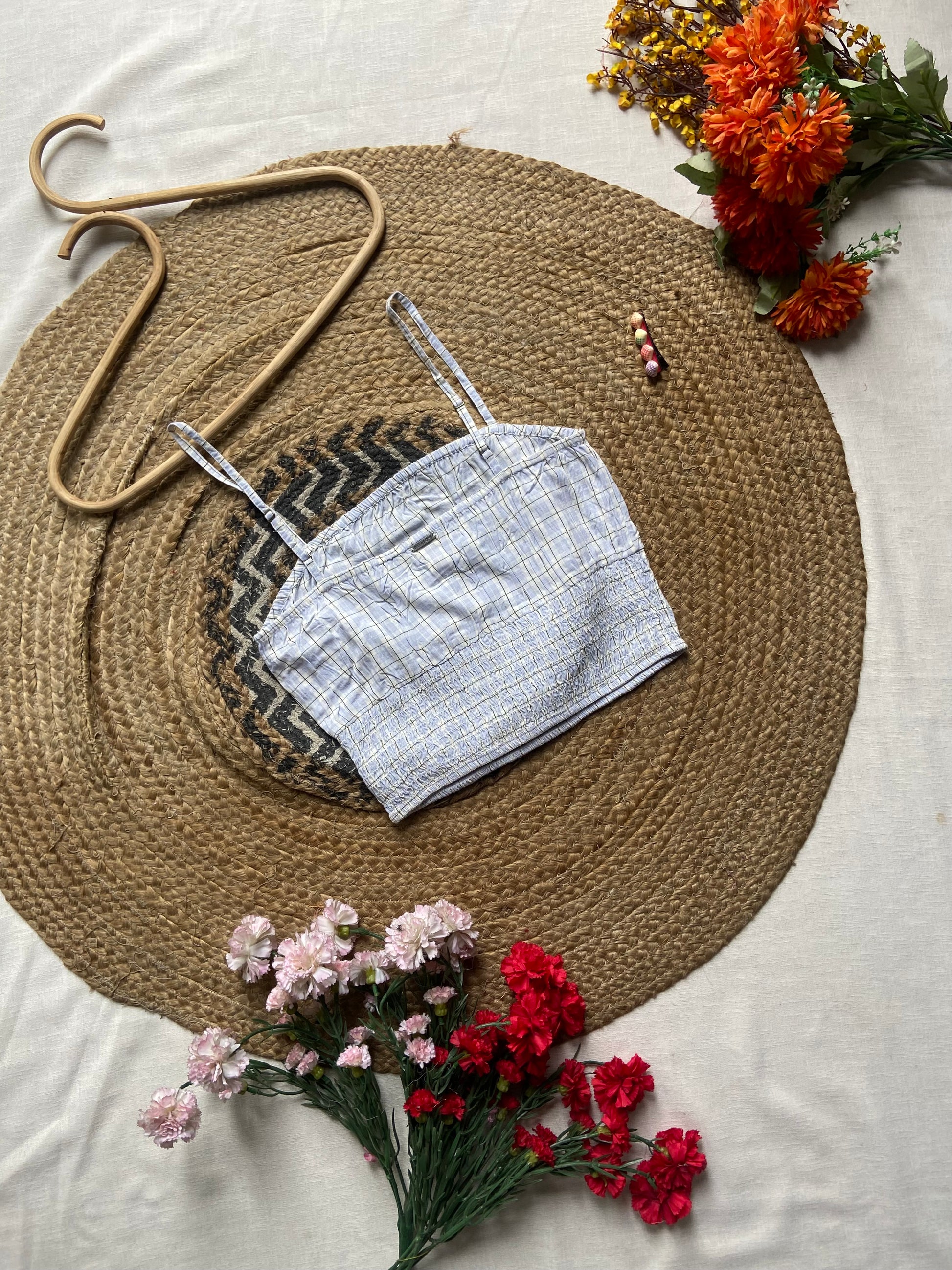 Stay cool and stylish with this lightweight blue checkered crop top, designed for everyday comfort and effortless charm. Featuring delicate spaghetti straps and a fitted silhouette, it’s the perfect pick for casual outings, brunch dates, or warm sunny days.