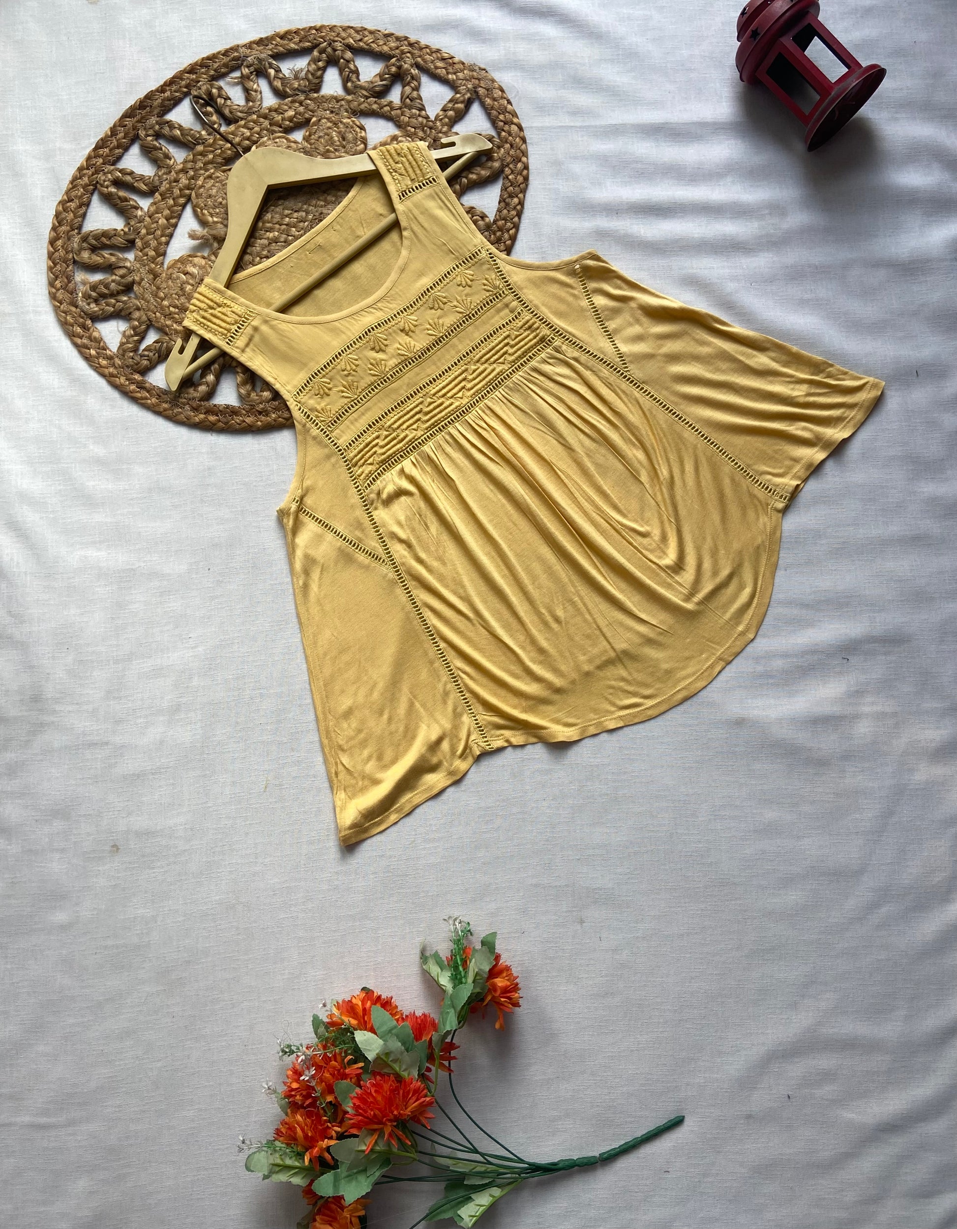 Brighten up your wardrobe with this mustard yellow sleeveless boho top for women. Featuring delicate embroidery on the front and a flowy A-line silhouette, this top combines comfort with effortless style. Crafted from soft, breathable fabric, it’s perfect for casual outings, summer wear, or layering with jackets and shrugs. Pair it with jeans, shorts, or skirts for a chic everyday look. A versatile and stylish addition to your boho-inspired collection.