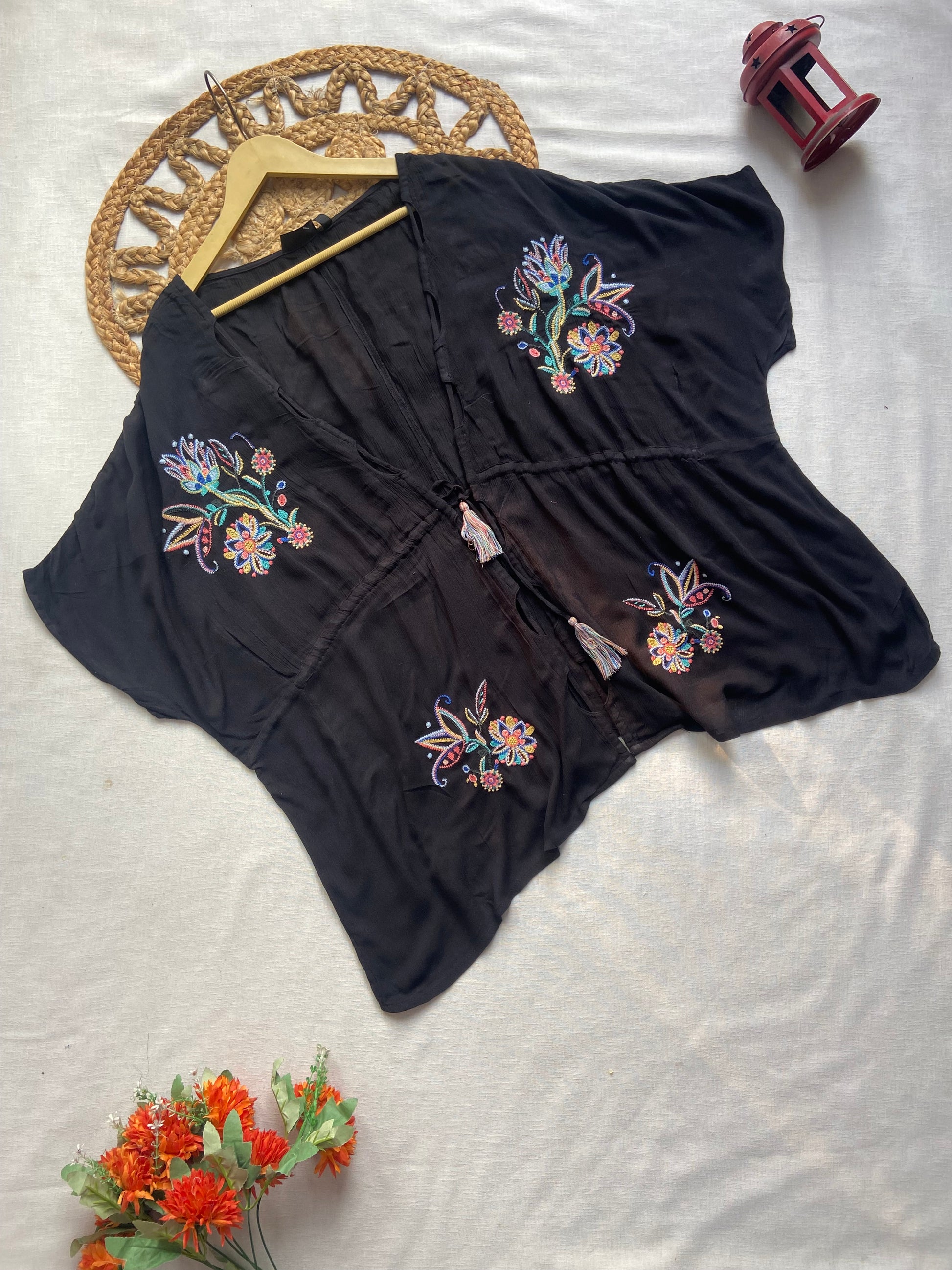 Elevate your layering game with this black embroidered kimono shrug for women. Featuring vibrant floral embroidery and a relaxed open-front design with tassel ties, this piece blends boho charm with everyday versatility. Crafted from lightweight, breathable fabric, it’s perfect for pairing with dresses, tops, or camis to add a stylish touch to casual and festive outfits. A must-have wardrobe essential for chic, effortless layering.