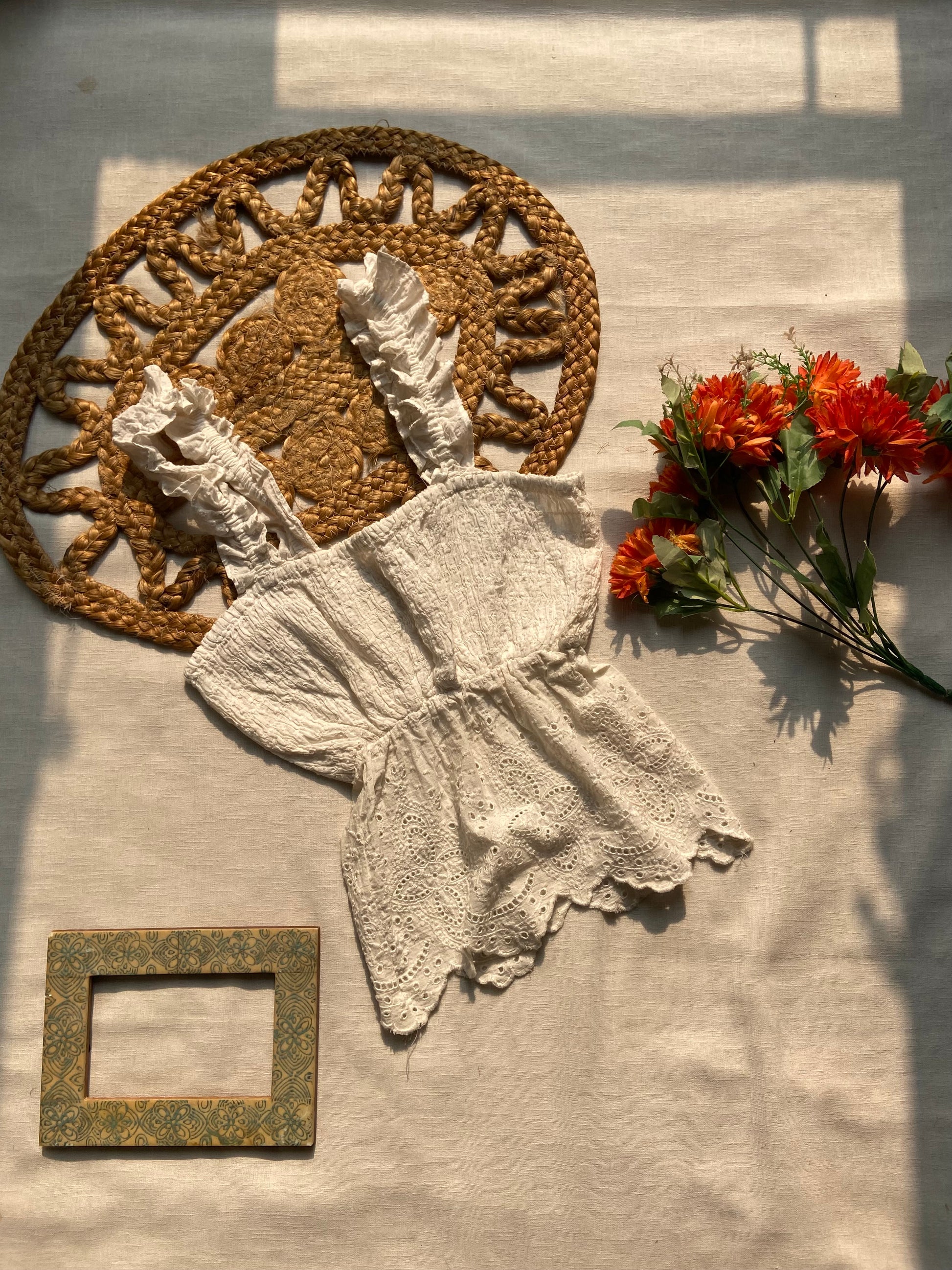 Embrace effortless elegance with this white lace ruffle strap peplum top for women. Designed with delicate eyelet lace, ruffled shoulder straps, and a flattering peplum hem, this top adds a touch of romance to your everyday style. Lightweight and breathable, it’s perfect for summer outings, brunch dates, or vacation looks. Pair it with jeans, skirts, or shorts for a chic and feminine outfit. A timeless lace peplum blouse every wardrobe needs.