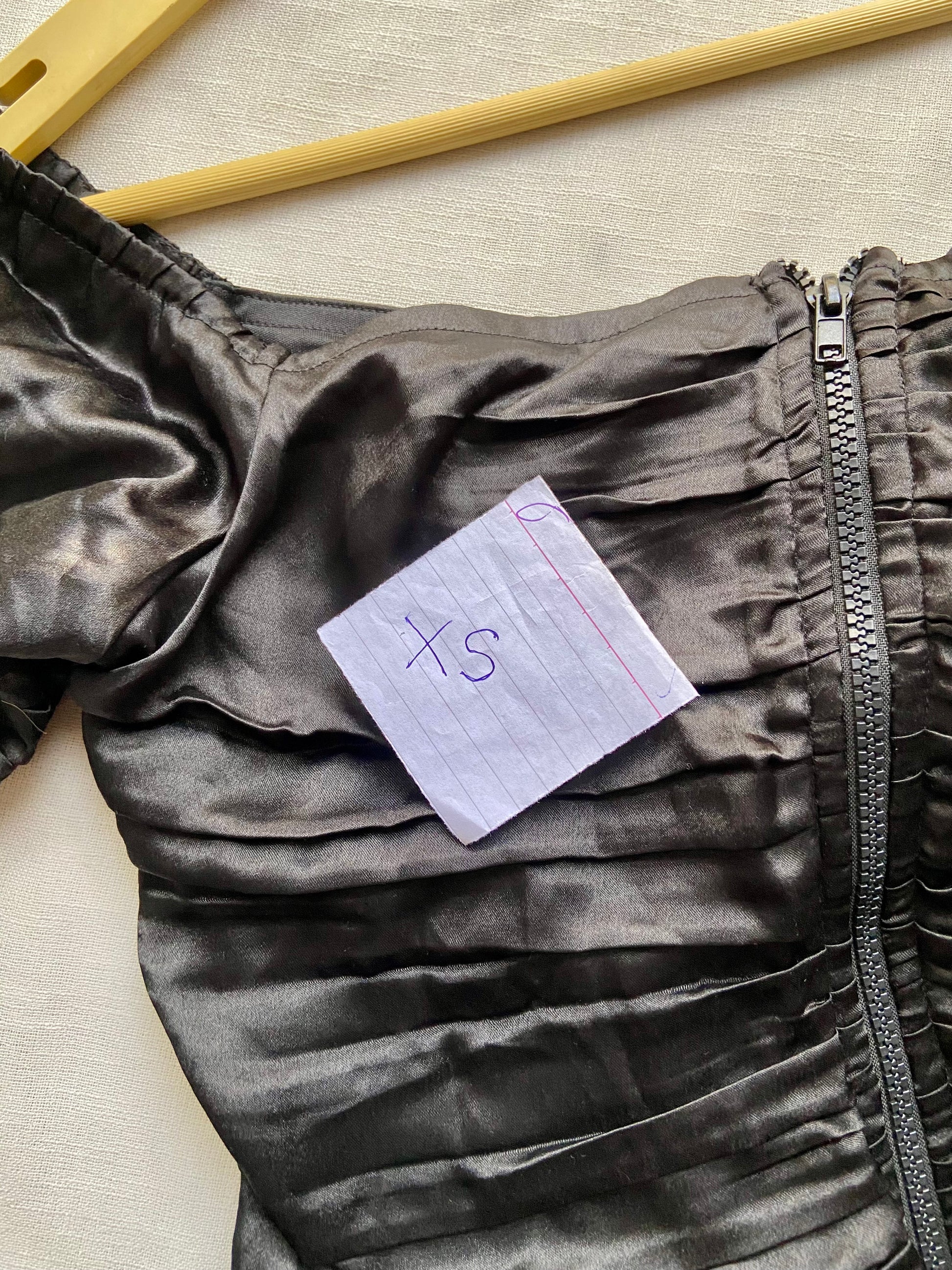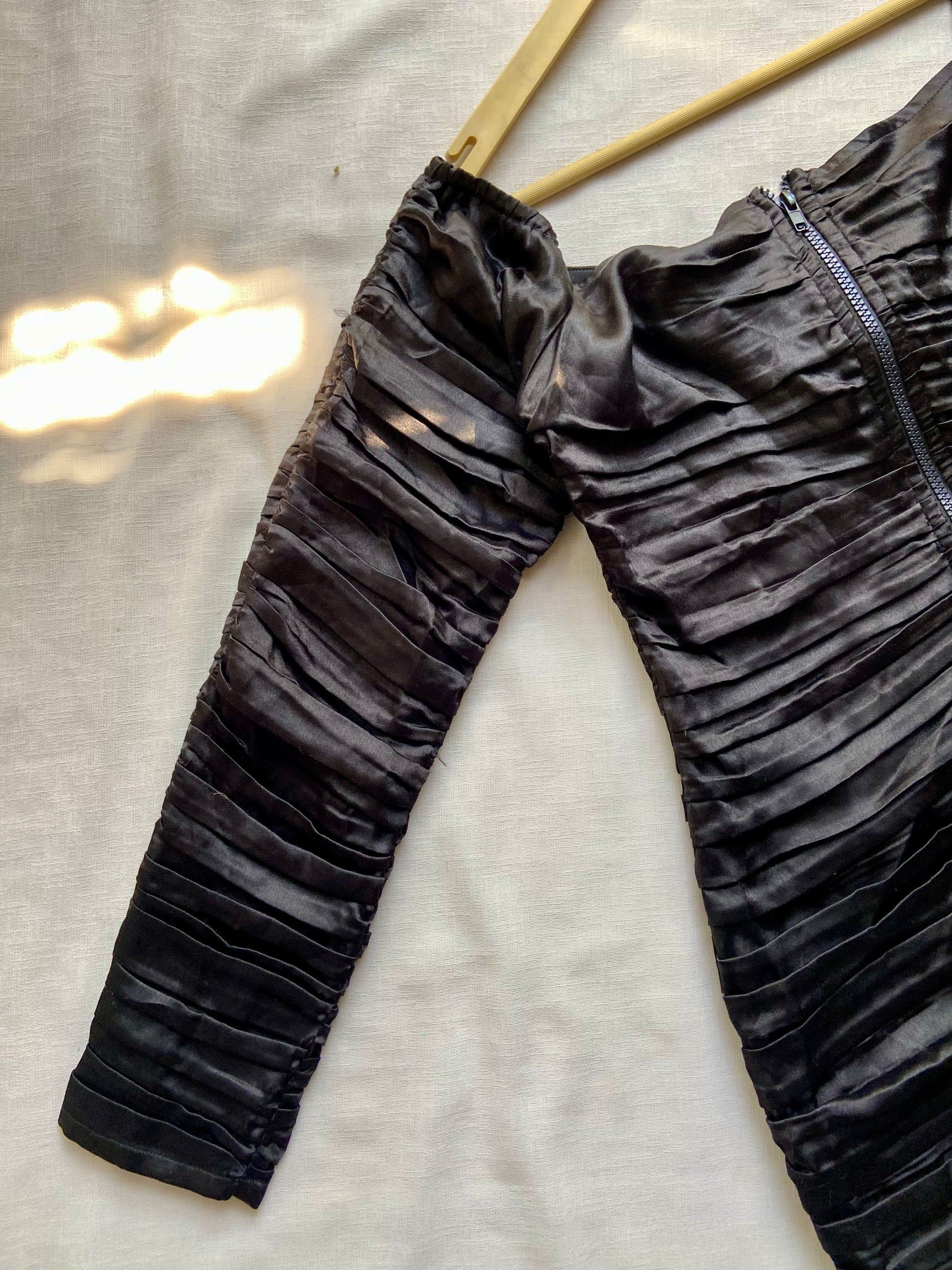 Turn heads with this stunning black bodycon dress featuring elegant ruched detailing throughout. The off-shoulder design adds a touch of glamour, while the front zipper offers a bold, modern edge. Crafted from a glossy, stretchable fabric, this dress hugs your curves perfectly—ideal for parties, date nights, or evening events. Style it with heels and minimal accessories for a sleek, sophisticated look.