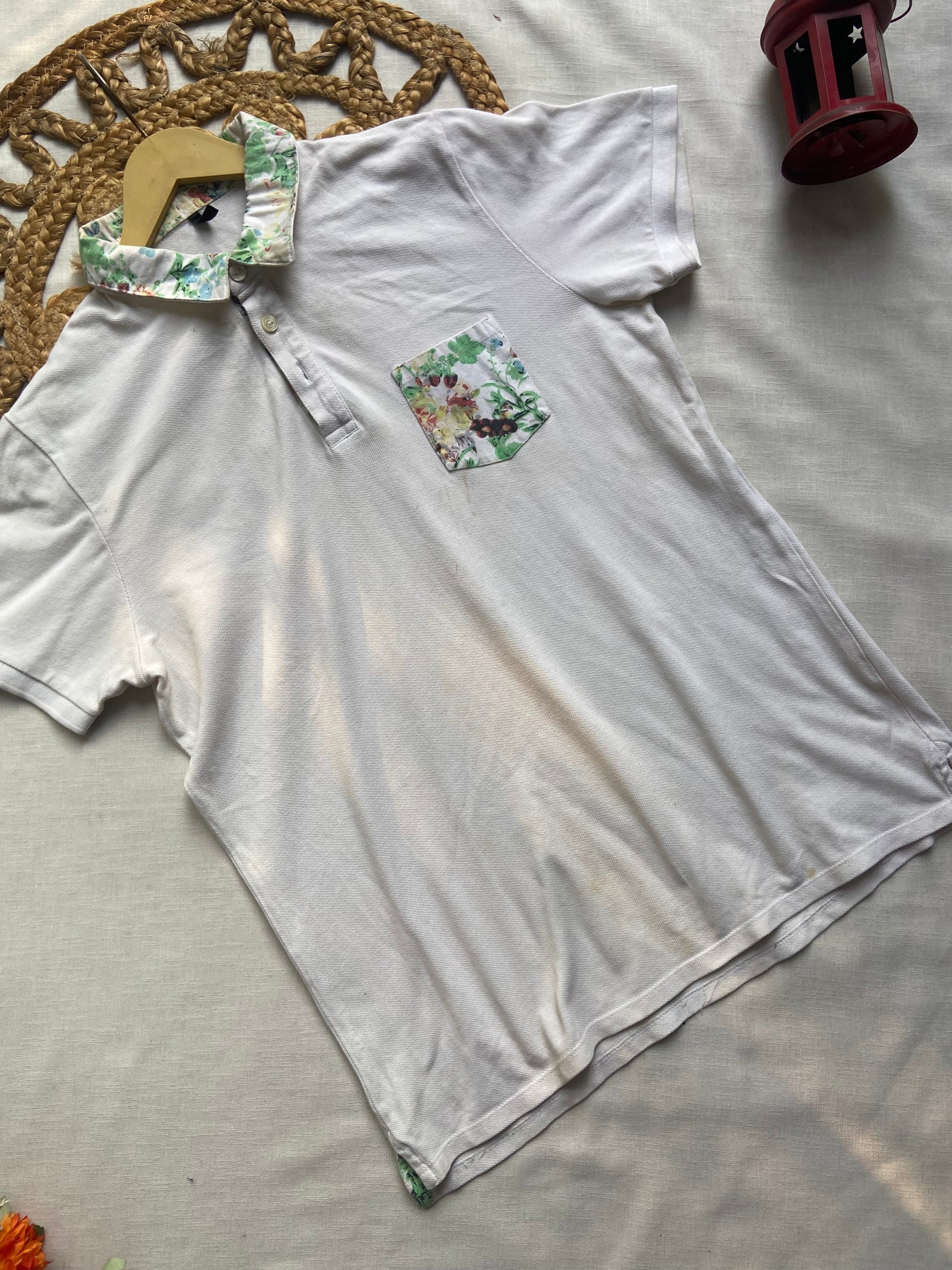 Men's White Polo T-Shirt with Floral Collar & Pocket