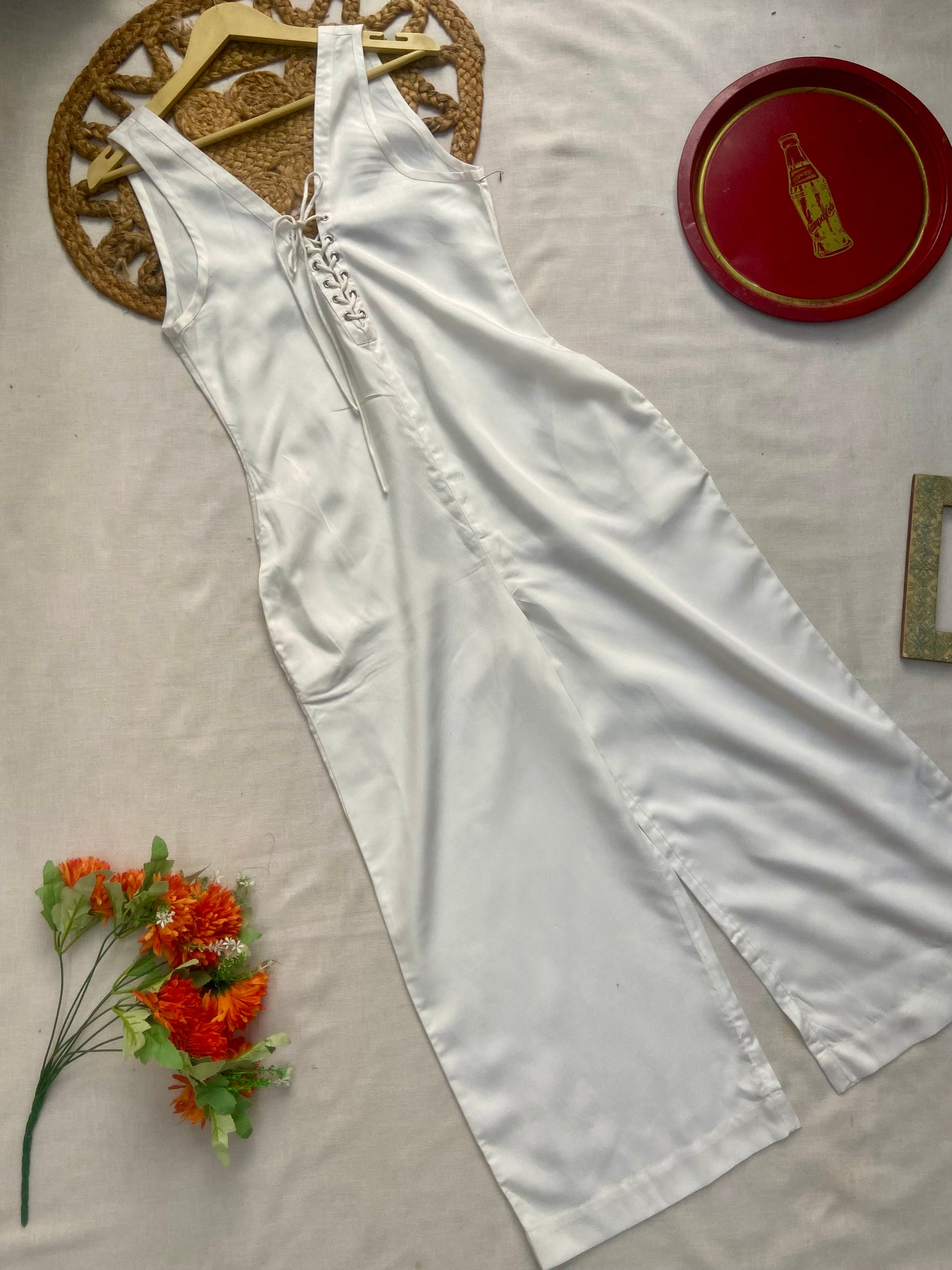 Elevate your style with this white sleeveless lace-up jumpsuit for women, designed for both comfort and elegance. Featuring a chic V-neckline, adjustable lace-up front detail, and wide-leg silhouette, this jumpsuit offers a flattering fit for casual outings, parties, or holiday wear. Crafted from soft, breathable fabric, it ensures all-day comfort while keeping you effortlessly stylish. Pair it with heels or sandals for a versatile, fashion-forward look.