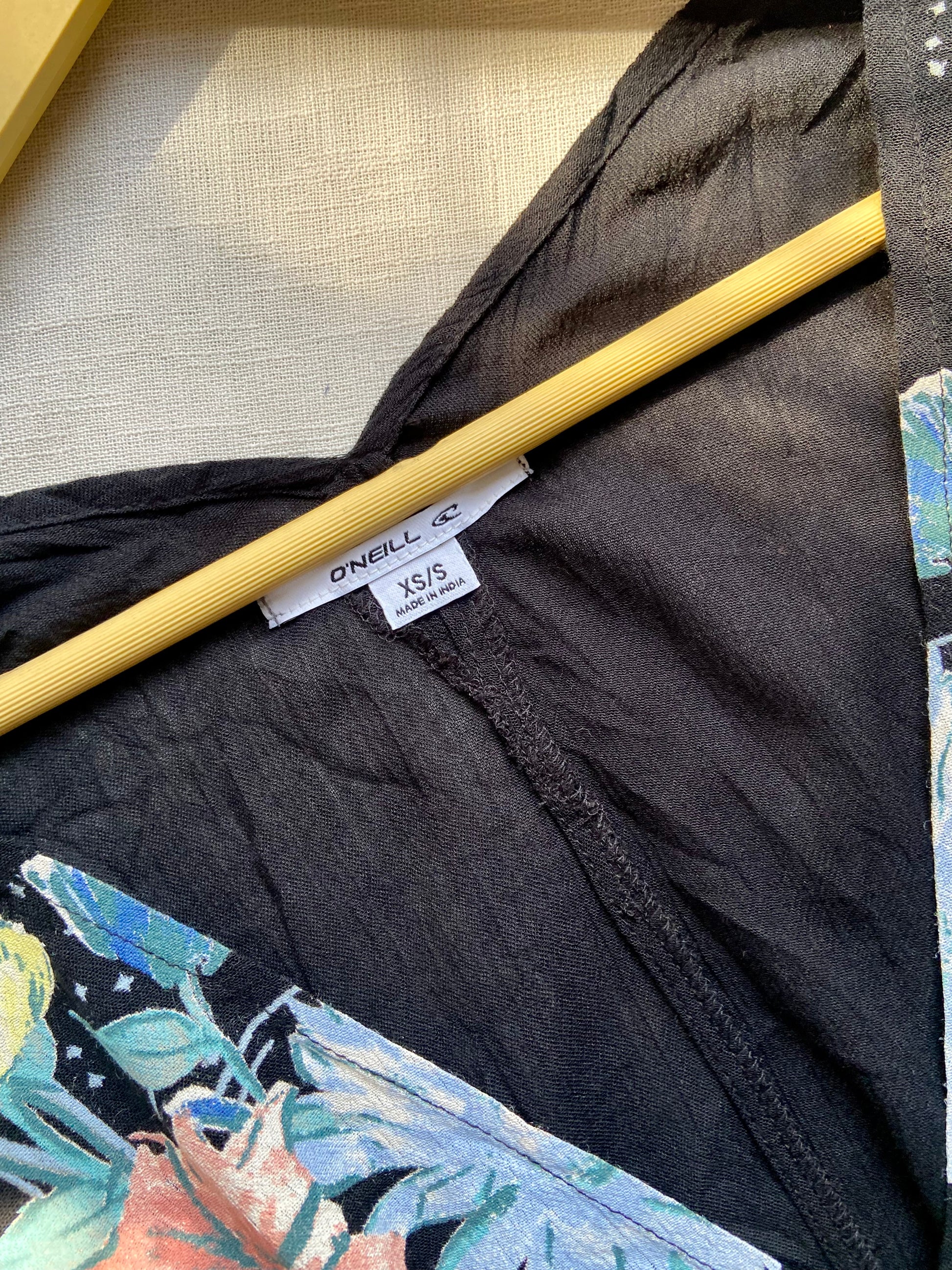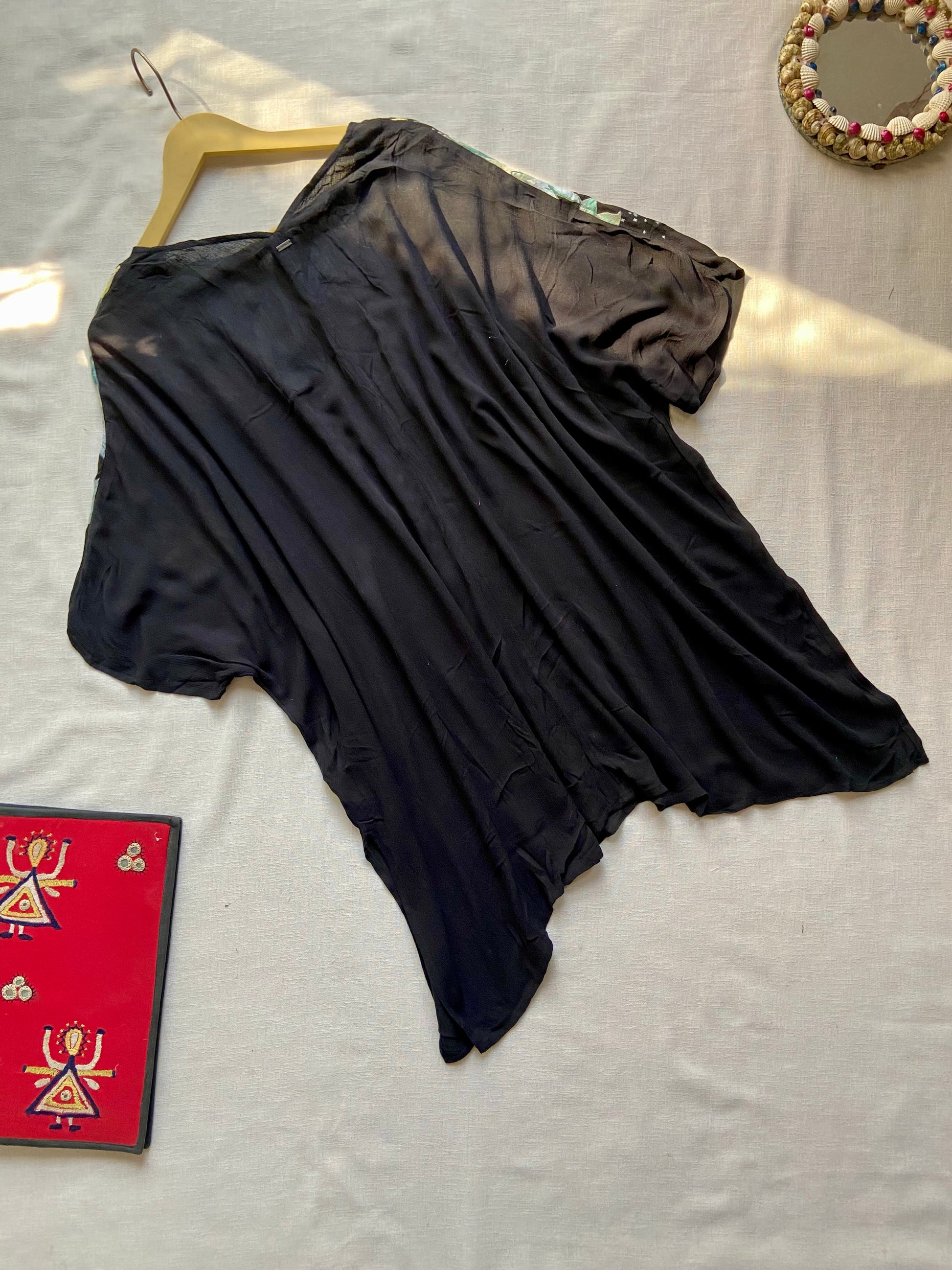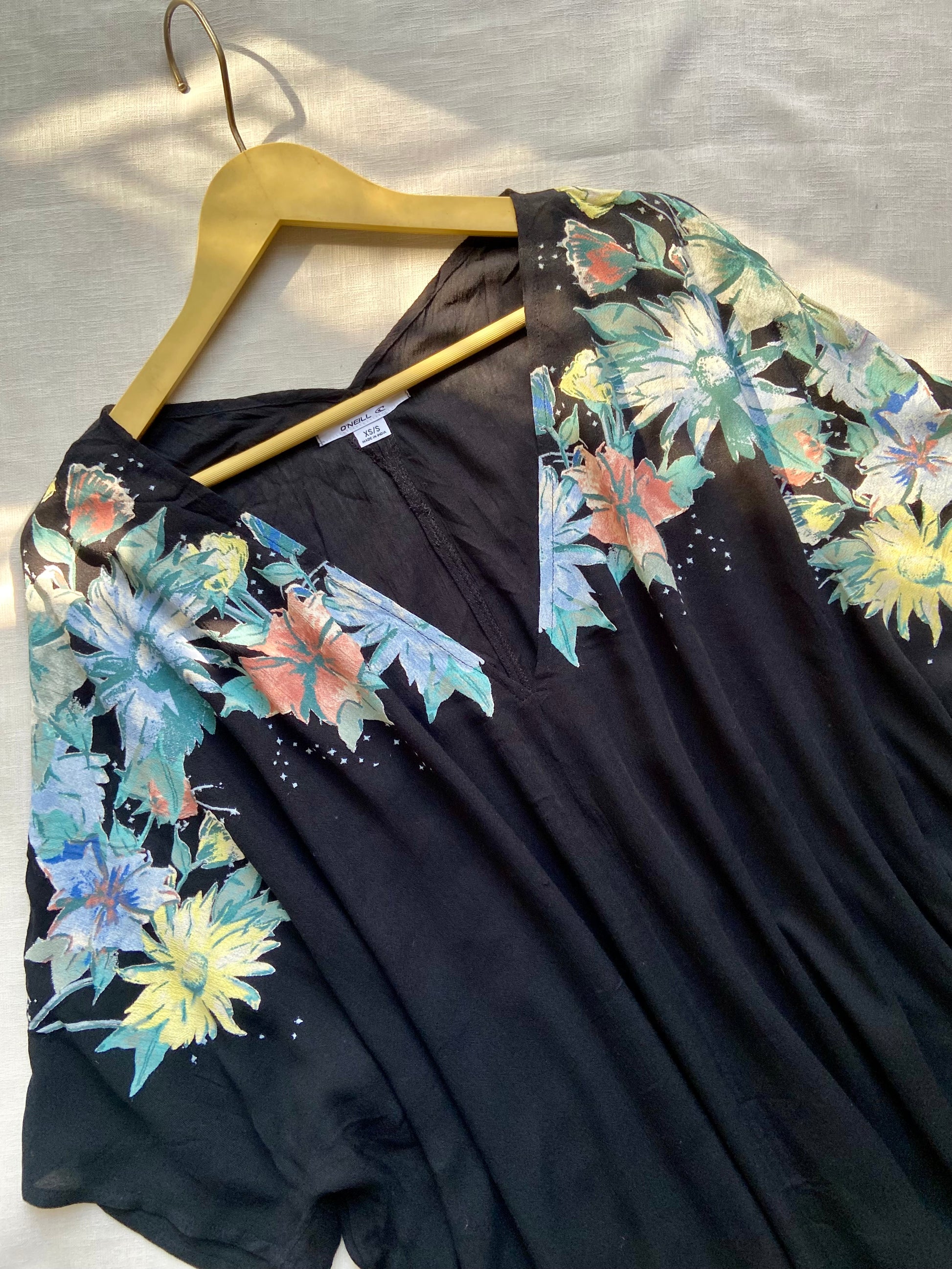 This breezy black kaftan top features a vibrant floral print around the neckline and shoulders, adding a refreshing pop of color. Made from lightweight, flowy fabric, it offers a relaxed fit perfect for summer days, beach outings, or casual lounging. The V-neckline and loose sleeves enhance comfort while keeping the look effortlessly chic. Pair it with shorts, leggings, or swimwear for a versatile and stylish outfit.
