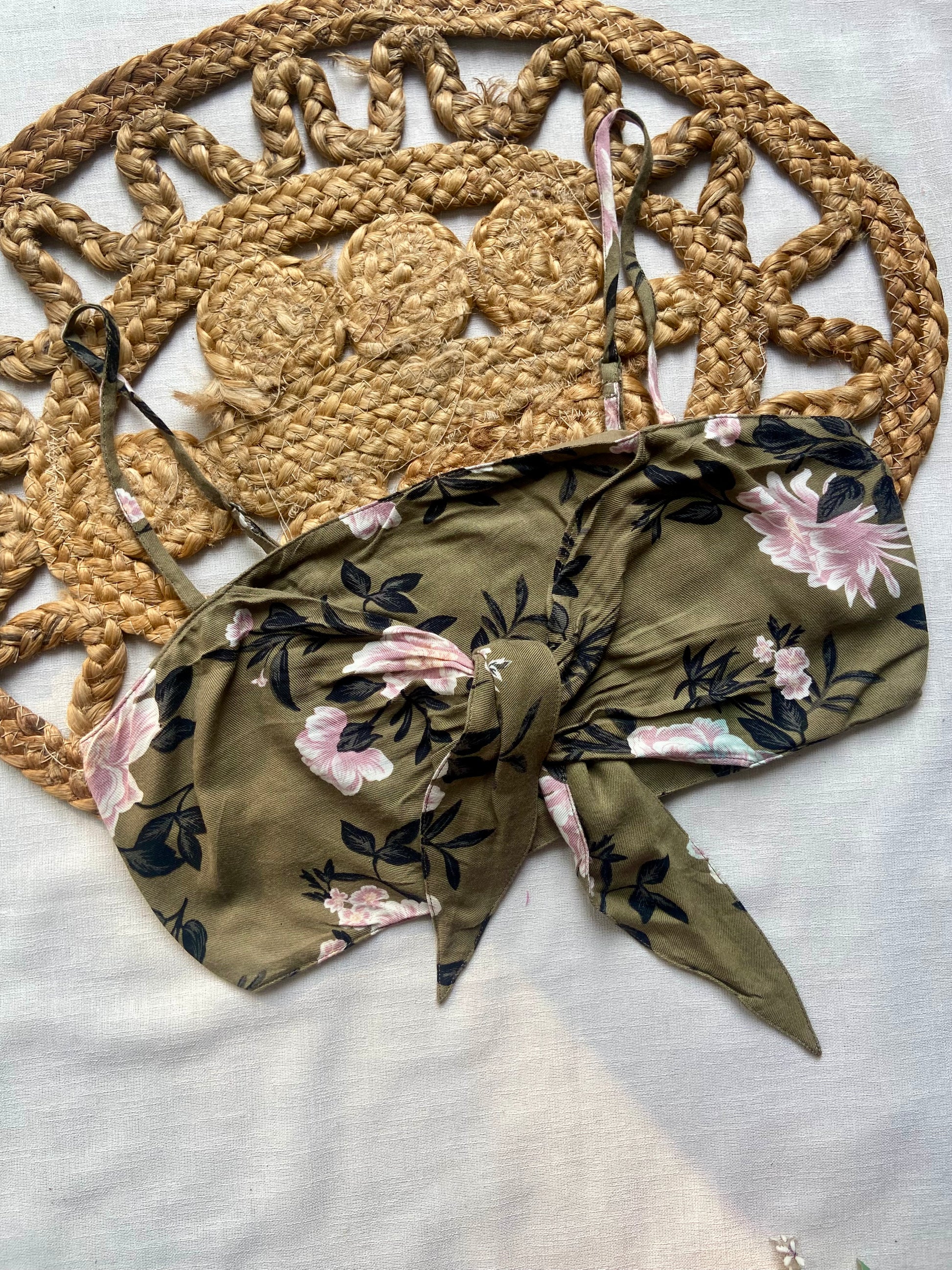 Elevate your wardrobe with this chic olive green floral knot crop top, designed with delicate straps and a front tie detail for a flattering fit. Crafted from soft, breathable fabric, this trendy crop top is perfect for summer outings, beach vacations, and casual parties. Pair it with jeans, skirts, or shorts for a versatile and fashionable look. A must-have addition for women who love comfort and style.