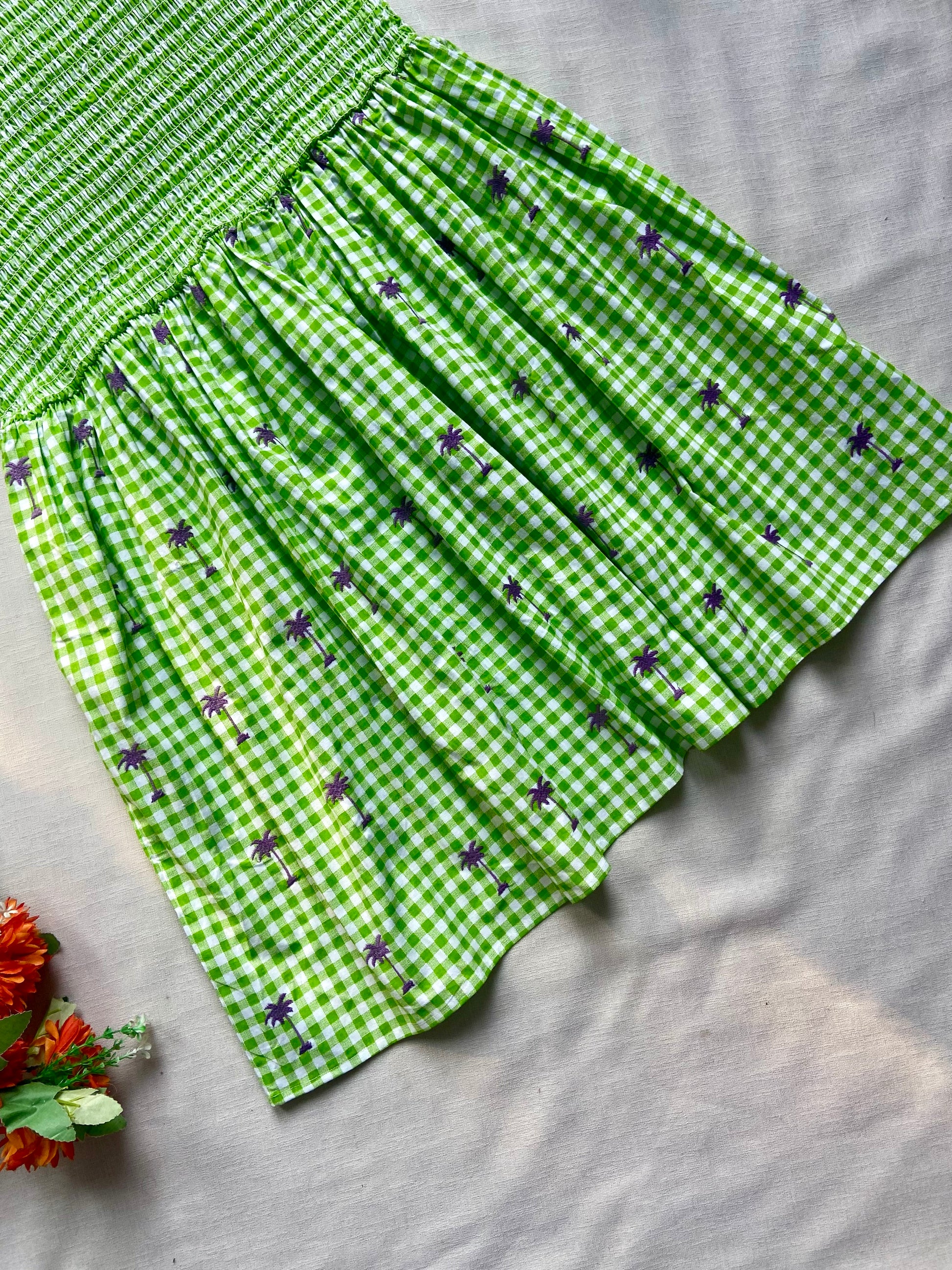 Add a fresh and stylish touch to your little one’s wardrobe with this girls green one shoulder gingham dress. Designed with a trendy asymmetrical neckline and soft, breathable fabric, this dress ensures all-day comfort. The classic green gingham checks combined with delicate purple floral prints create a playful yet chic look, perfect for summer outings, parties, or casual wear. Lightweight and easy to wear, this dress is a must-have for your child’s seasonal collection.