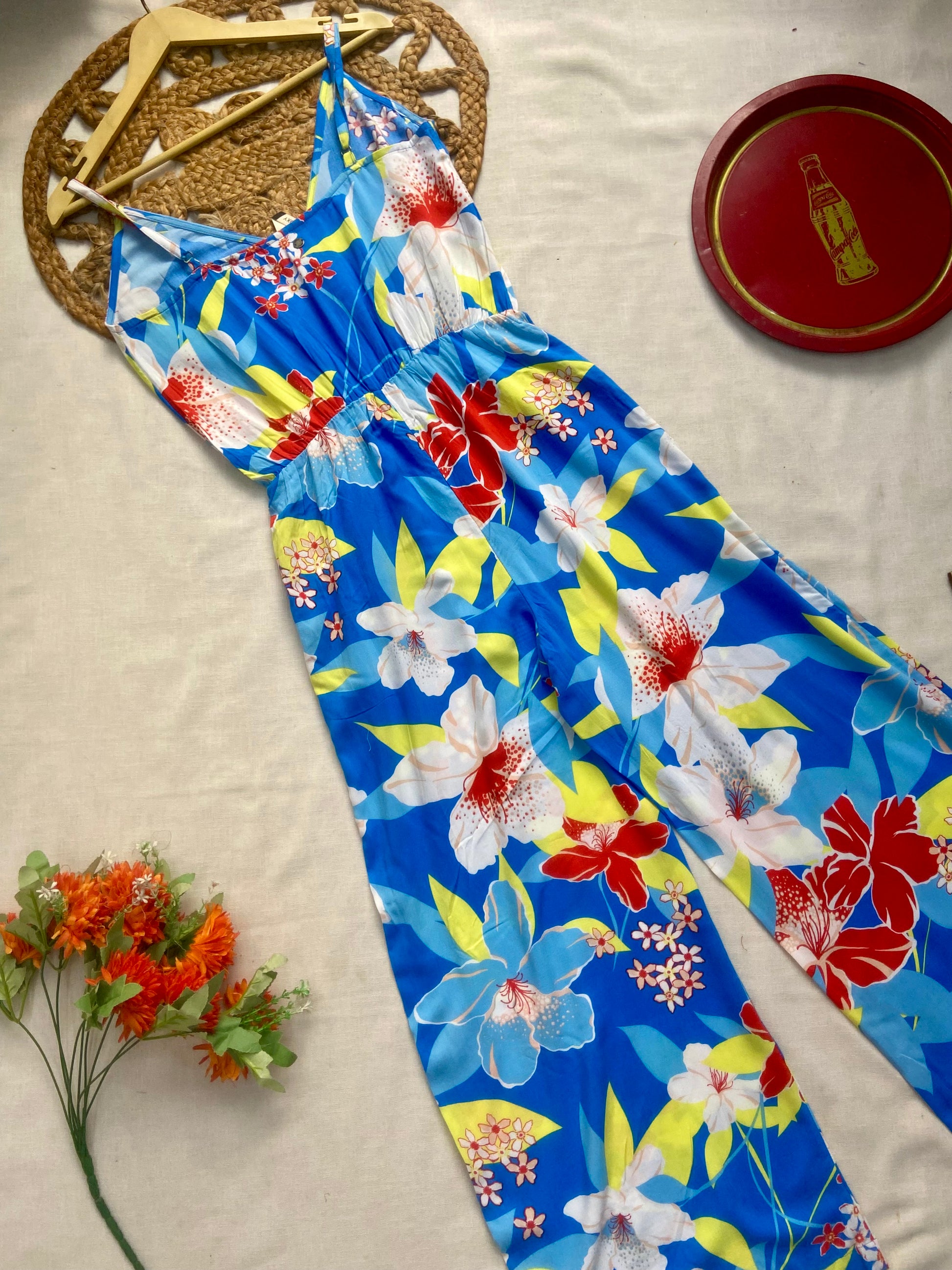 Make a bold style statement with this women’s blue floral jumpsuit, featuring vibrant multicolor flower prints and a flattering sleeveless design. Crafted from lightweight, breathable fabric with an elastic waist for added comfort, this jumpsuit is perfect for summer outings, beach vacations, brunch dates, or casual evenings. Pair it with sandals or wedges to achieve a chic and effortless look.