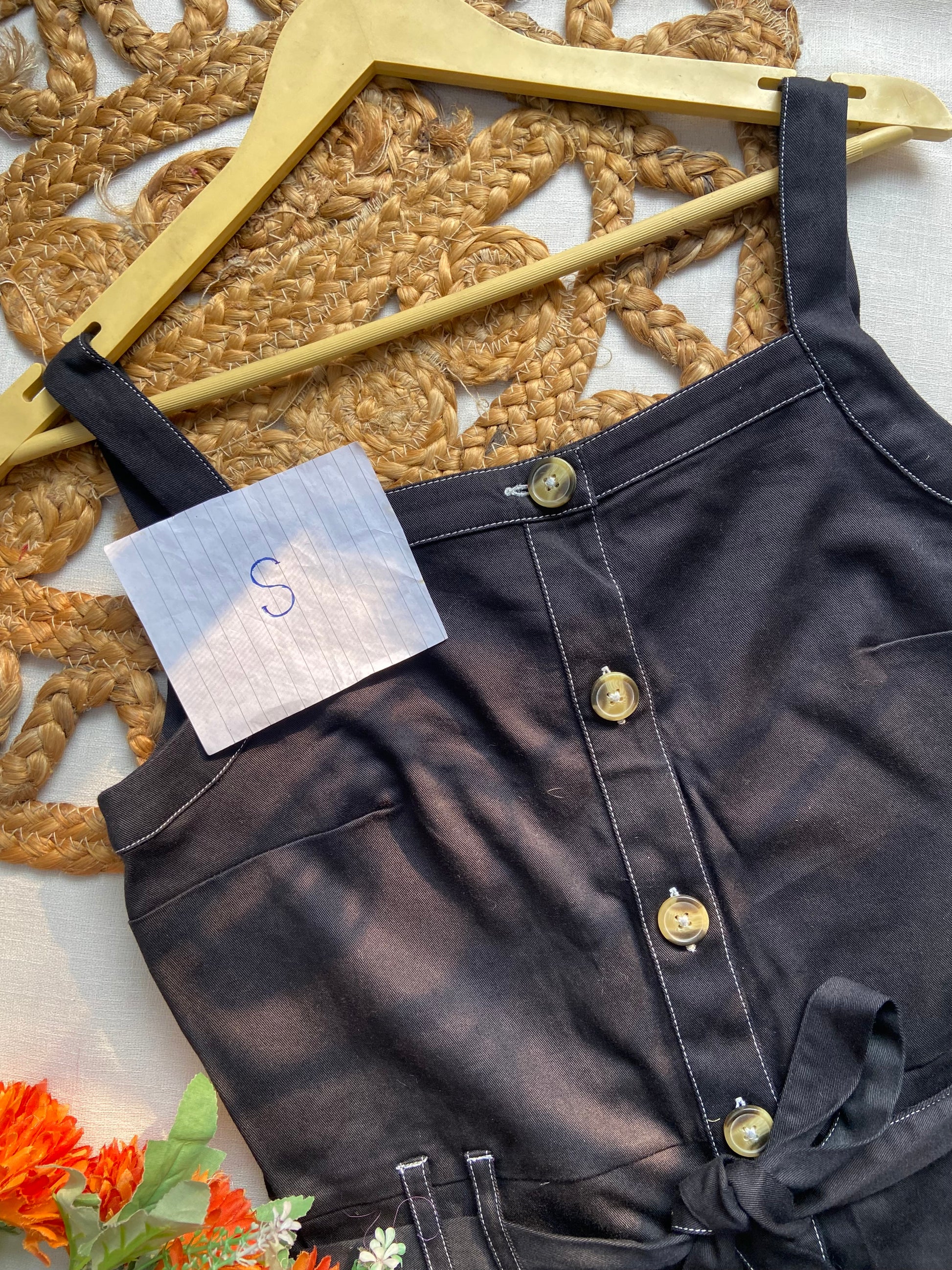 Upgrade your wardrobe with this stylish black sleeveless button-down jumpsuit for women. Designed with wide shoulder straps, front button detailing, and a waist tie belt, it offers a flattering fit and modern appeal. Crafted from soft, breathable fabric, this jumpsuit is perfect for casual outings, office wear, or evening dinners. Pair it with sneakers for a relaxed look or heels for a chic statement. A versatile and timeless piece every woman needs in her collection.