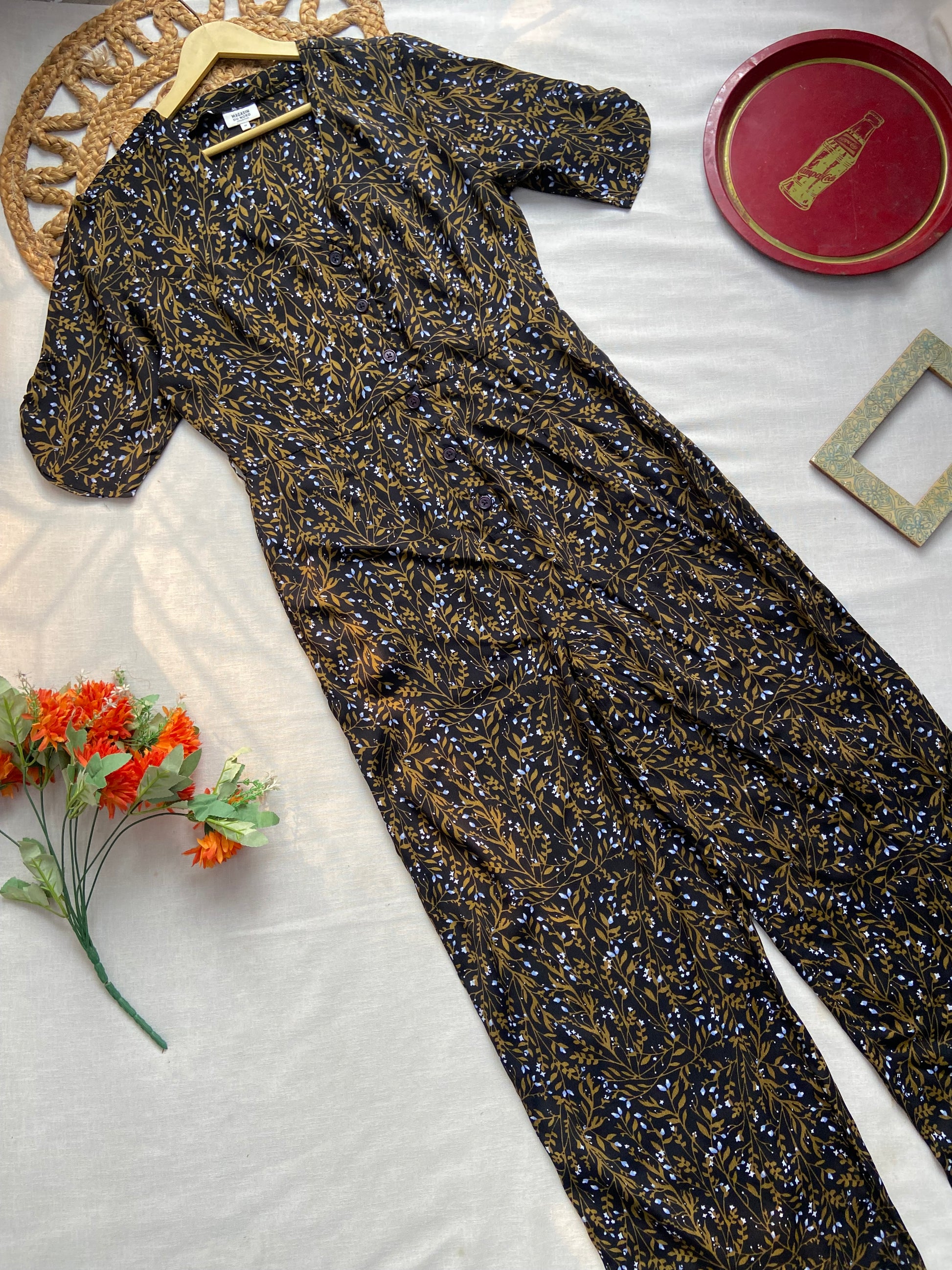 Upgrade your wardrobe with this chic black floral printed jumpsuit for women. Designed with a flattering V-neckline, half sleeves, and a button-down front, this jumpsuit offers both comfort and elegance. The relaxed fit and lightweight fabric make it ideal for casual outings, office wear, or evening get-togethers. The all-over floral print adds a stylish touch, making it a versatile piece for every occasion.