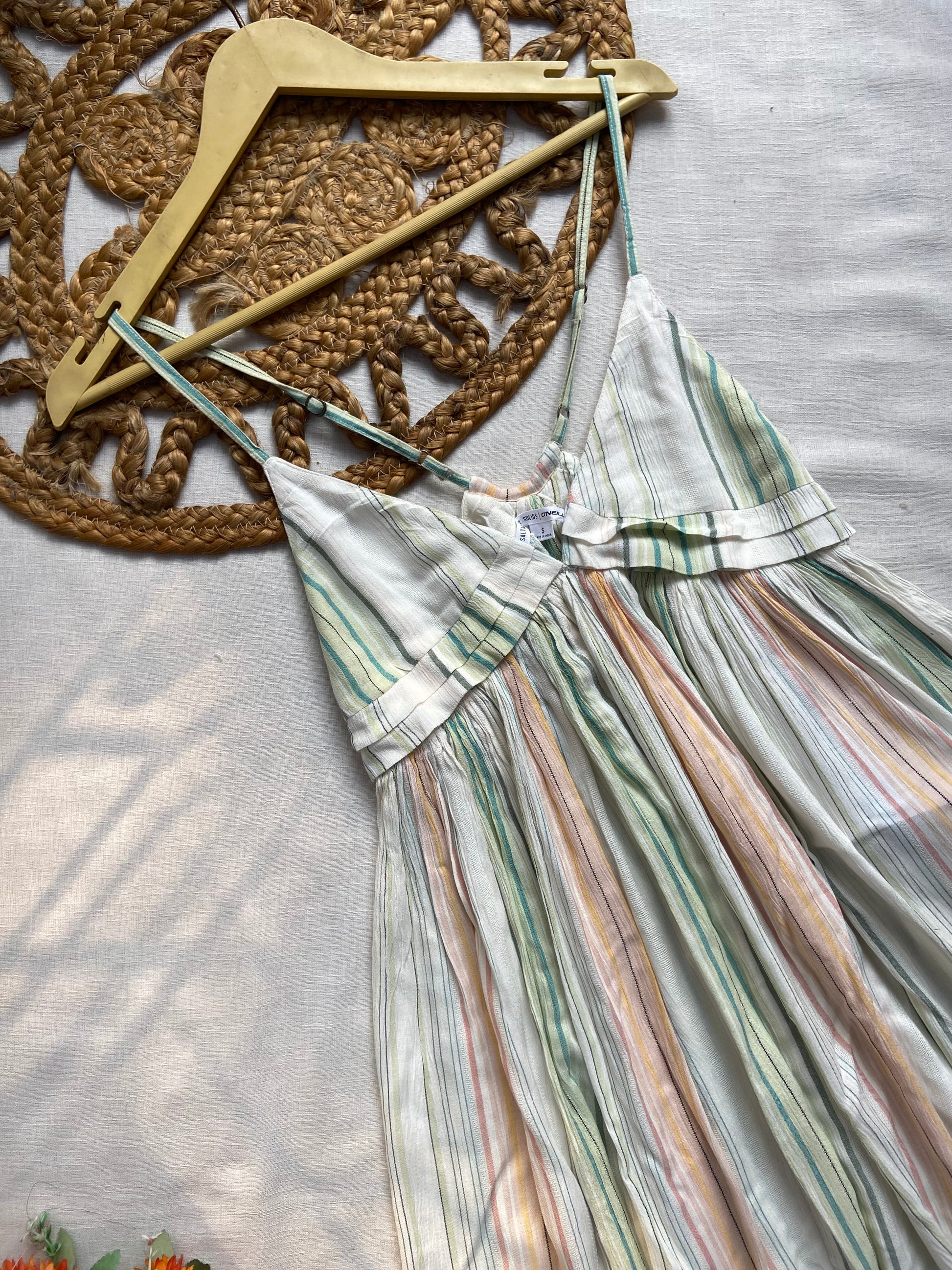 Stay cool and stylish with this striped spaghetti strap summer dress for women. Designed with a flattering V-neckline, adjustable thin straps, and a flowy A-line silhouette, it offers both comfort and elegance. The pastel multicolor stripes add a fresh, youthful vibe, making it perfect for beach outings, casual brunches, or vacation wear. Crafted from lightweight fabric, this dress is an ideal choice for warm sunny days.