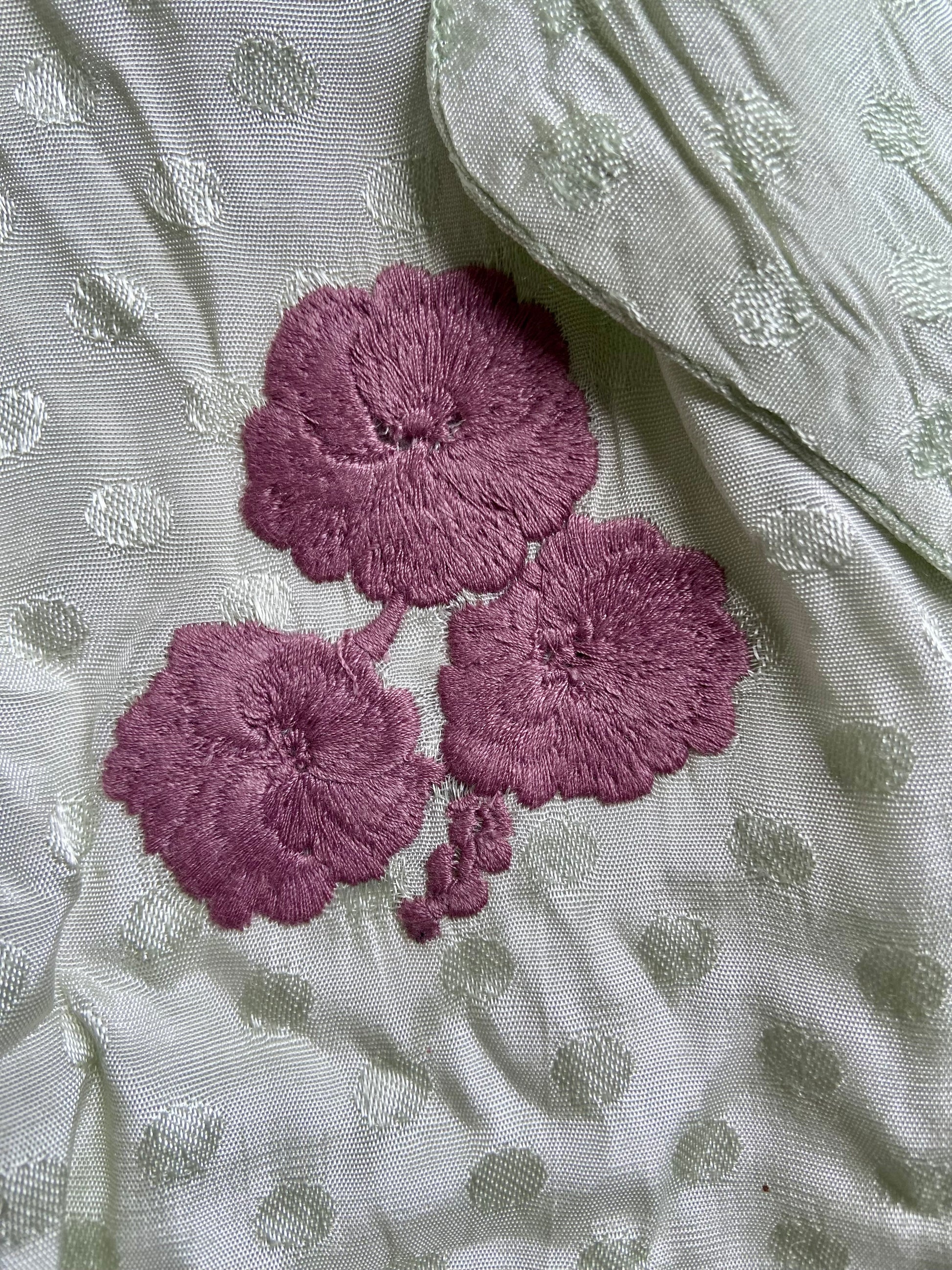 Sleep in style with this elegant mint green satin nightwear set, featuring a subtle polka dot pattern and delicate ruffle details. The set includes a short-sleeved button-down top with a collar and matching high-waisted shorts with a tie-up belt. Soft, smooth, and lightweight, it offers ultimate comfort for a cozy night in. The purple floral embroidery adds a charming feminine touch.