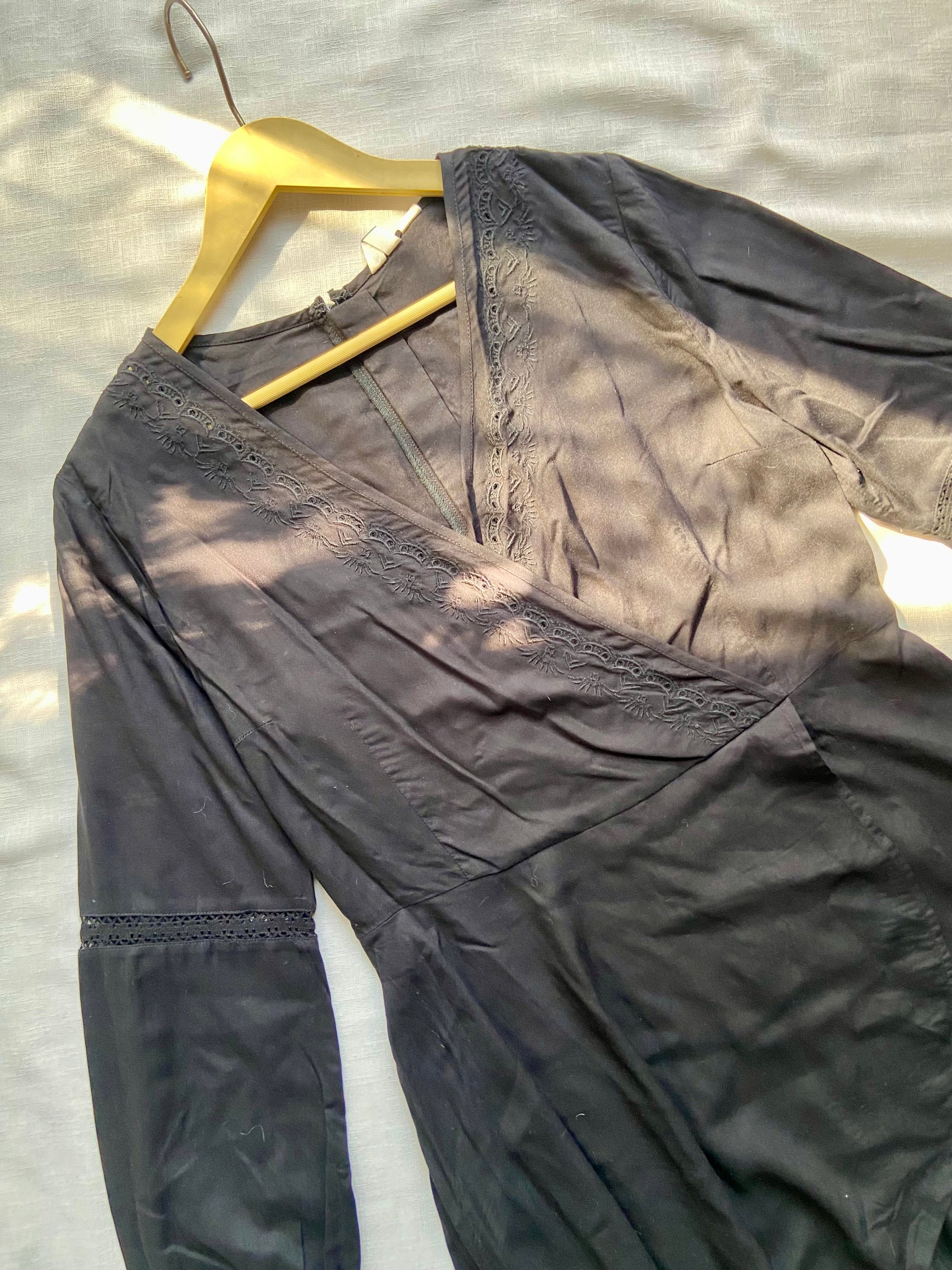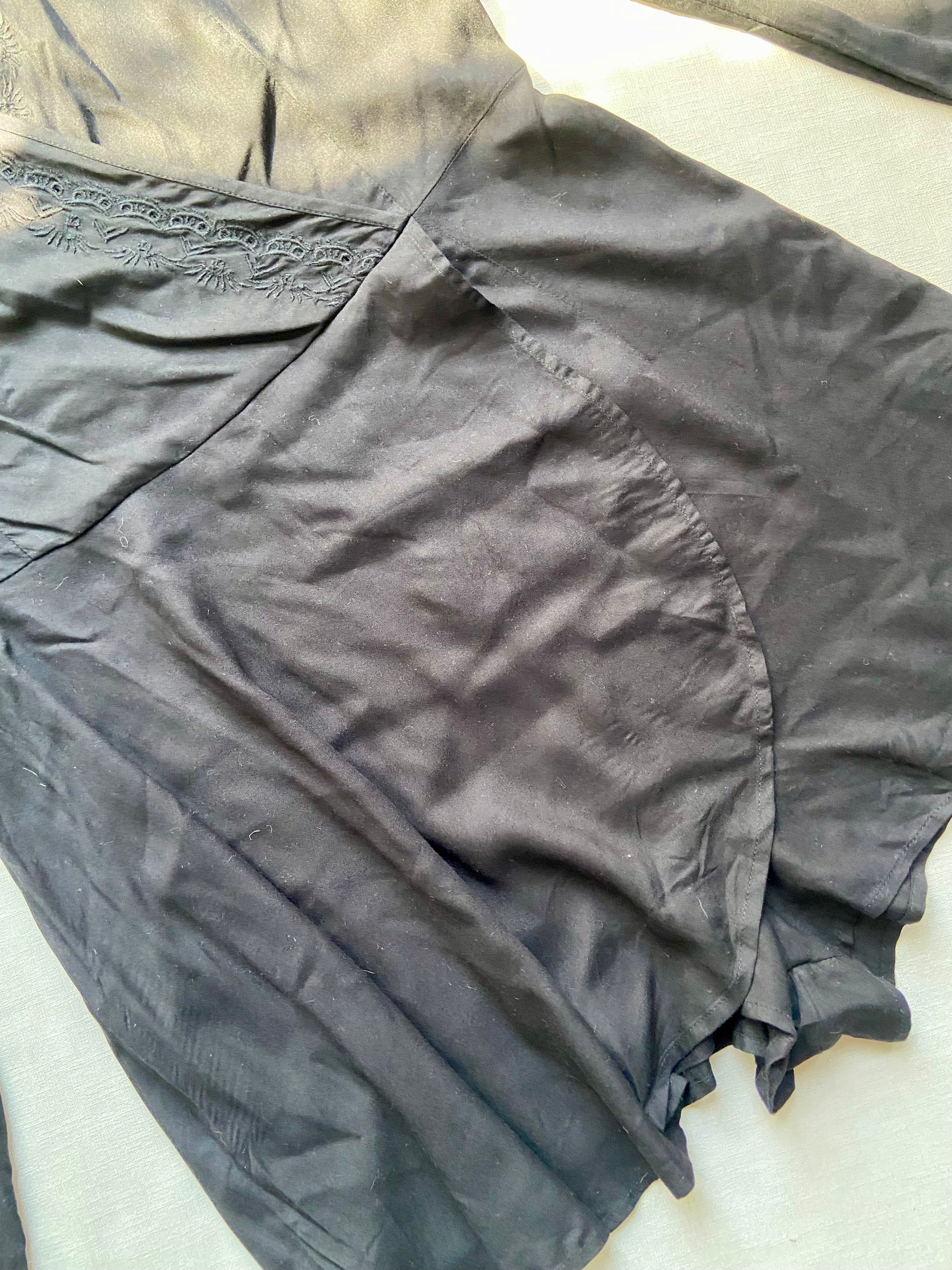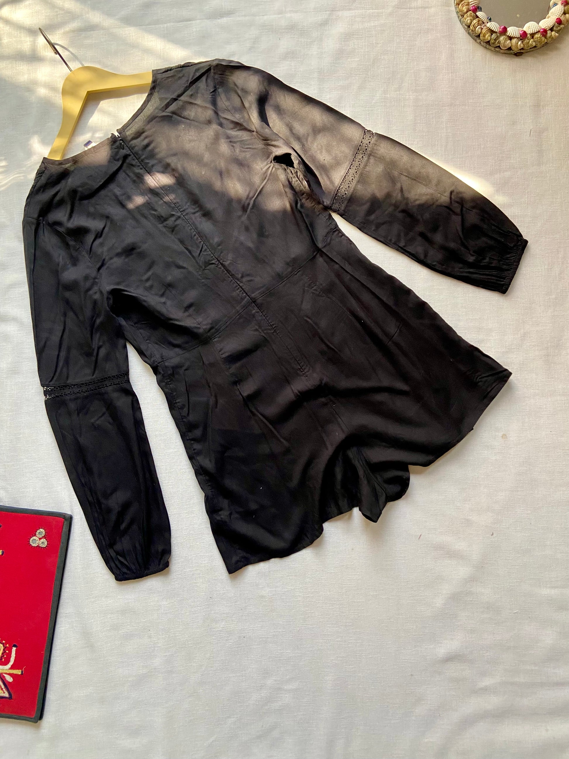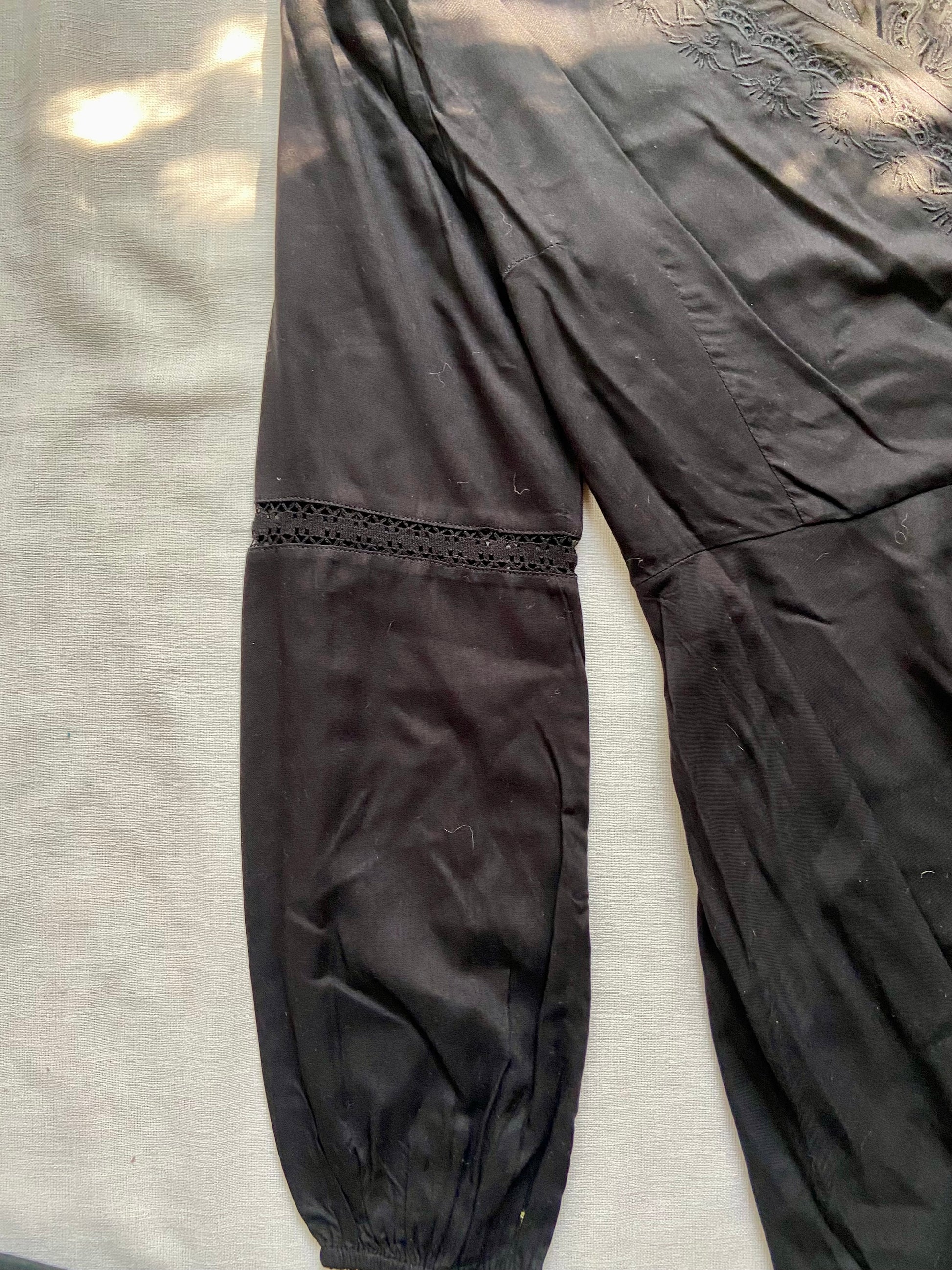 This elegant black romper features a flattering V-neckline with delicate lace detailing, full sleeves with subtle gathering at the cuffs, and a comfortable wrap-style design. Made from soft, breathable fabric, it's perfect for both casual outings and semi-formal occasions. The attached inner shorts ensure ease of movement and a secure fit. Style it with statement accessories or keep it minimal for a timeless, chic look.