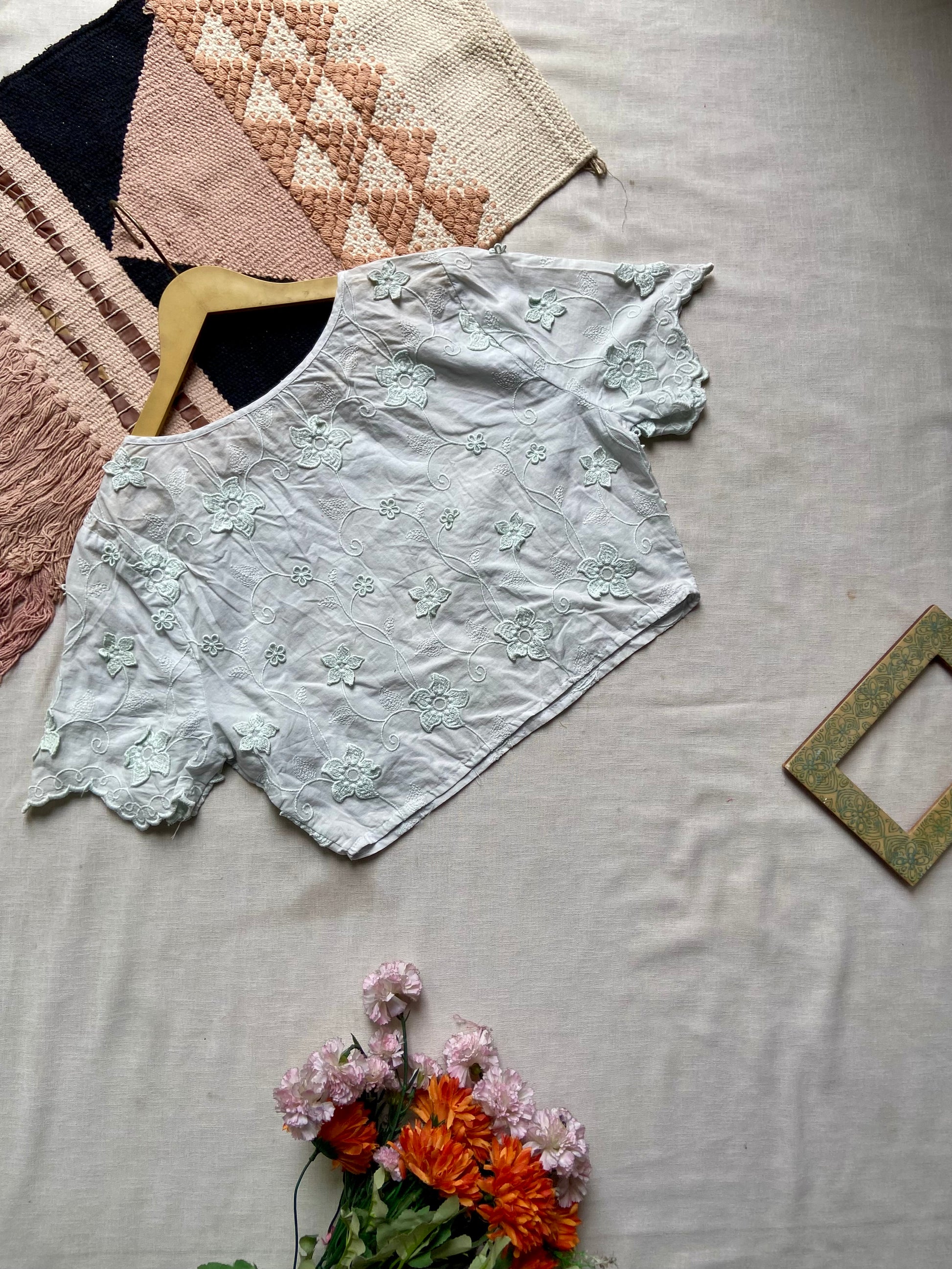Elevate your wardrobe with this elegant white crop top featuring delicate floral embroidery and intricate threadwork. Designed with short scalloped sleeves and a flattering boat neckline, this top is perfect for festive occasions, casual outings, or summer events. Crafted from soft, breathable fabric, it pairs beautifully with high-waisted skirts, jeans, or ethnic wear for a chic, versatile look.